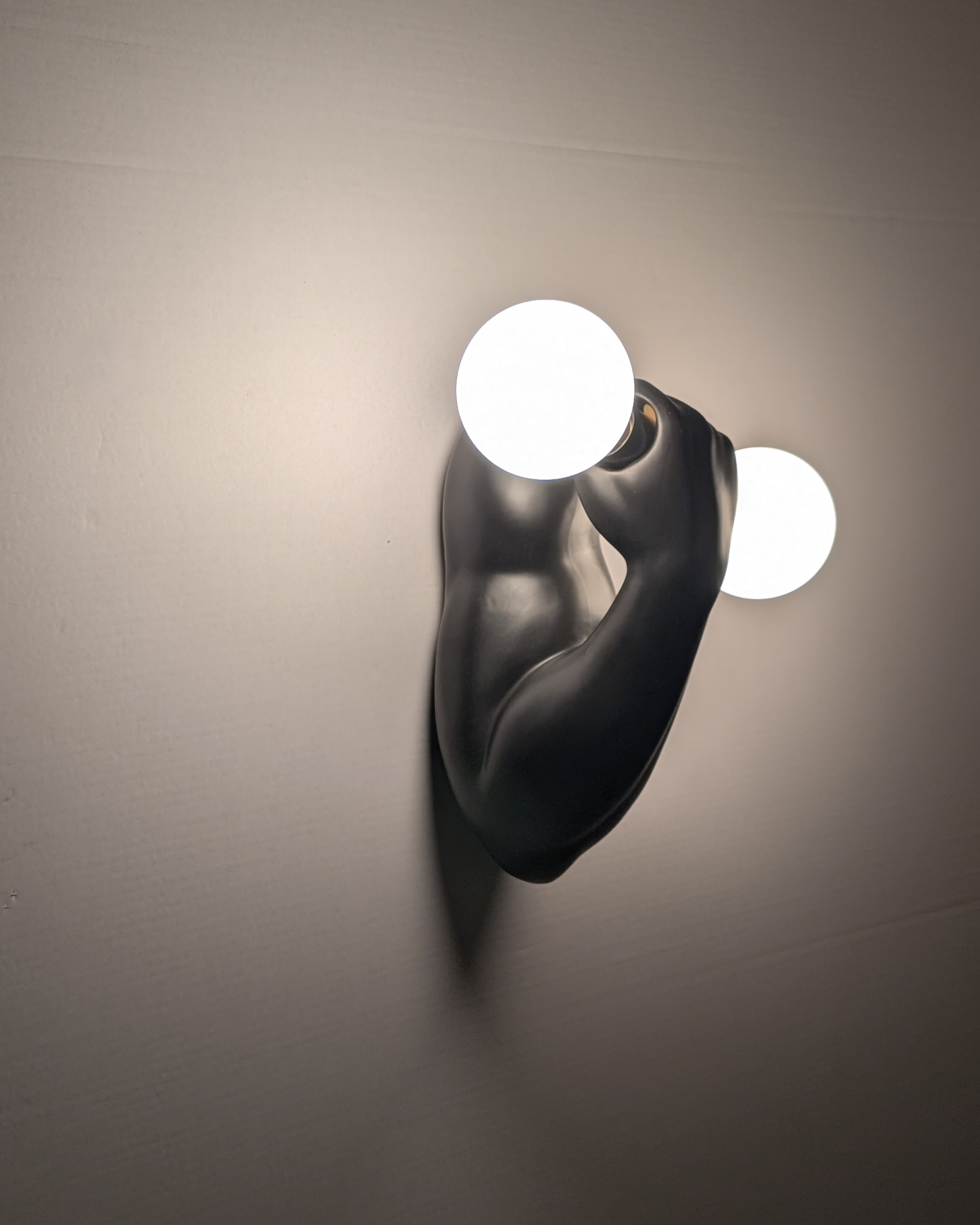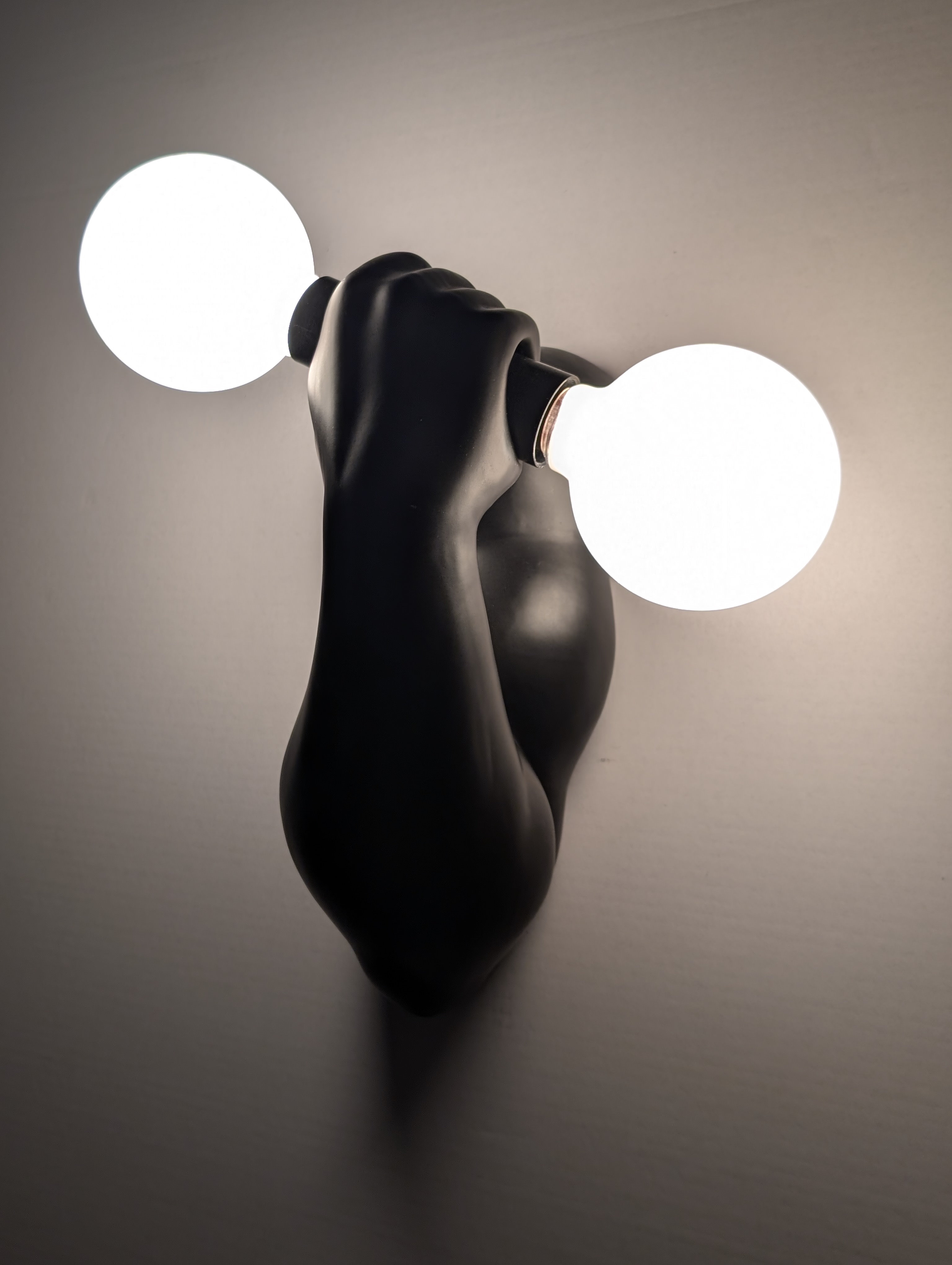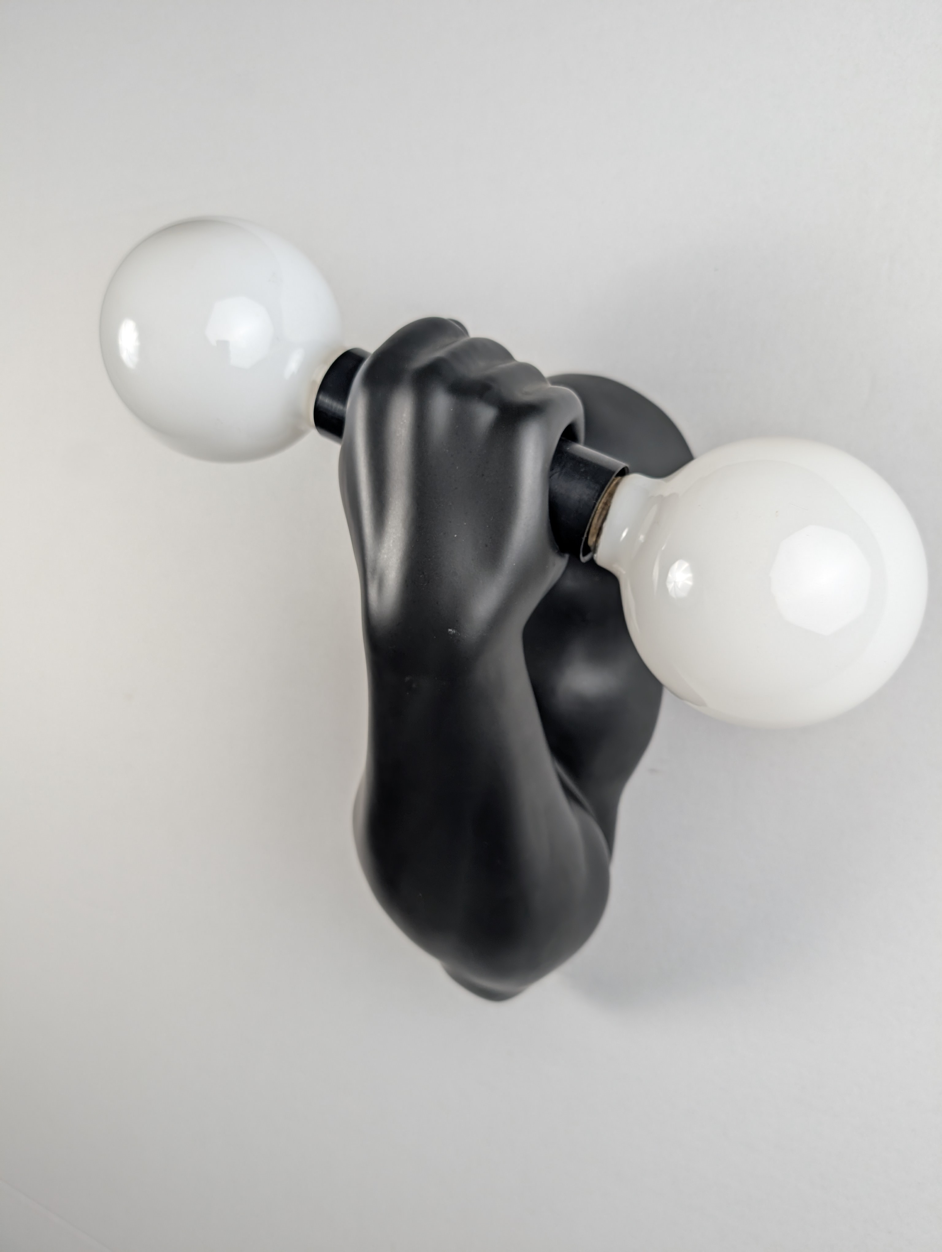 Aplique de pared diseñado por J.C Peiré fabricado en cerámica negra de acabado mate, diseñado escultóricamente como un brazo musculoso. El brazo termina en un puño cerrado del cual emergen directamente dos casquillos opuestos. Estos casquillos sostienen grandes bombillas esféricas que replican visualmente una pesa. Bombillas incluidas.