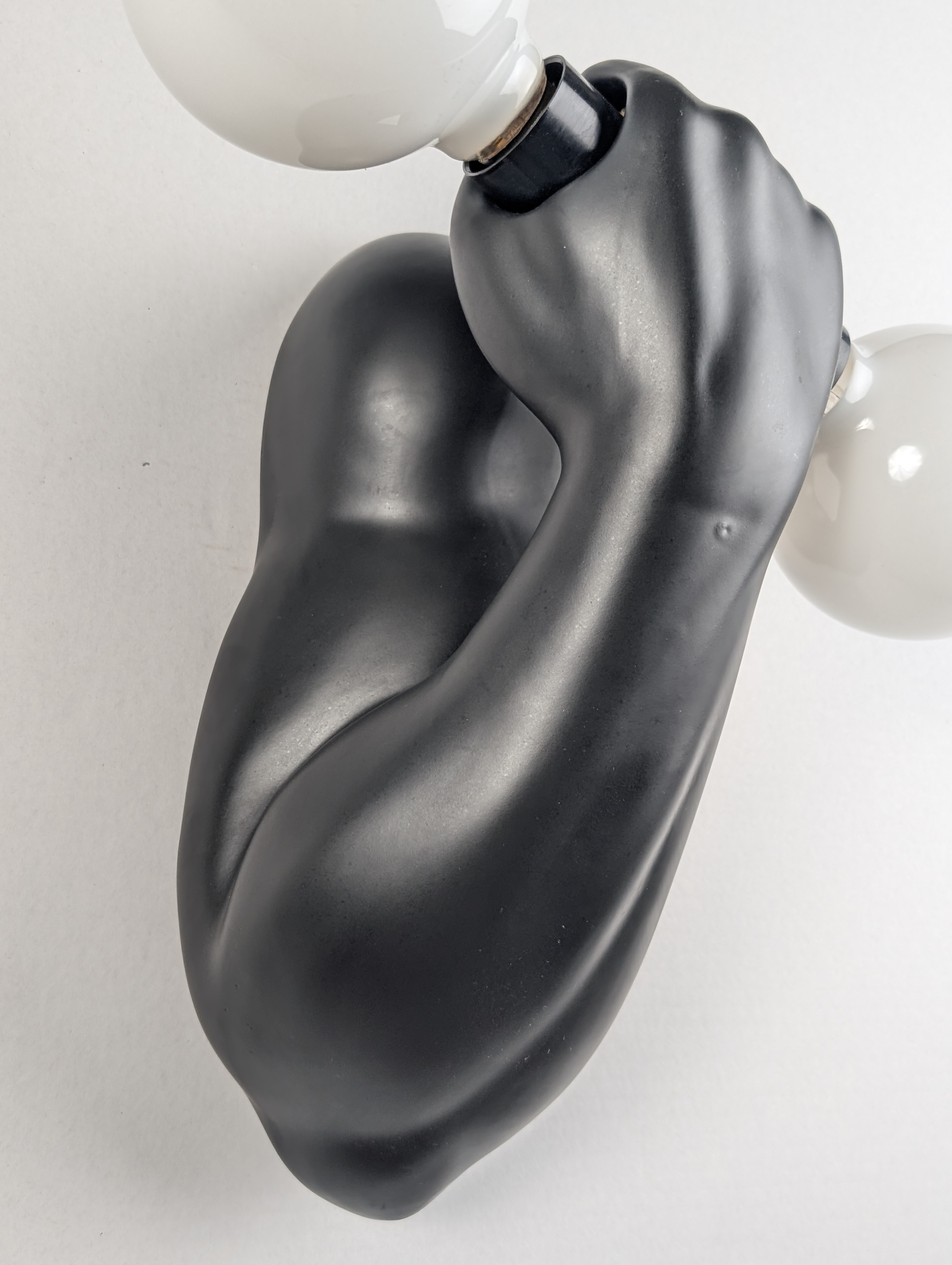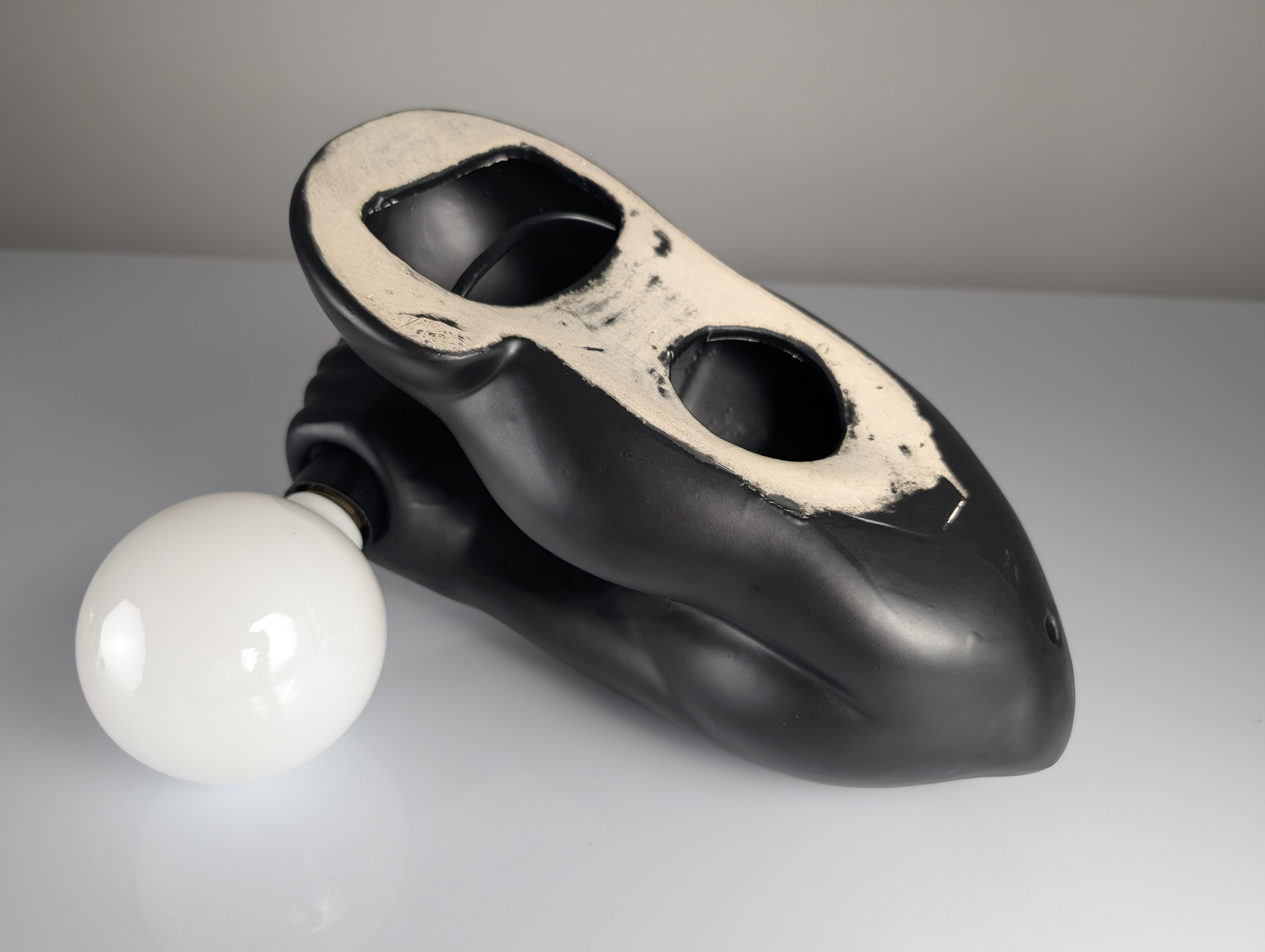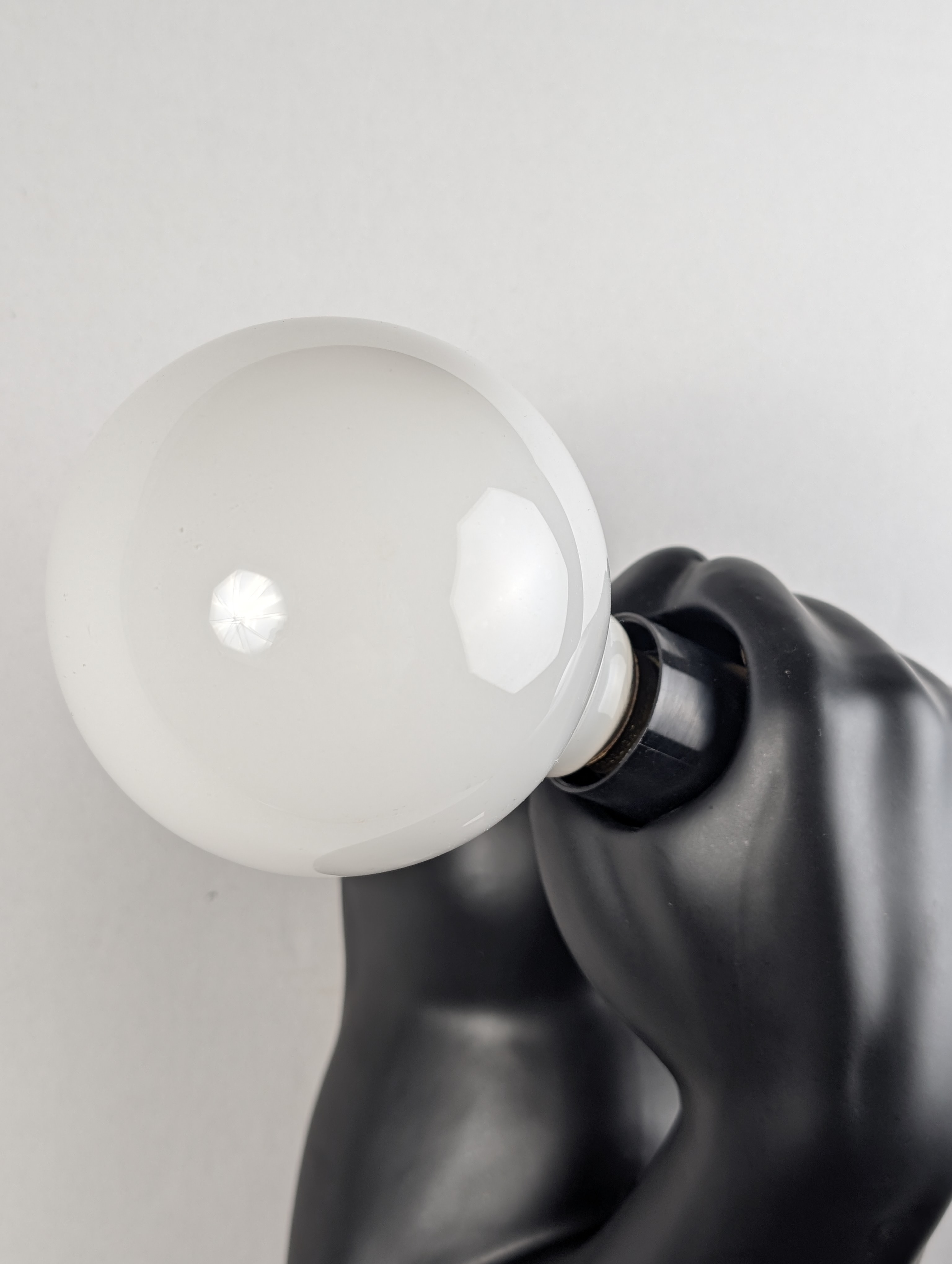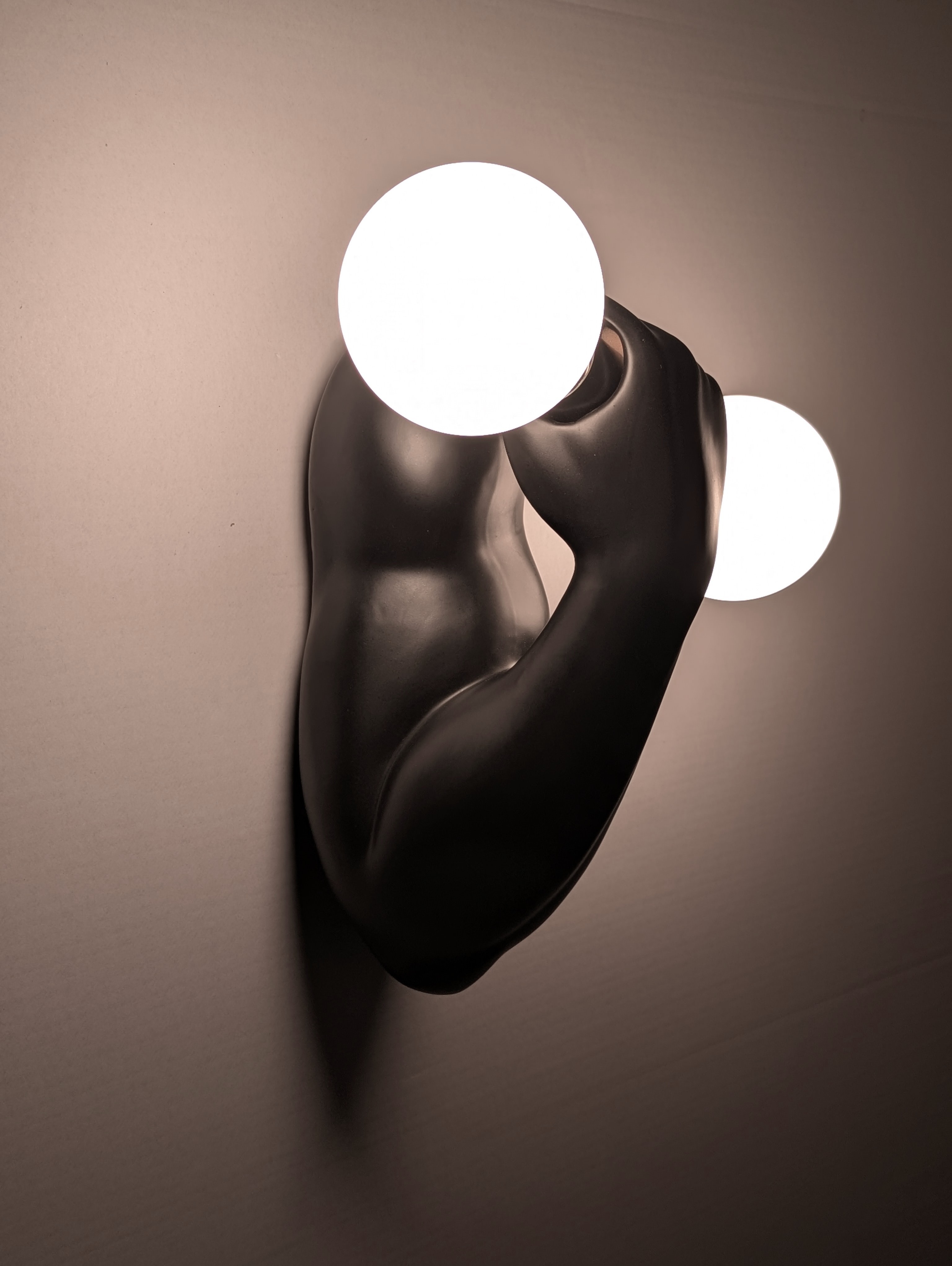 Aplique de pared diseñado por J.C Peiré fabricado en cerámica negra de acabado mate, diseñado escultóricamente como un brazo musculoso. El brazo termina en un puño cerrado del cual emergen directamente dos casquillos opuestos. Estos casquillos sostienen grandes bombillas esféricas que replican visualmente una pesa. Bombillas incluidas.
