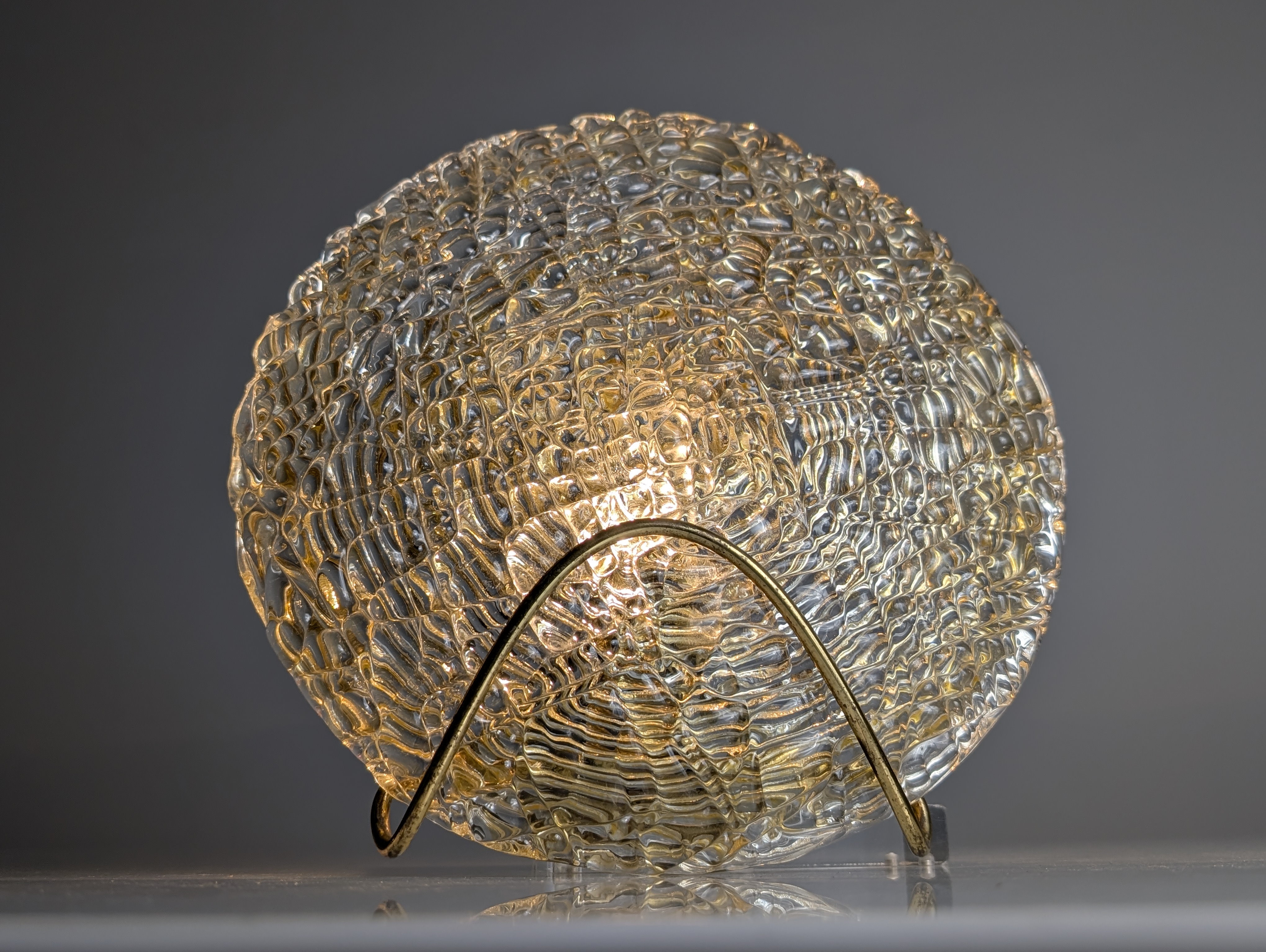 Aplique de pared circular elaborado en grueso cristal de Murano texturizado sostenido por un estilizado soporte tubular de latón, producido en los años 70 con una superficie de marcado relieve orgánico. Este cristal se relaciona directamente con la producción y diseños de Kalmar. La estructura de latón con pátina natural asegura la pieza, permitiendo que la luz se filtre a través del grosor irregular para crear una iluminación atmosférica. Este elemento destaca por su cualidad escultórica y construcción robusta, conservándose en su condición vintage original.