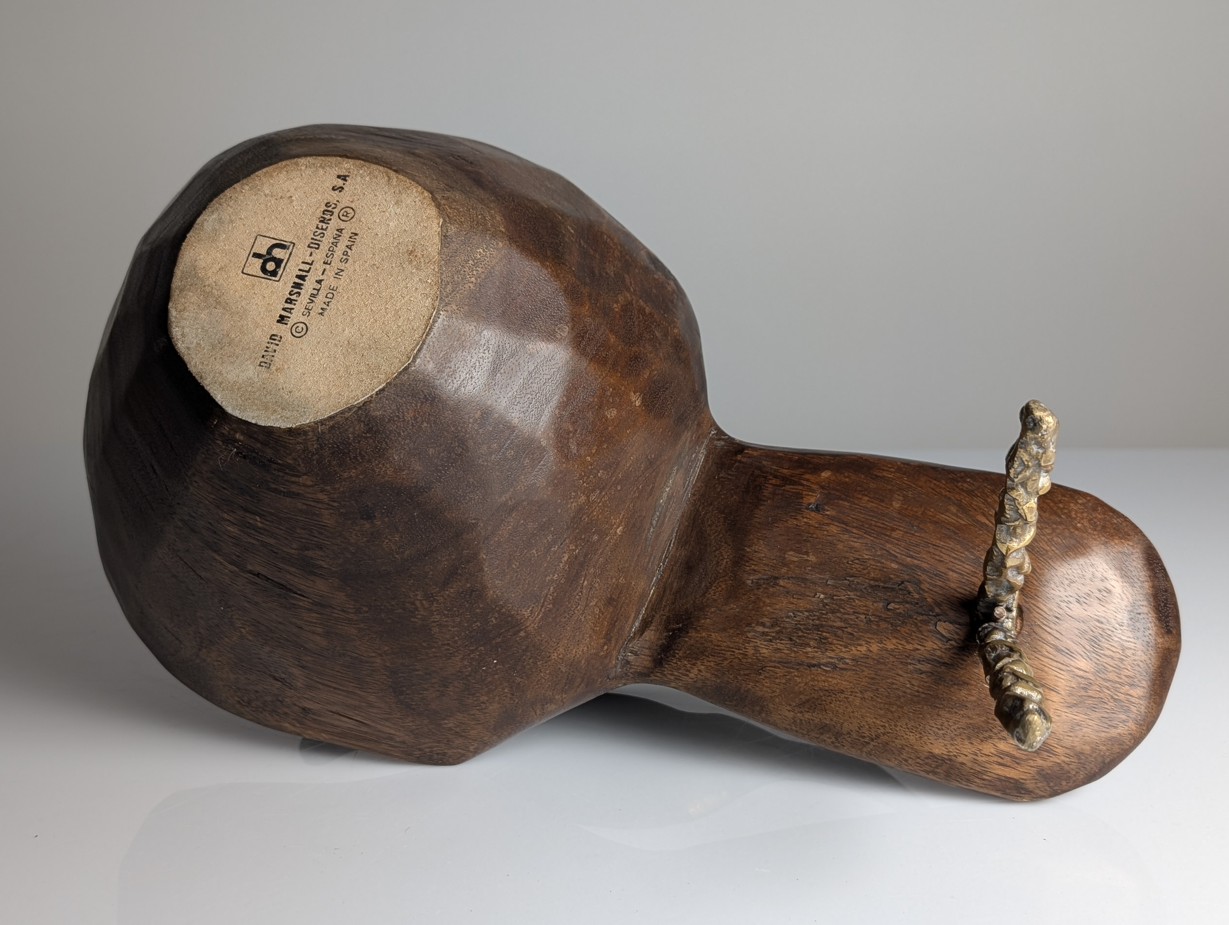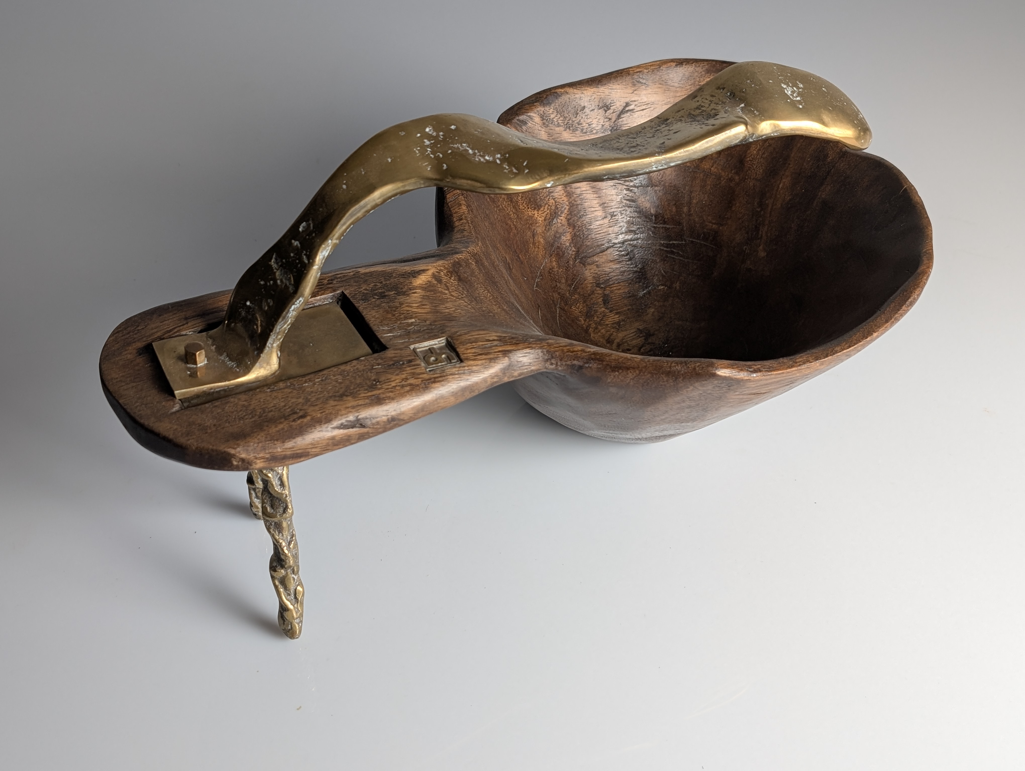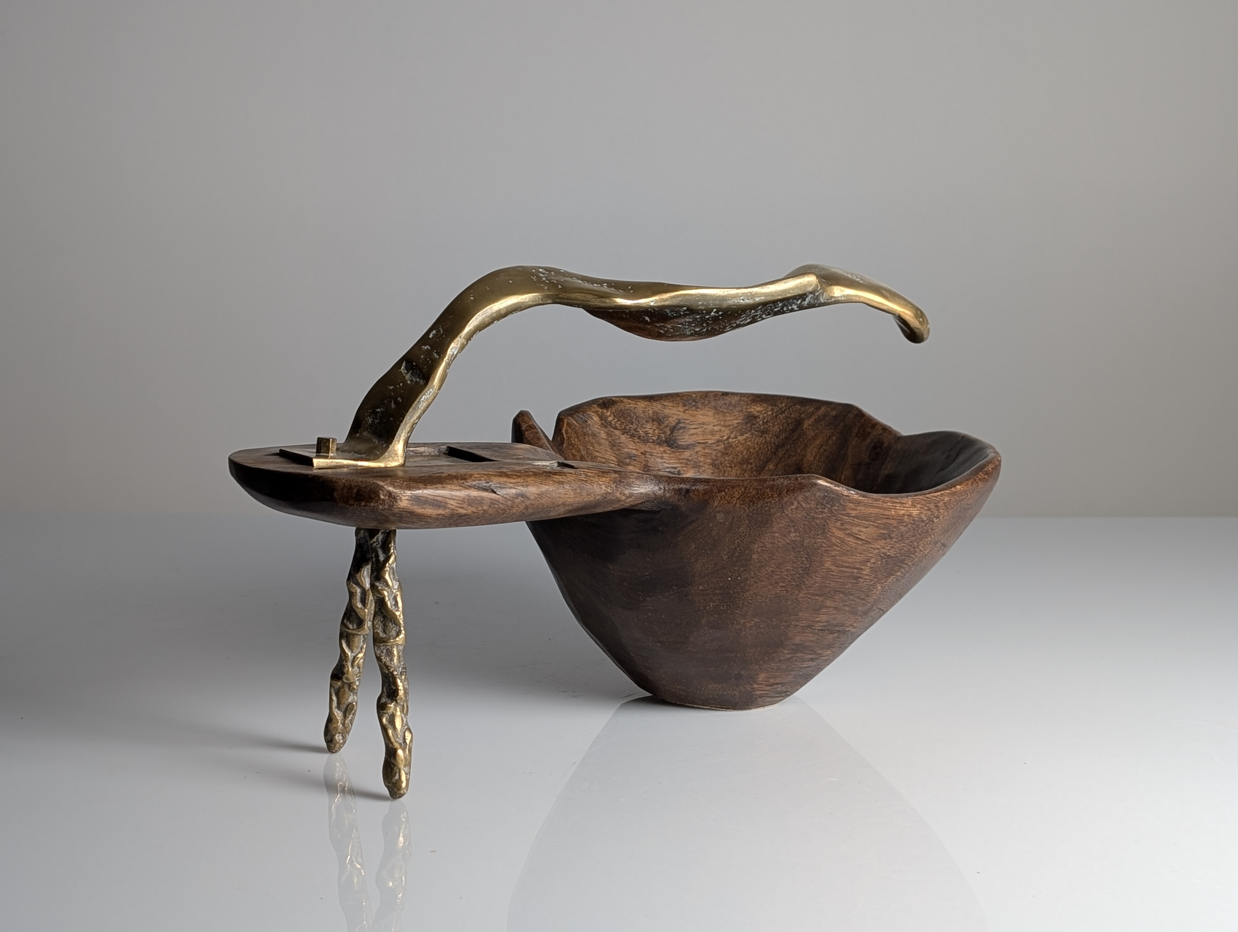 Centro de mesa escultural diseñado por David Marshall con una estructura de bronce fundido y madera tallada que combina formas orgánicas con texturas brutalistas. El diseño integra un profundo recipiente de madera con un asa de bronce macizo que se extiende hacia una pata de soporte, mostrando la técnica de fundición en arena característica del artista. Marcada con el logotipo de David Marshall, la pieza conserva su pátina original con tonos dorados y oxidación natural contrastando con la veta oscura de la madera. Esta pesada y sólida escultura funcional ejemplifica el diseño brutalista español a través de su borde irregular y metalistería fluida.