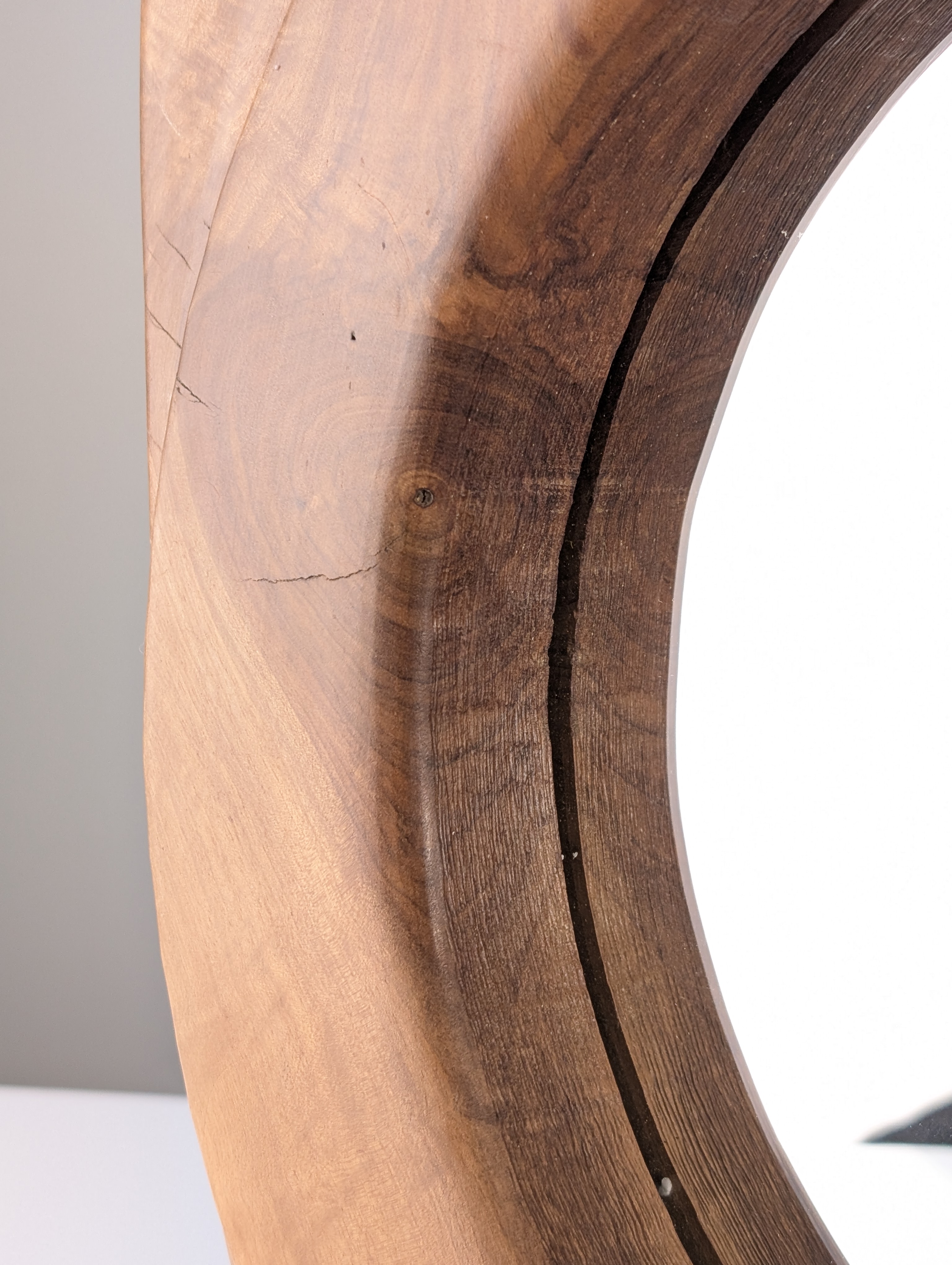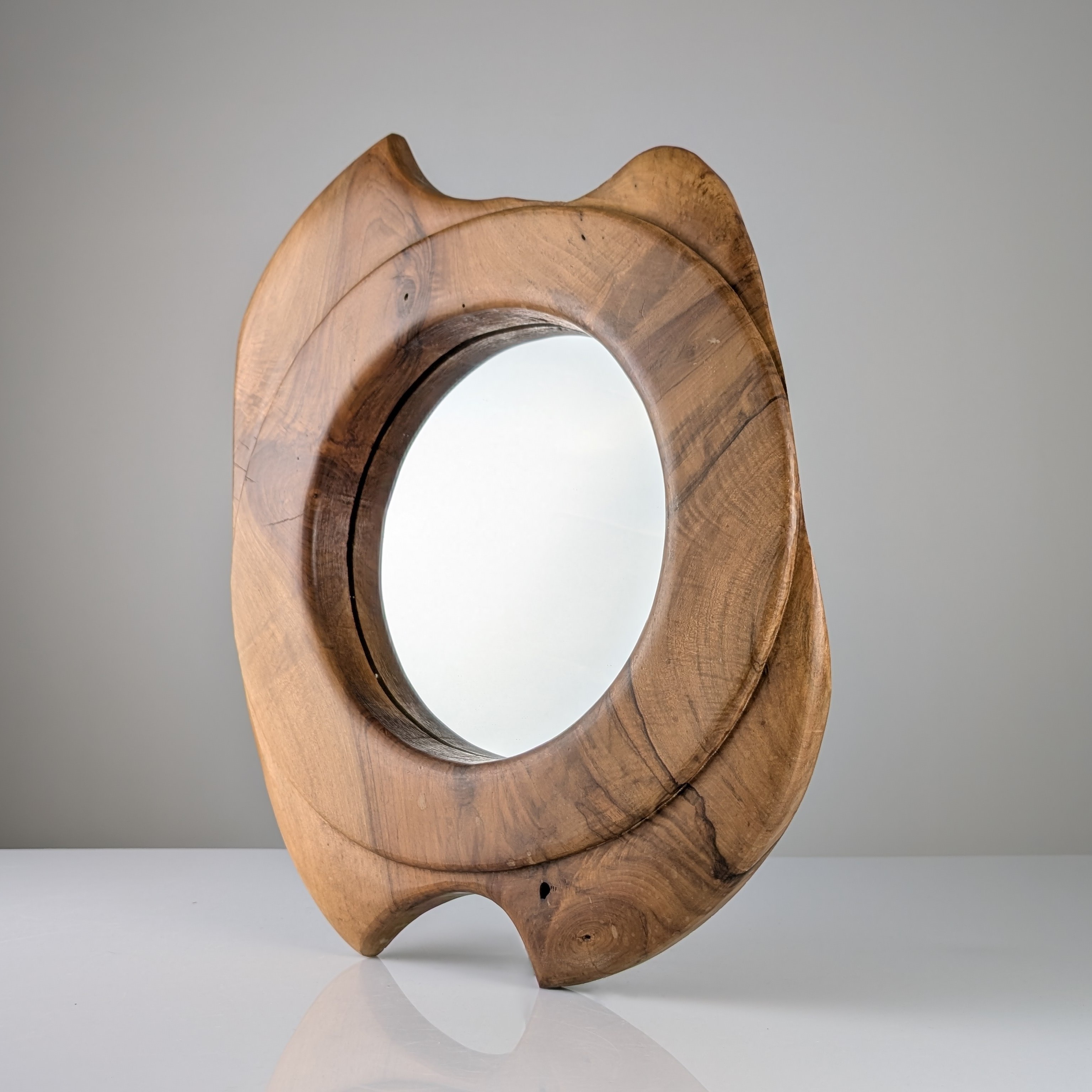 Espejo de pared francés producido en los 1960s. El marco está tallado en madera de nogal maciza, presentando una silueta biomorfa orgánica y asimétrica con bordes fluidos y esculturales. La veta natural y las características texturales de la madera permanecen visibles, proporcionando un contraste material con la luna de espejo circular y plana situada en el centro. La construcción robusta y el equilibrio estructural reflejan el enfoque moderno de mediados de siglo en los materiales naturales y las formas orgánicas.