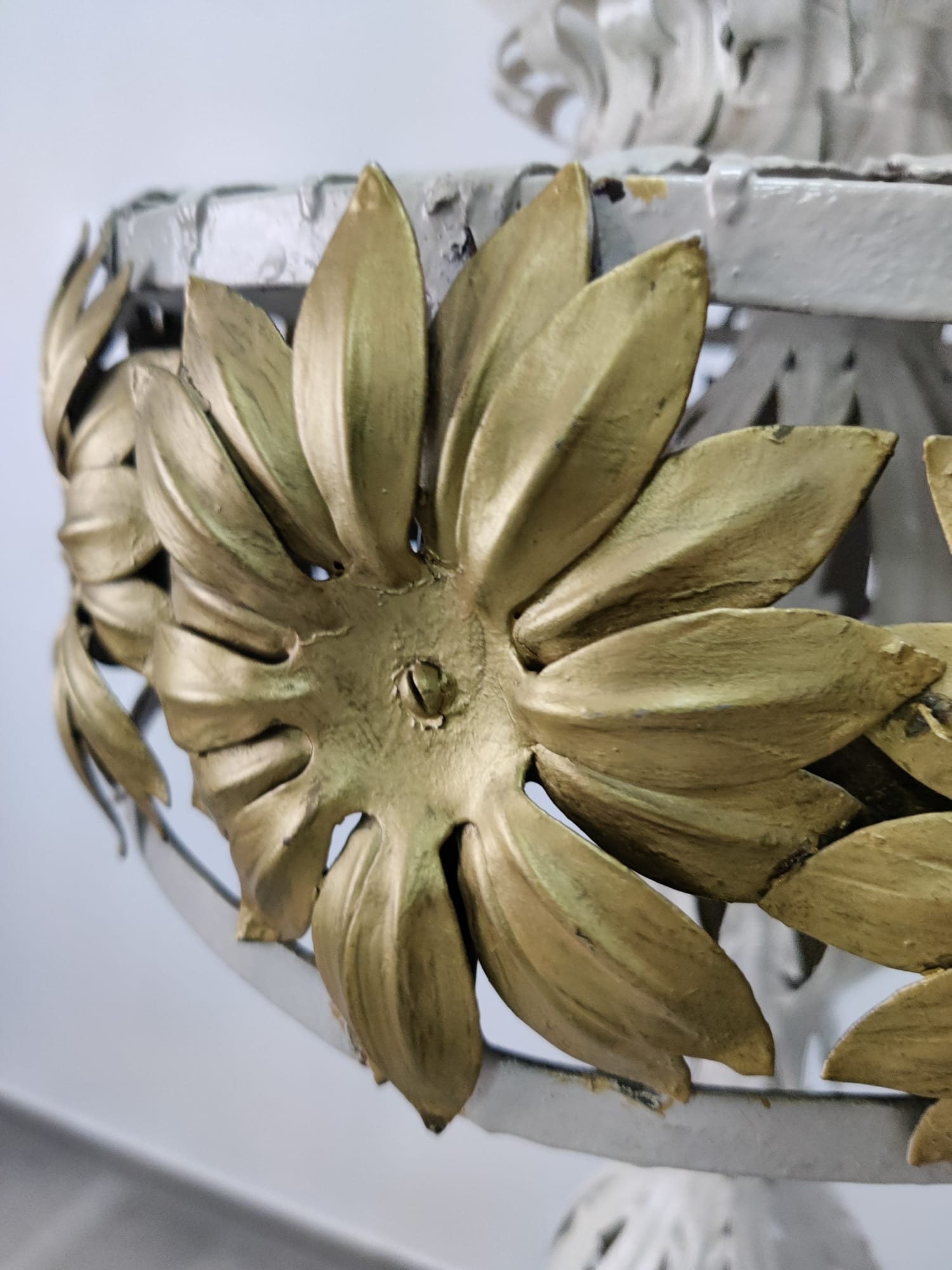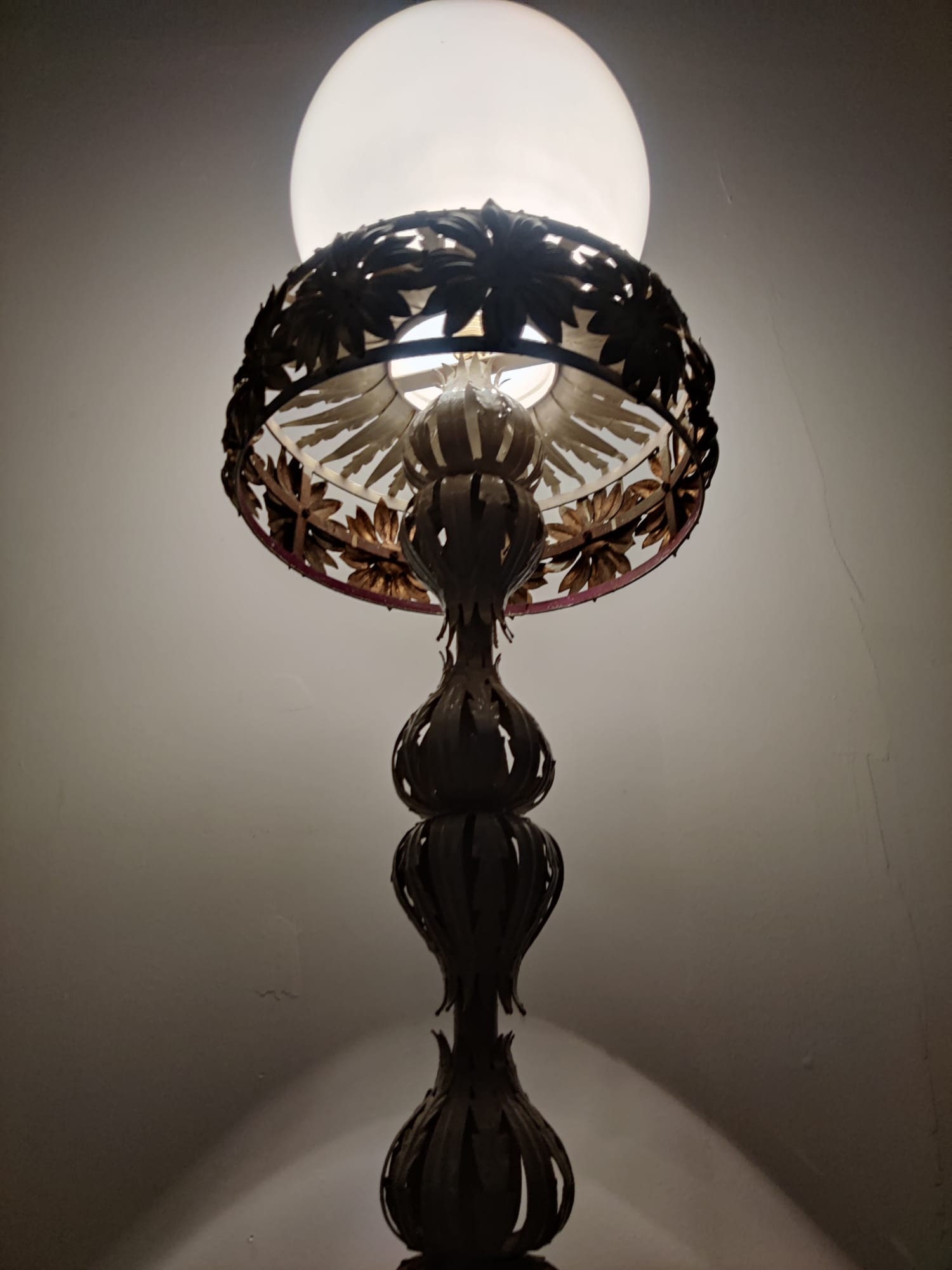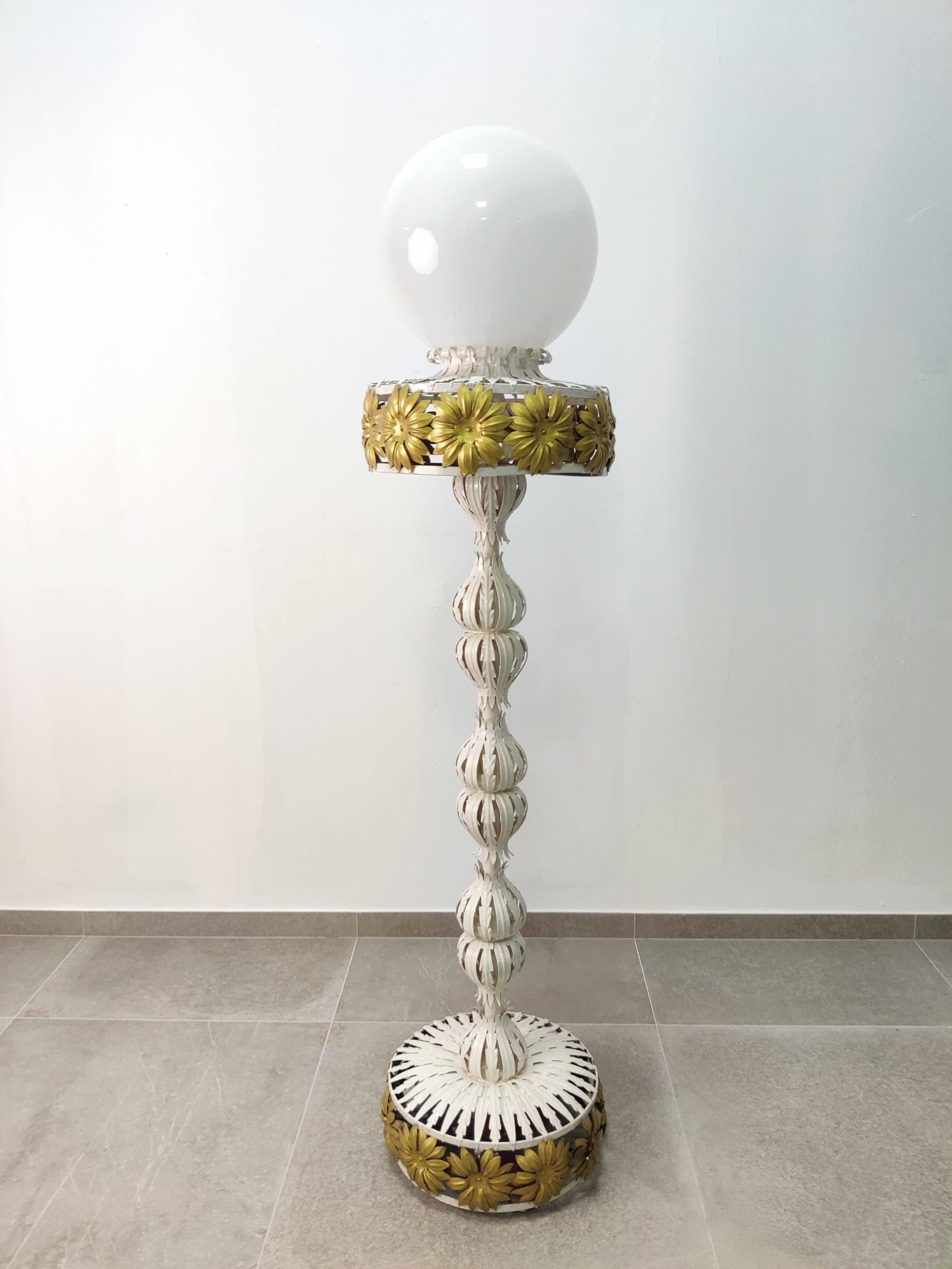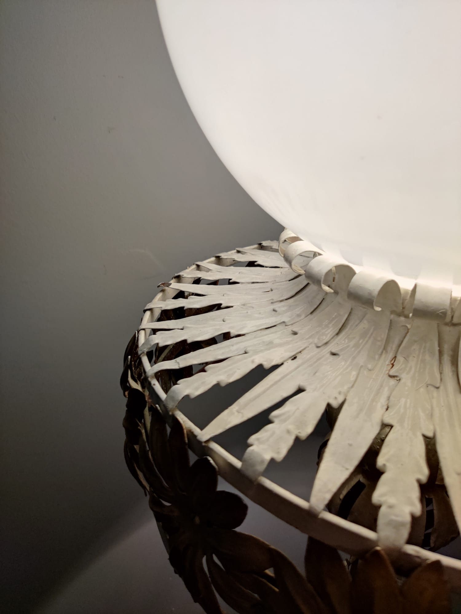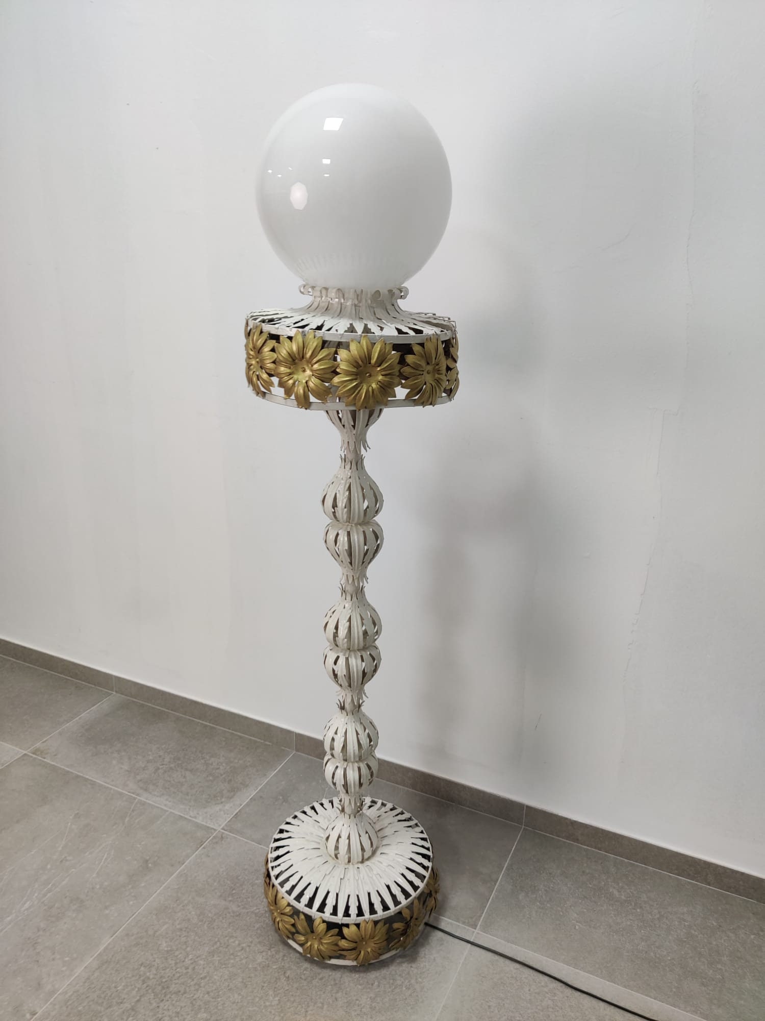 Maravillosa lámpara estilo Maison Jansen forjada en metal blanco y dorado con detalles florales y gran globo en la parte superior.