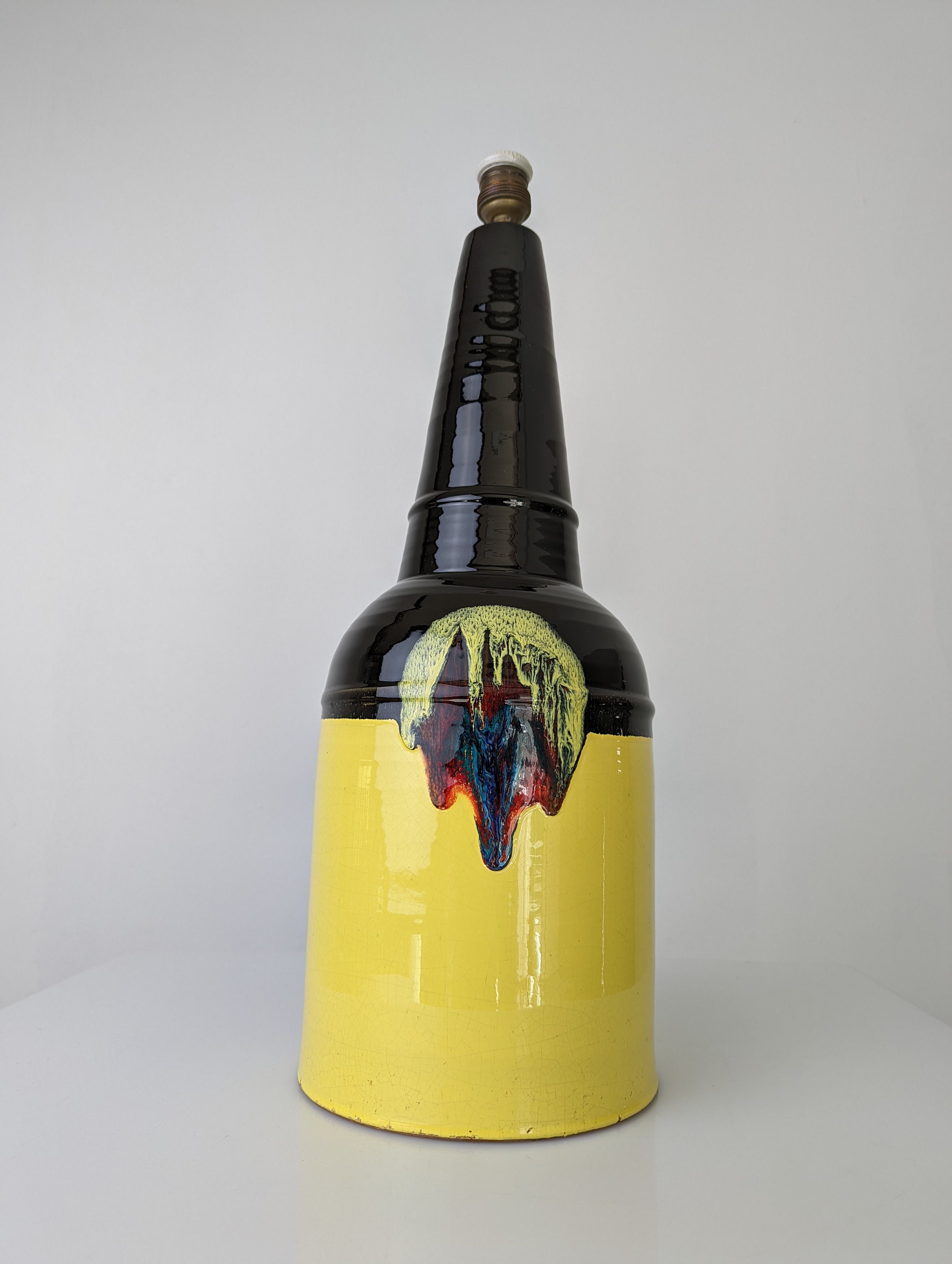 Espectacular lámpara de mesa de cerámica vidriada diseñada por el ceramista y artista danés Bjørn Wiinblad (1918-2006) para Rosenthal, Dinamarca. Su llamativo color amarillo y negro contrastan de una forma fantástica junto con su increíble tamaño la convierten en una pieza super exclusiva y llamativa.