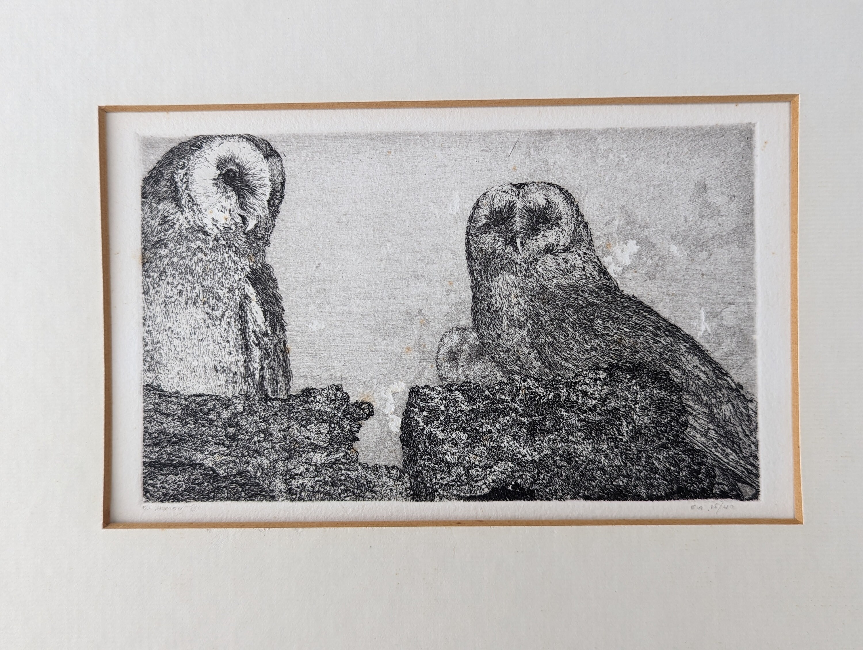 Fantástica obra aguafuerte del artista nacido en Países Bajos, Reiner Homan firmada y numerada E.A 15/40. Representando de forma magistral a dos bellas lechuzas con su estilo tan detallado evocando recuerdos de los hábiles grabadores de la Edad de Oro holandesa.