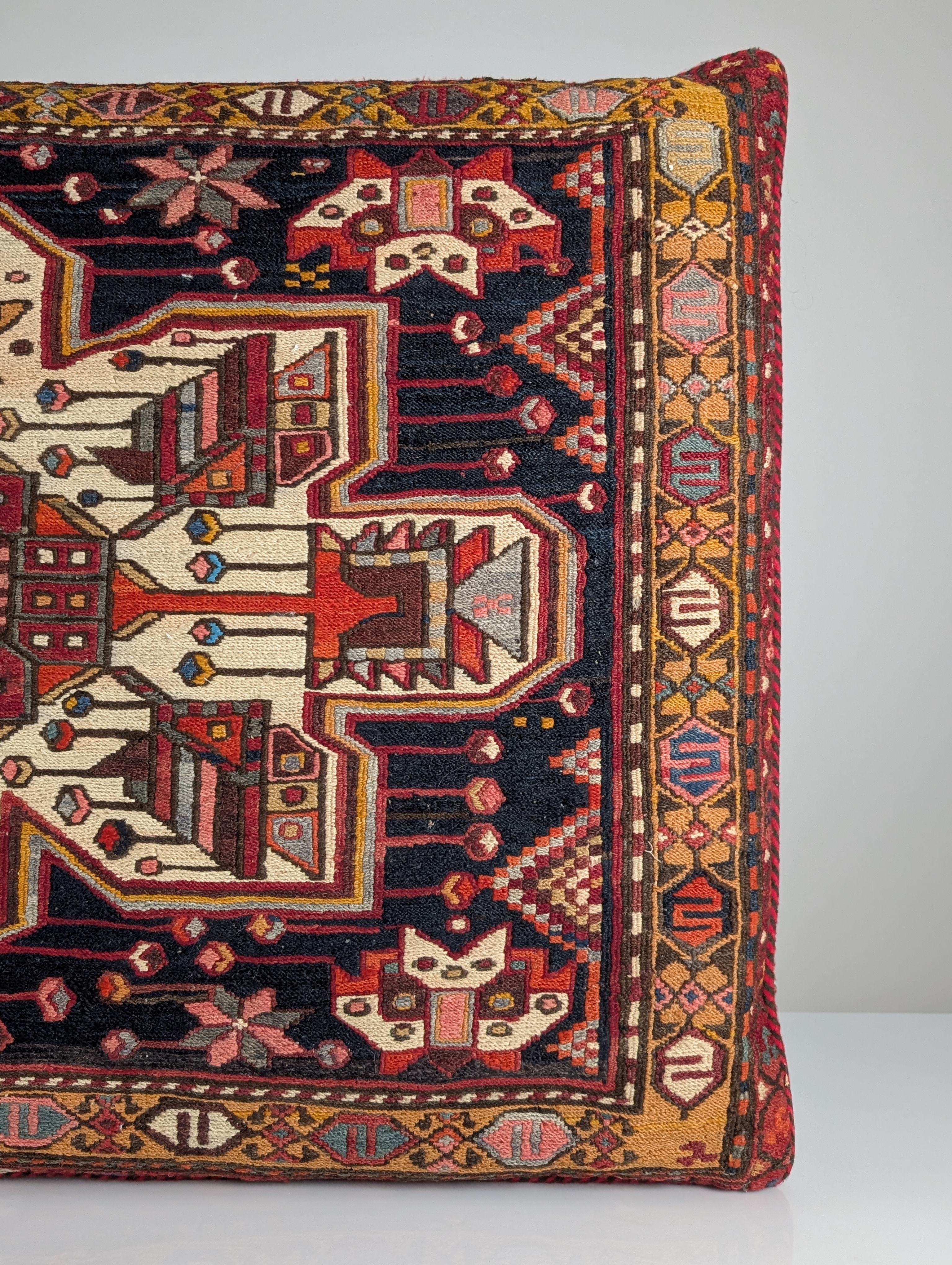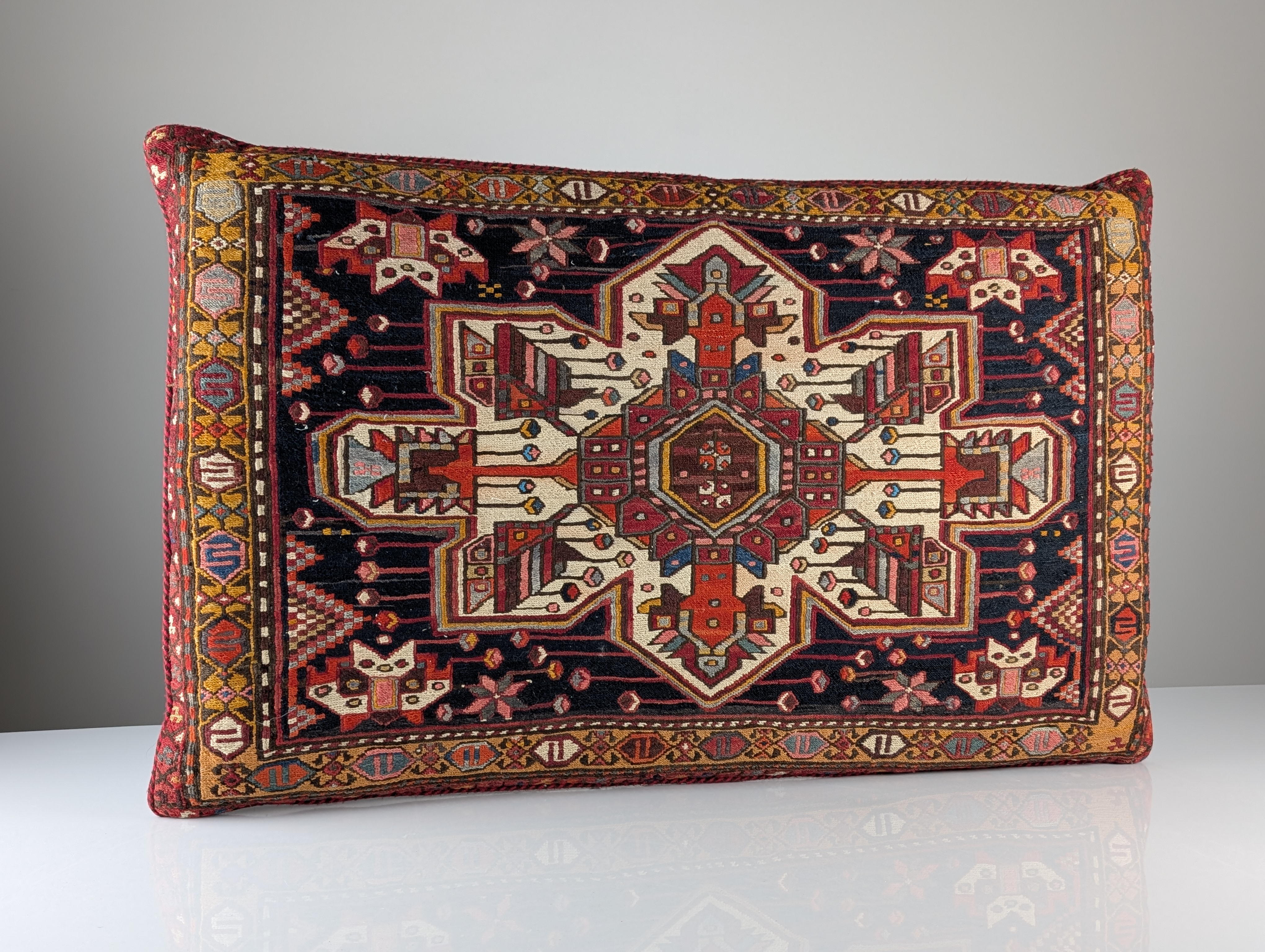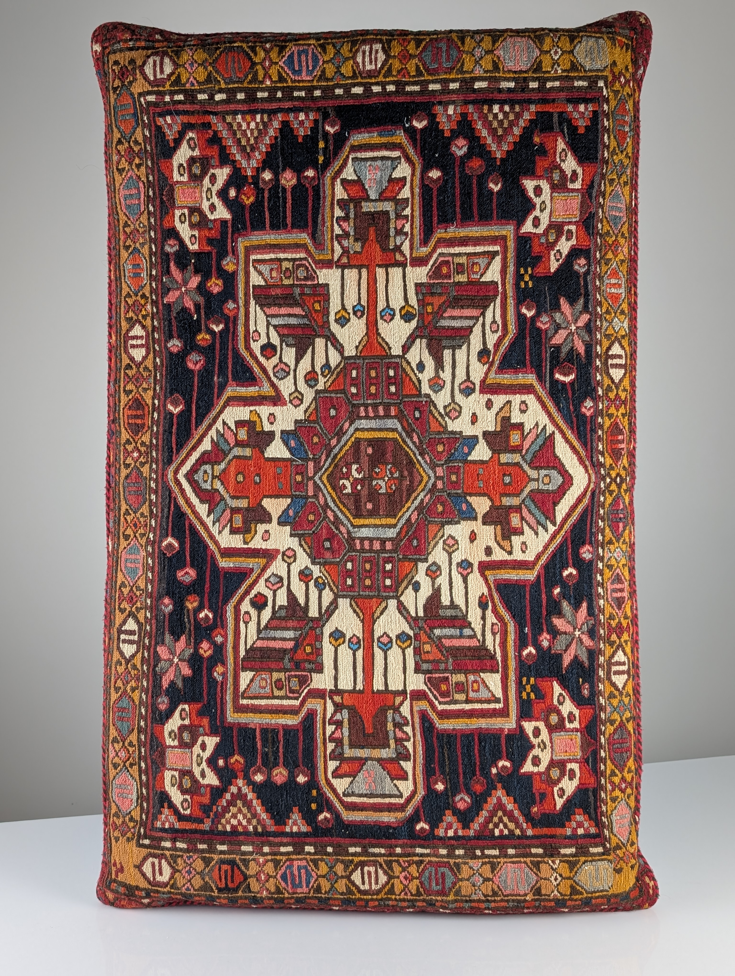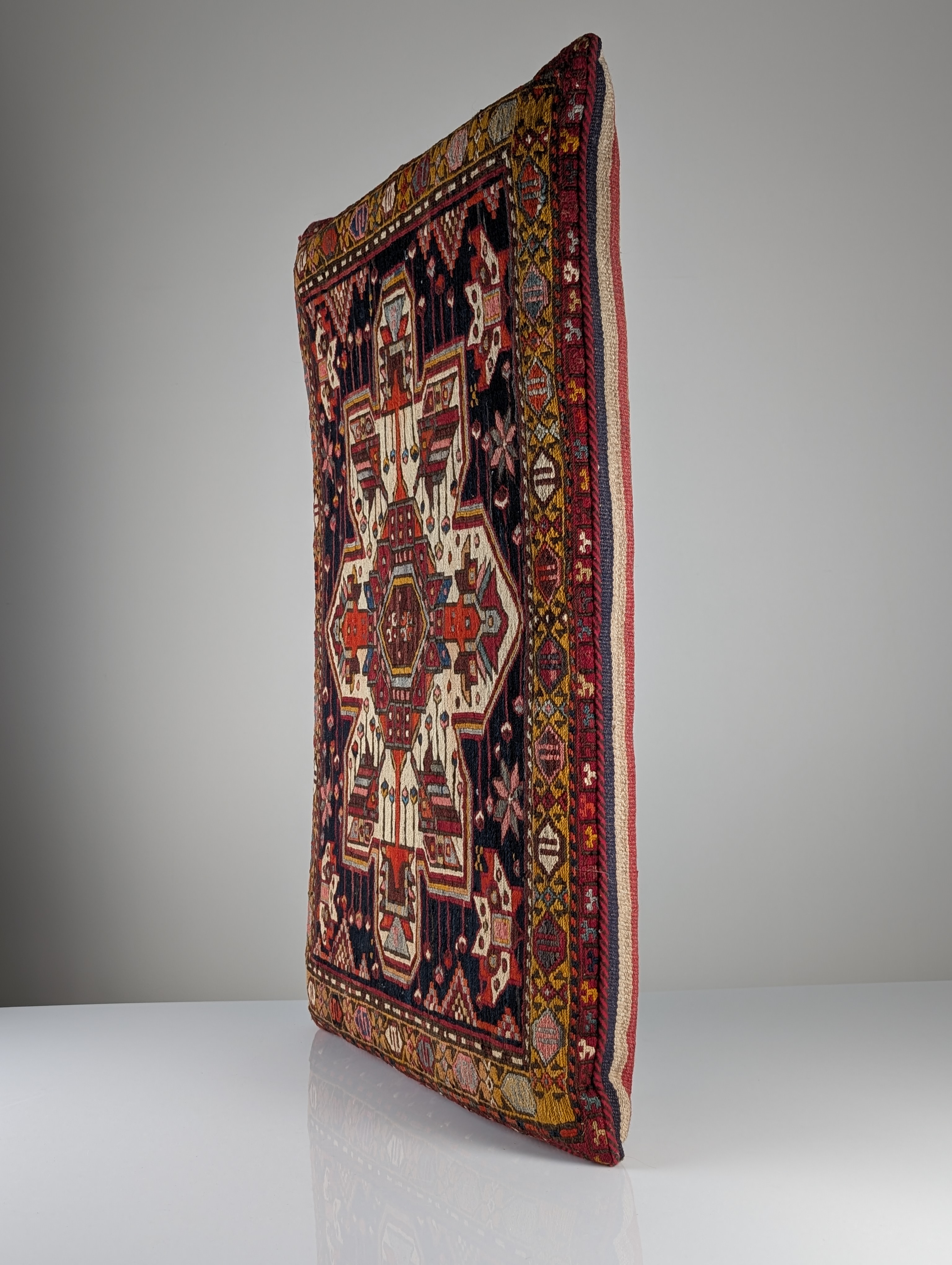 Cojín rectangular de gran formato confeccionado a partir de un fragmento de alfombra Soumak de mediados del siglo XX. El panel frontal presenta una estructura de lana tejida a mano con la textura brocada típica de la técnica Soumak. El diseño muestra un medallón geométrico central rodeado de motivos tribales en rojo óxido, ocre y marfil sobre un fondo carbón oscuro.