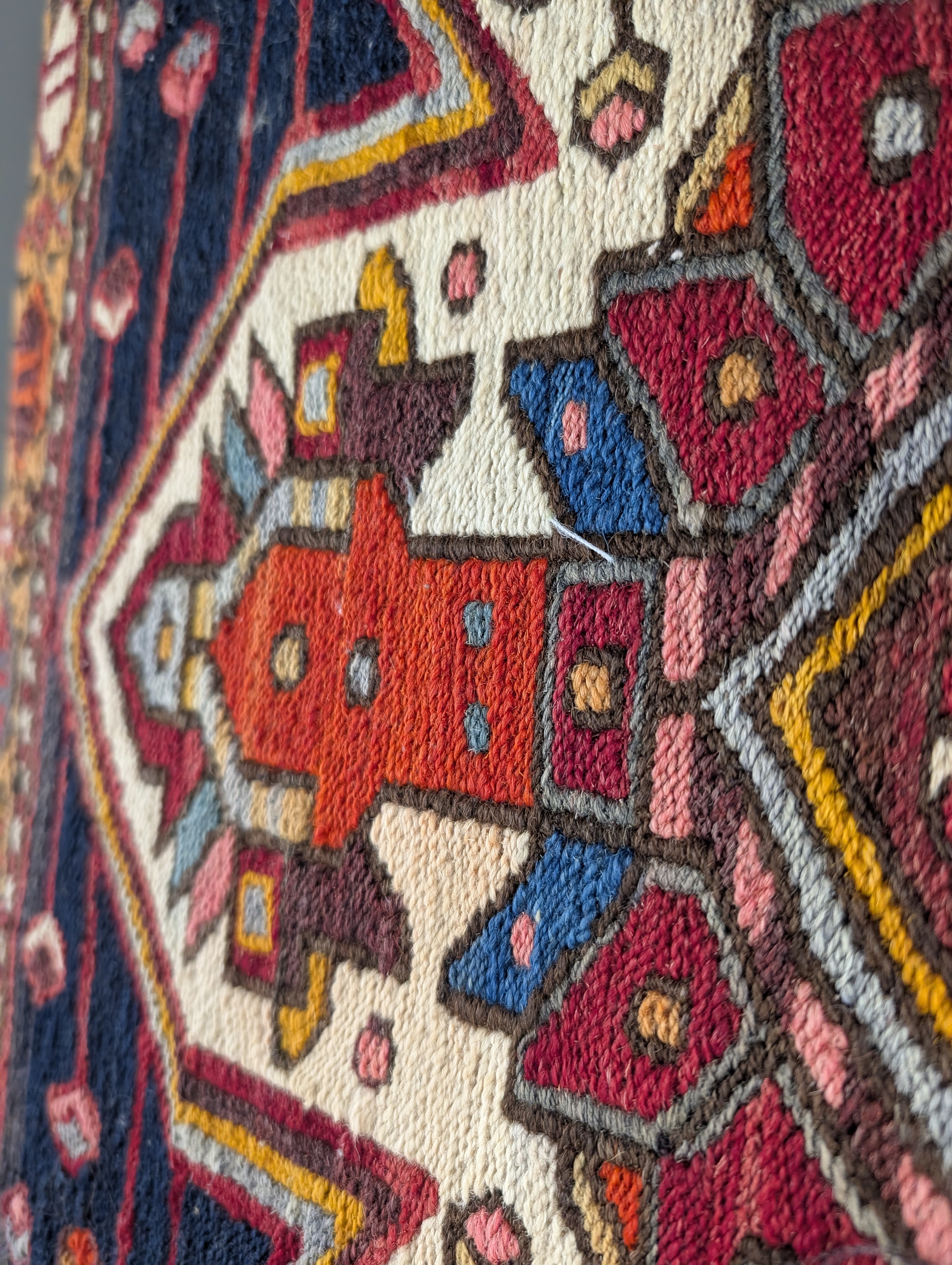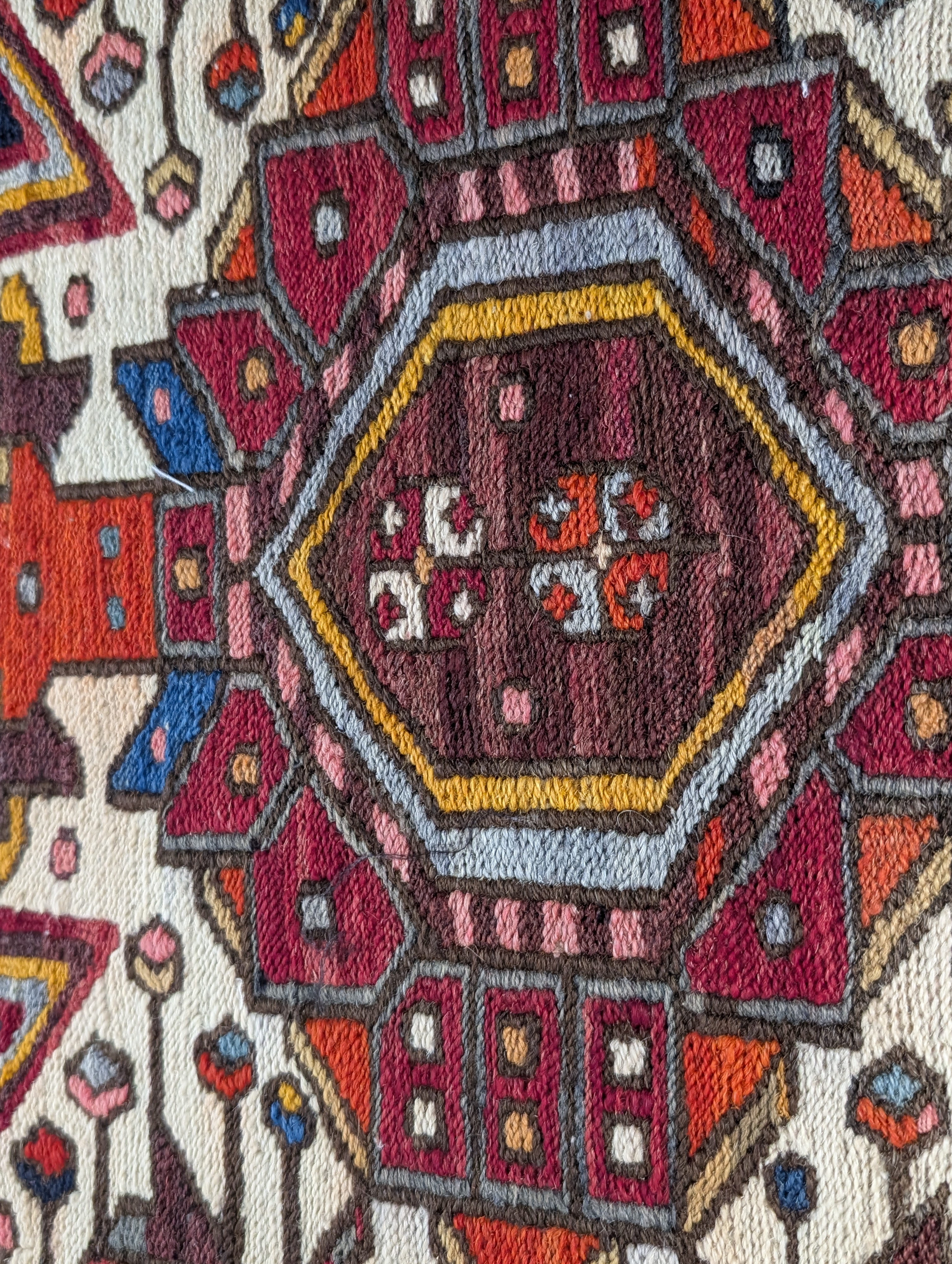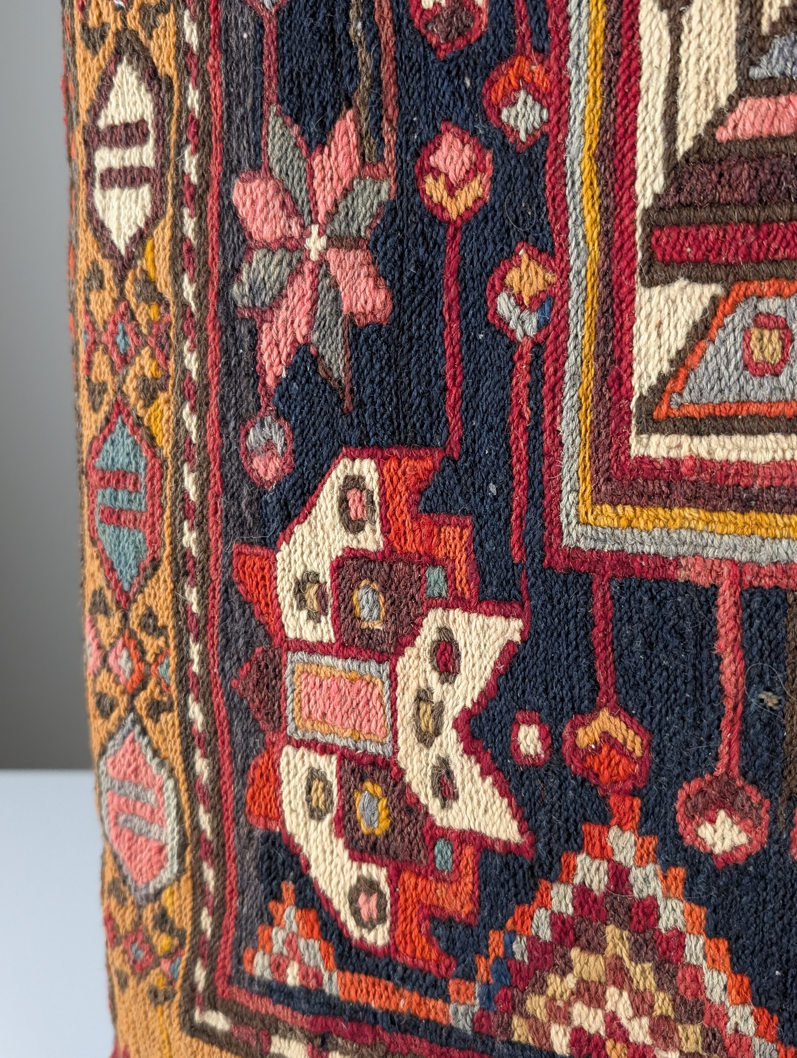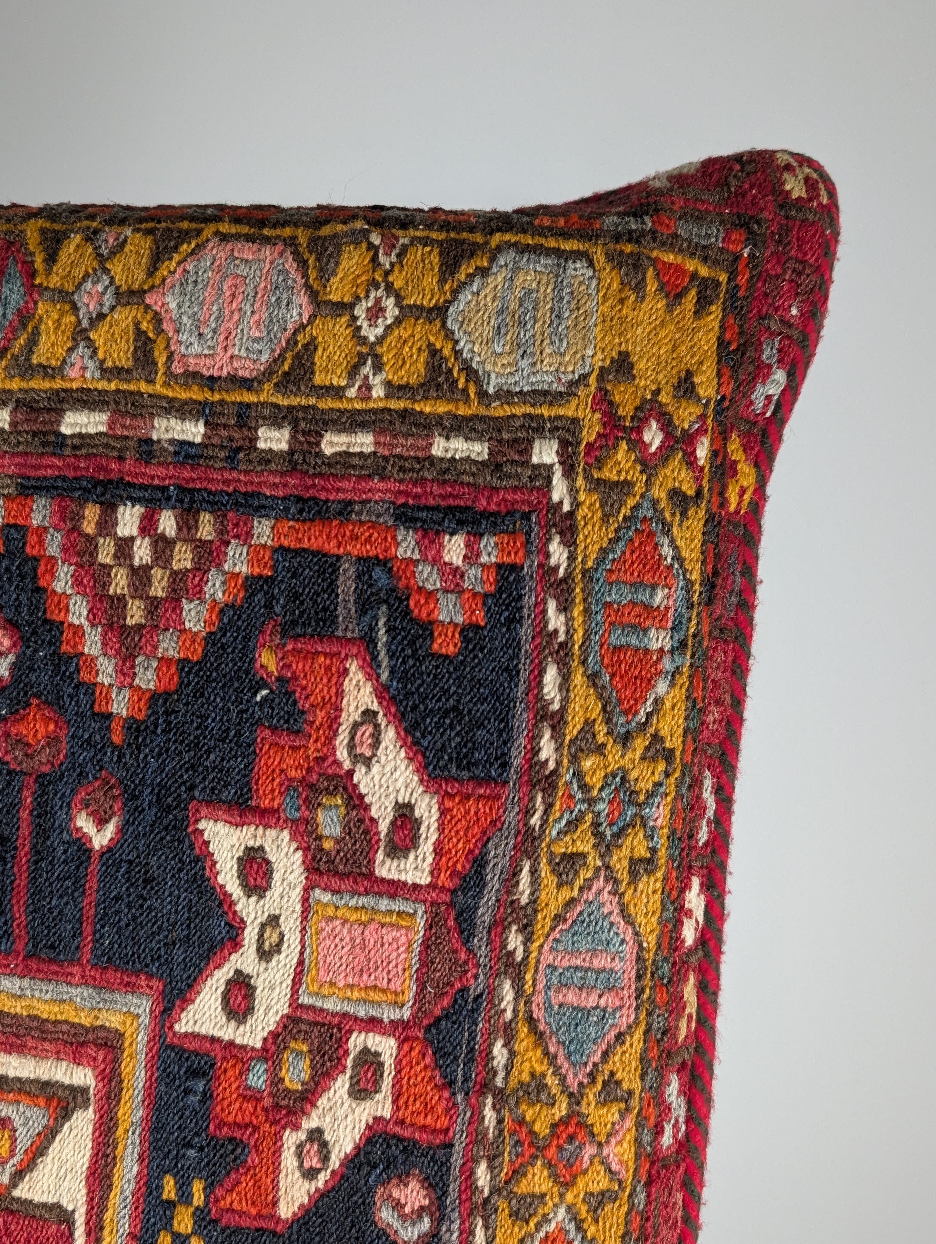 Cojín rectangular de gran formato confeccionado a partir de un fragmento de alfombra Soumak de mediados del siglo XX. El panel frontal presenta una estructura de lana tejida a mano con la textura brocada típica de la técnica Soumak. El diseño muestra un medallón geométrico central rodeado de motivos tribales en rojo óxido, ocre y marfil sobre un fondo carbón oscuro.