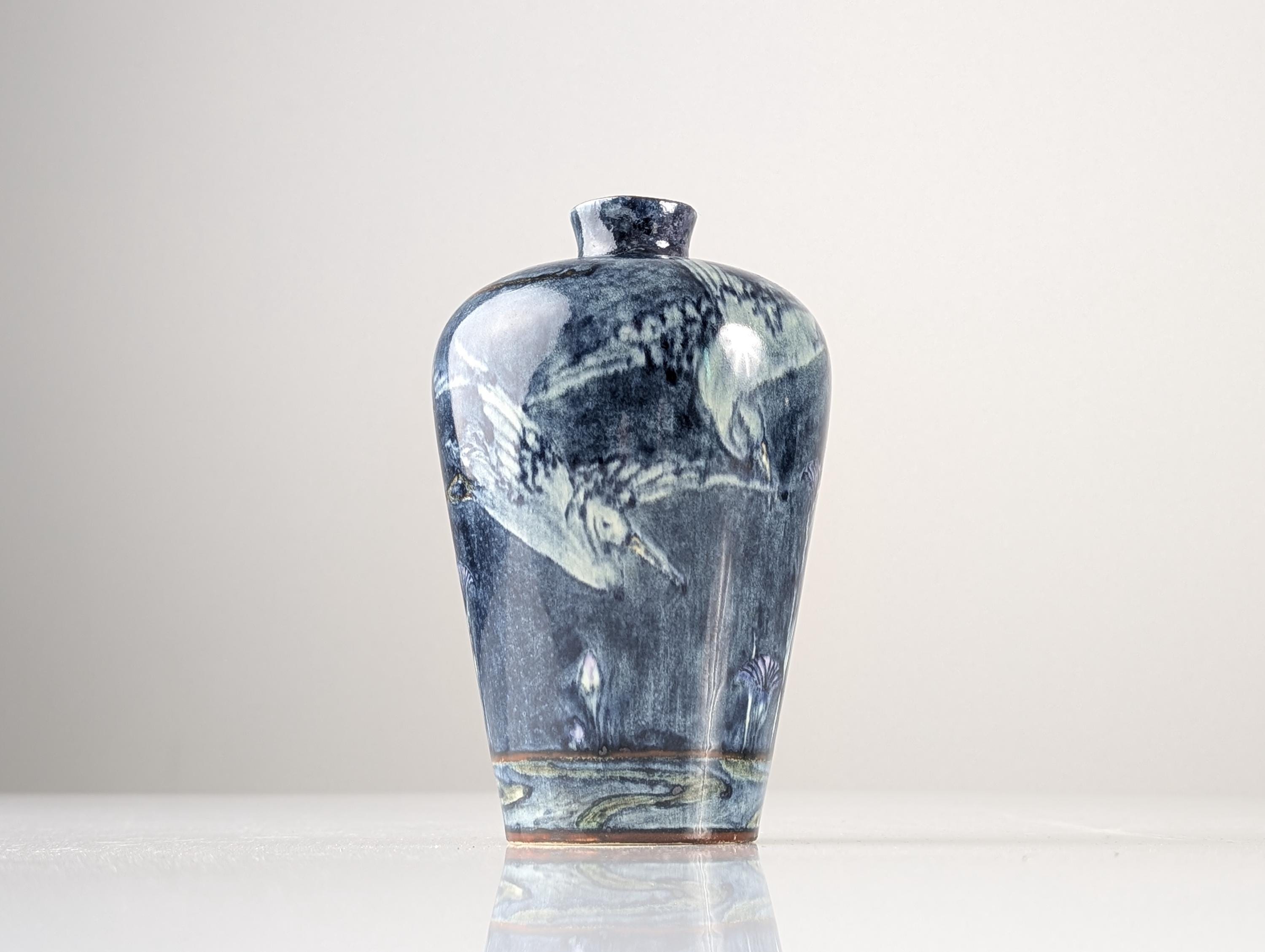 Excepcional jarrón de cerámica Art Nouveu obra de Jan Willem Mijnlieff, fundador y maestro ceramista de Fayence- en Tegelfabriek Holland, la icónica fábrica de Utrecht activa entre 1893 y 1920. Su diseño muestra garzas en pleno vuelo sobre un hermoso lago lleno de flores.