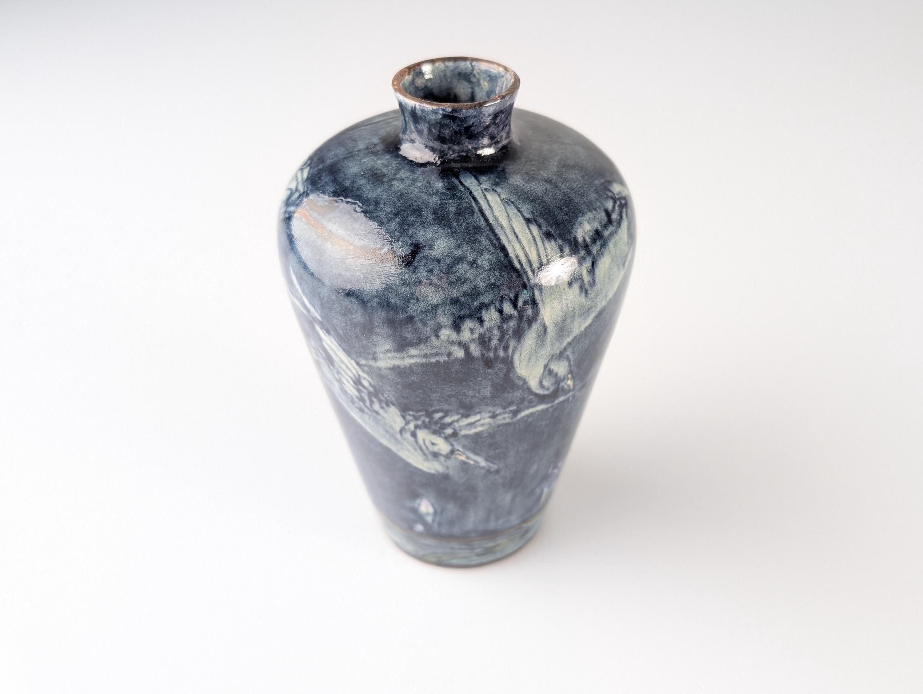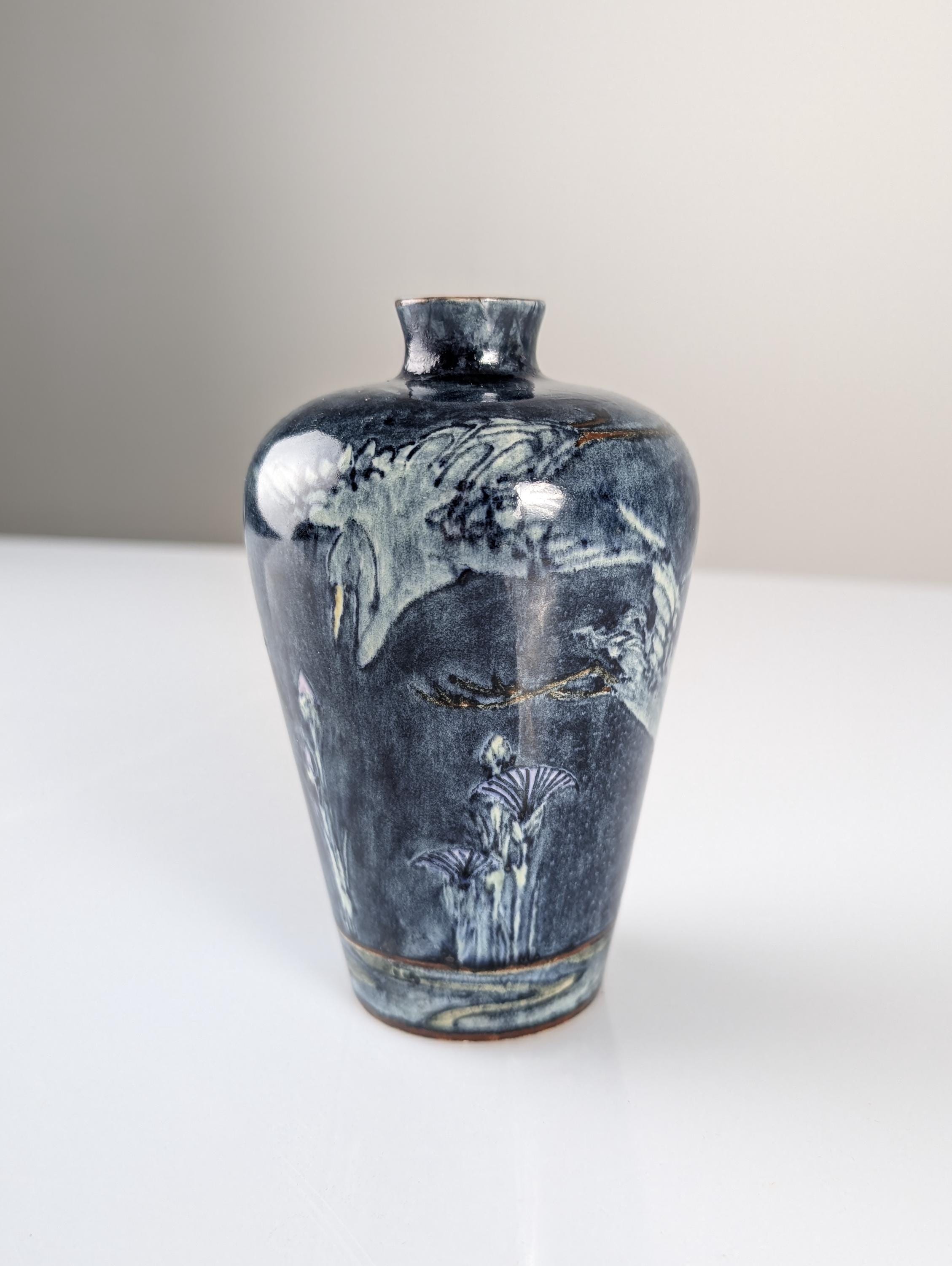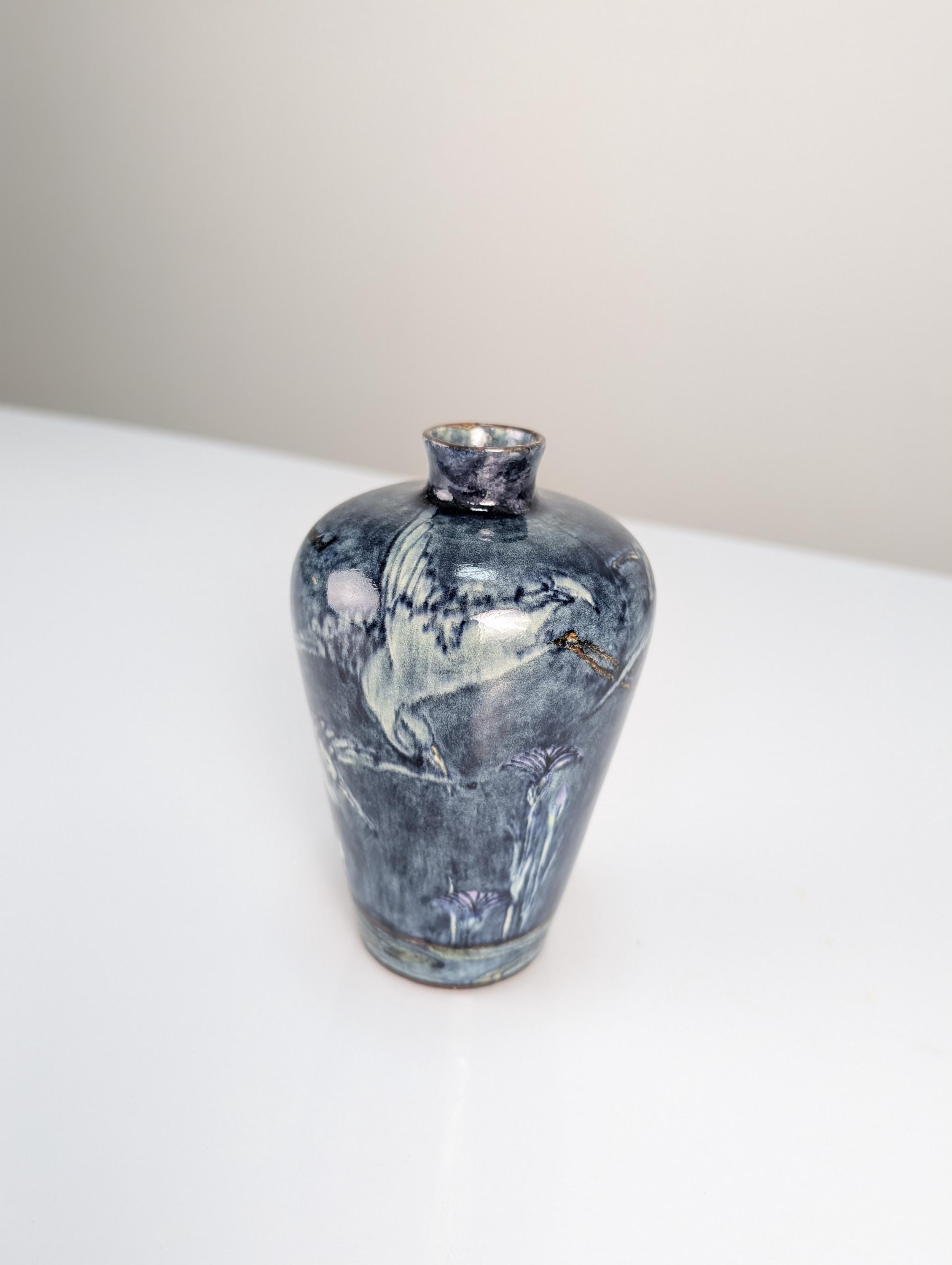 J.W. Mijnlieff, es uno de los grandes ceramistas Holandeses de loza esmaltada y su influencia en la cerámica decorativa holandesa llevo sus obras a las grandes colecciones del mundo como la del Museo Metropolitano de Arte, reflejando su habilidad y contribución al movimiento Art Nouveau en los Países Bajos. En esta bellisima pieza Mijnlieff capturó la esencia de la naturaleza con pinceladas fluidas y una gran profundidad sobre tonos azules. La base del jarrón está marcada con “Holland Utrecht”. Una obra de colección que une historia, arte y maestría artesanal.