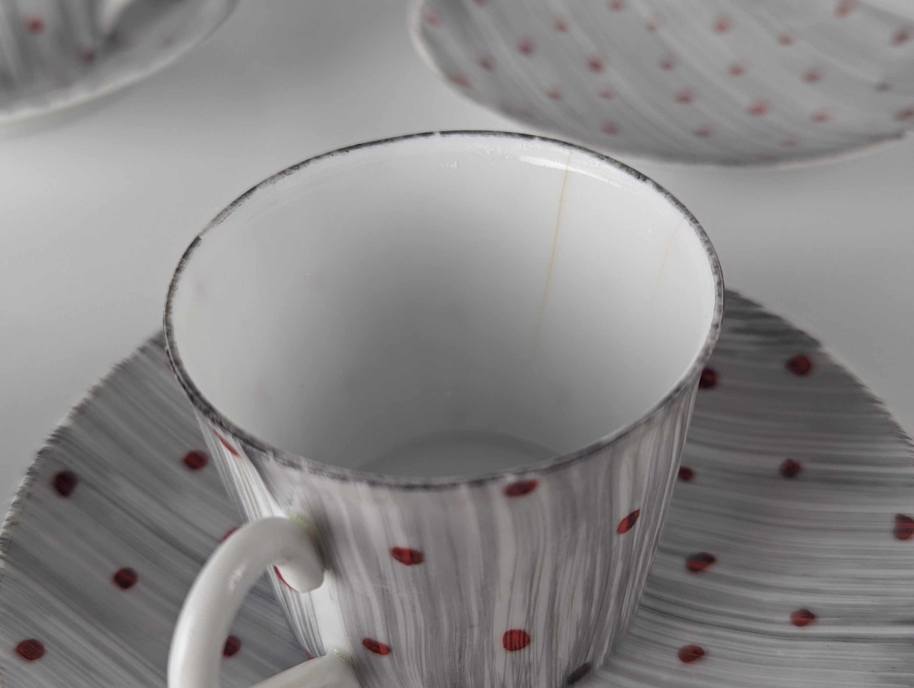 El juego de café Castro Sargadelos Dolmen de los años 50 incorpora la belleza de la porcelana y la originalidad de su diseño en base a fondos de lineas y lunares de color rojo, fusionando así la herencia cultural y artística de la región en una obra de arte funcional.