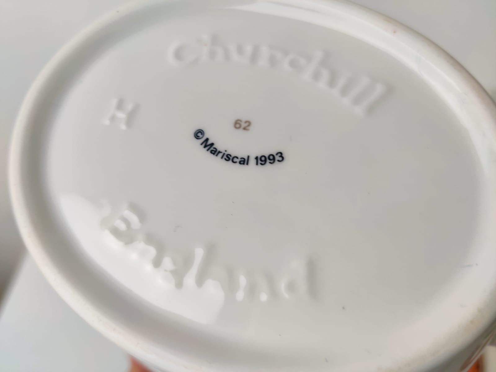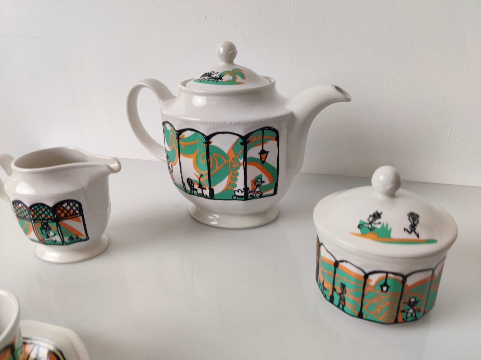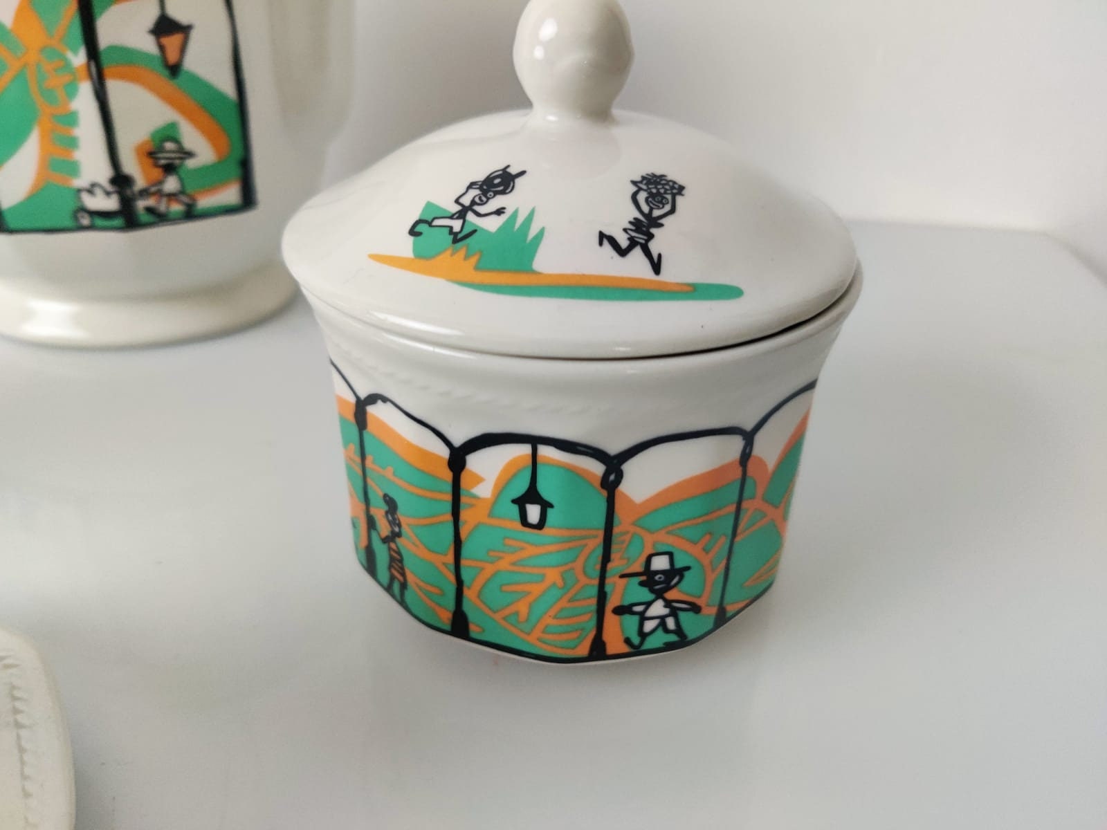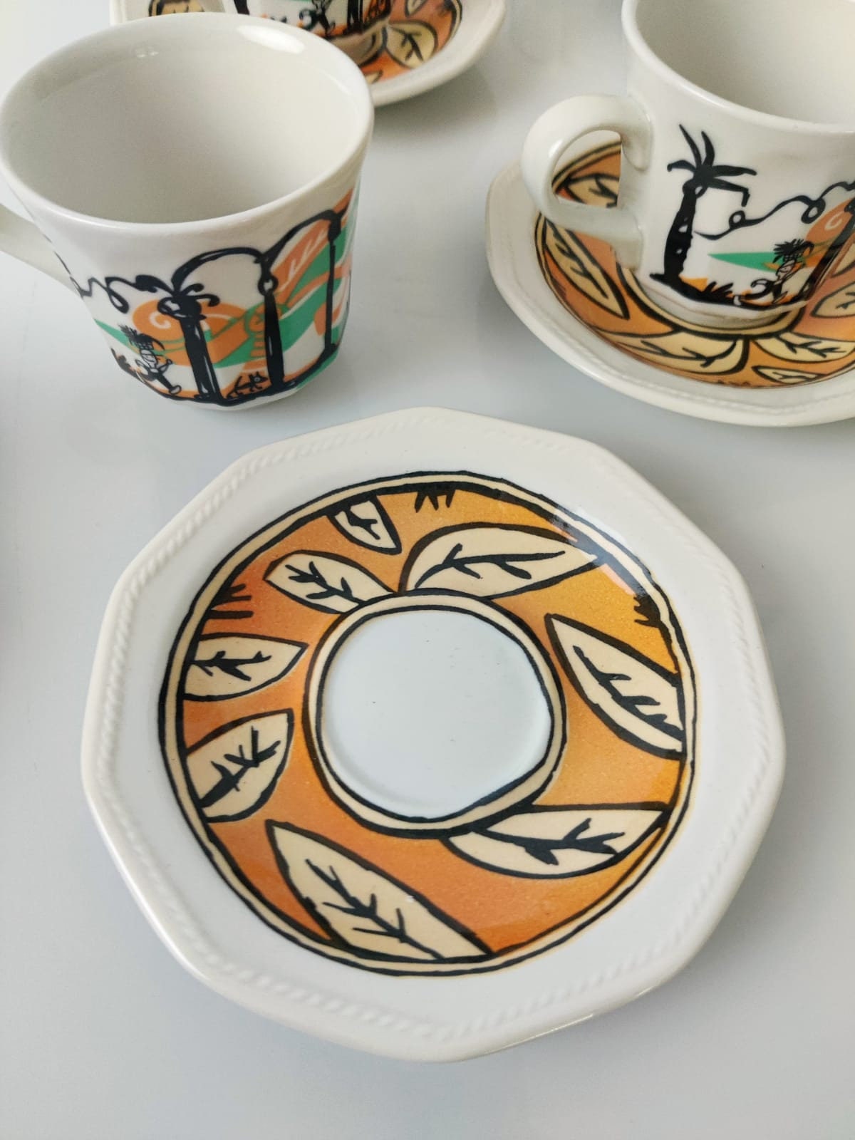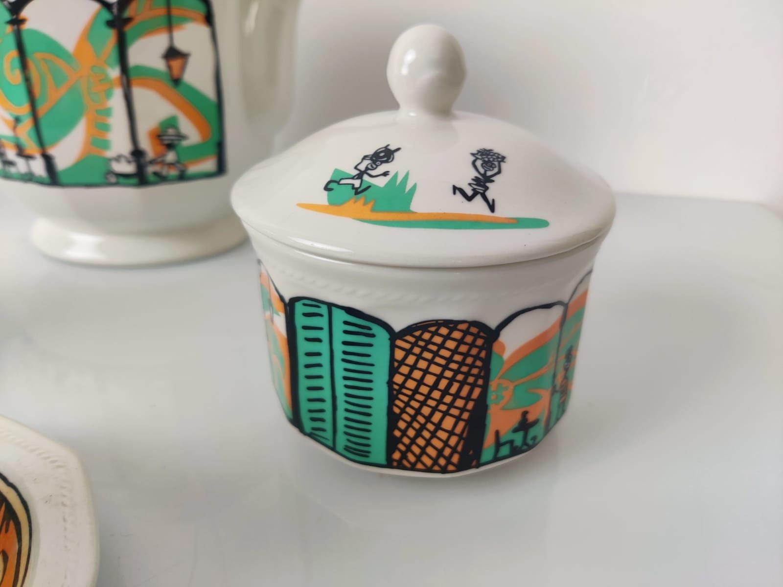 Maravilloso juego de café con diseños de Javier Mariscal, en tonos verdes y naranjas realizado en porcelana inglesa por la casa Churchill Dimensiones: Jarra: 18 cm – Plato 12 cm – Taza: 9 cm