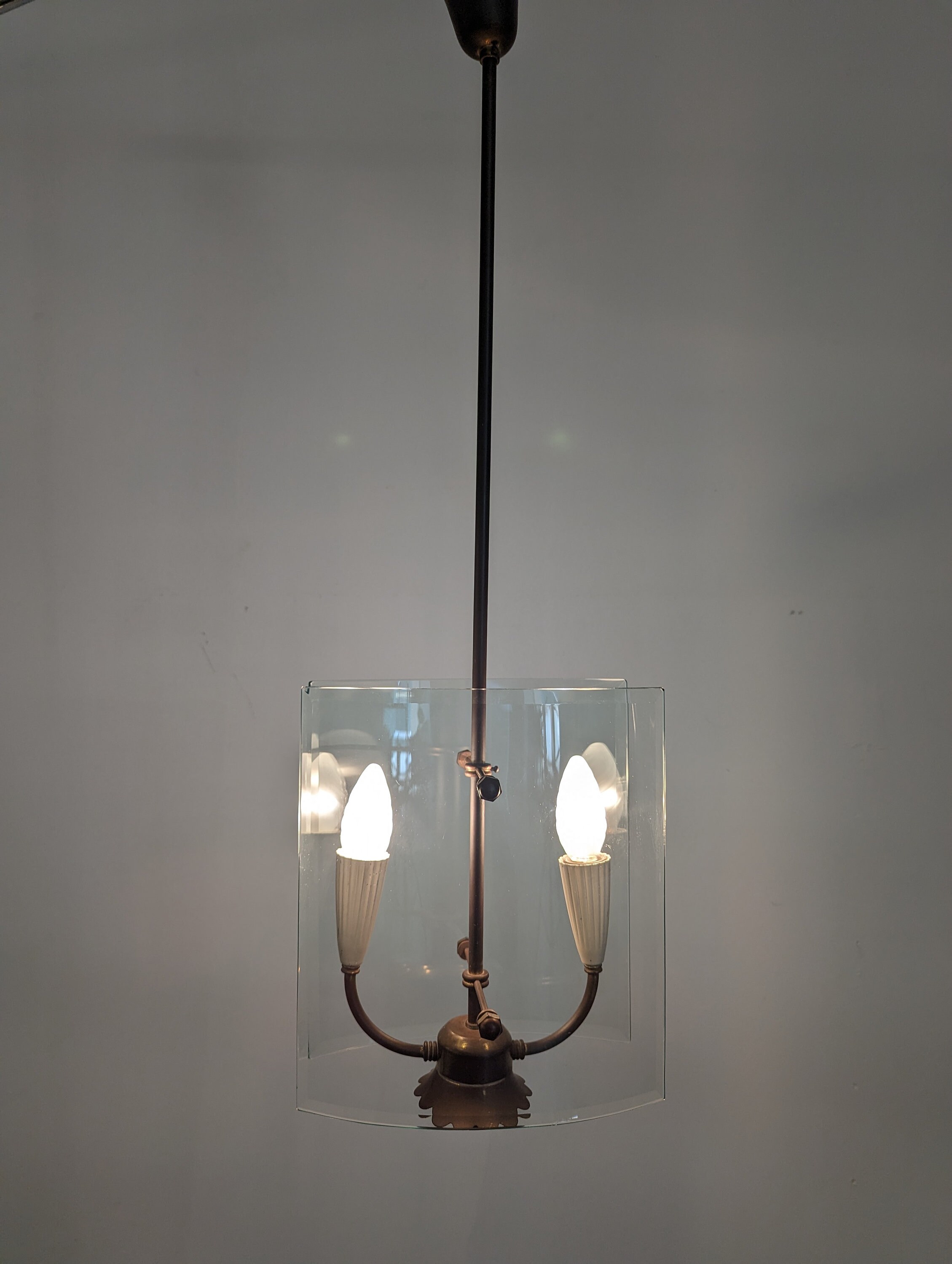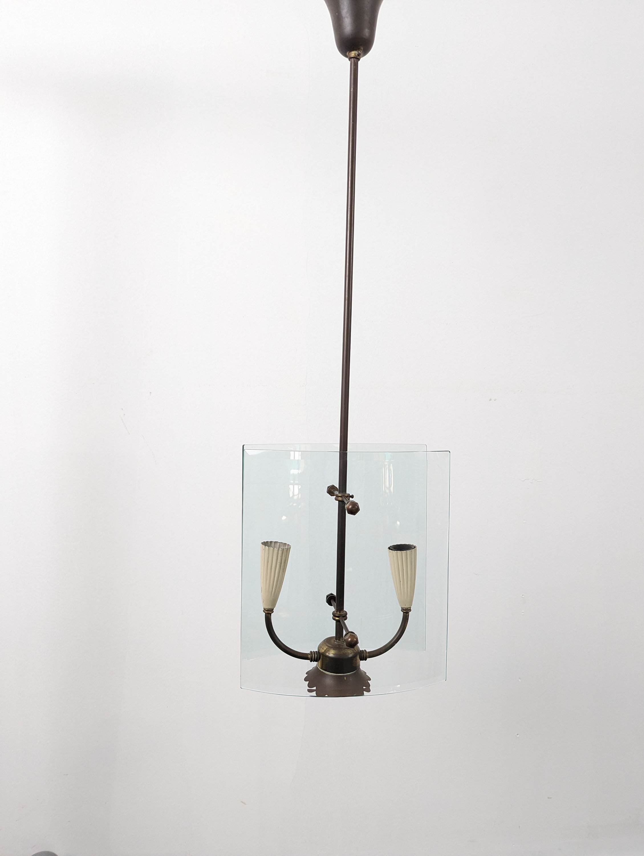 Elegante lámpara de diseño italiano de mediados de siglo, diseñada por Pietro Chiesa y fabricado por Fontana Arte en Italia, durante la década de 1940. La luz tiene dos paneles de cristal curvo enfrentados. Esta lámpara de techo es un ejemplo perfecto del diseño italiano descendiente de una eminente familia de artistas de Ticino. En 1932, Gio Ponti le pidió a Pietro Chiesa que participara en la dirección artística de la recién nacida Fontana Arte, un papel que le permitiría dar plena expresión a su estilo creativo diseñando más de mil objetos diferentes (muebles, mesas, lámparas, ventanas de vidrio, objetos de arte, etc.). Algunas de estas piezas pasaron a la historia del diseño y aún hoy son producidas por FontanaArte, como la mesa curva Fontana (1932), el jarrón Cartoccio (1932) y la lámpara de pie Luminator (1933). Esta hermosa pieza esta realizada en latón y aportara elegancia en cualquier sala de exquisito interior, complemento ideal para su sala de estar, sala familiar, sala de proyección o incluso la oficina, así como lobby de un hotel boutique, un bar de cócteles, un club de miembros o una boutique de lujo.