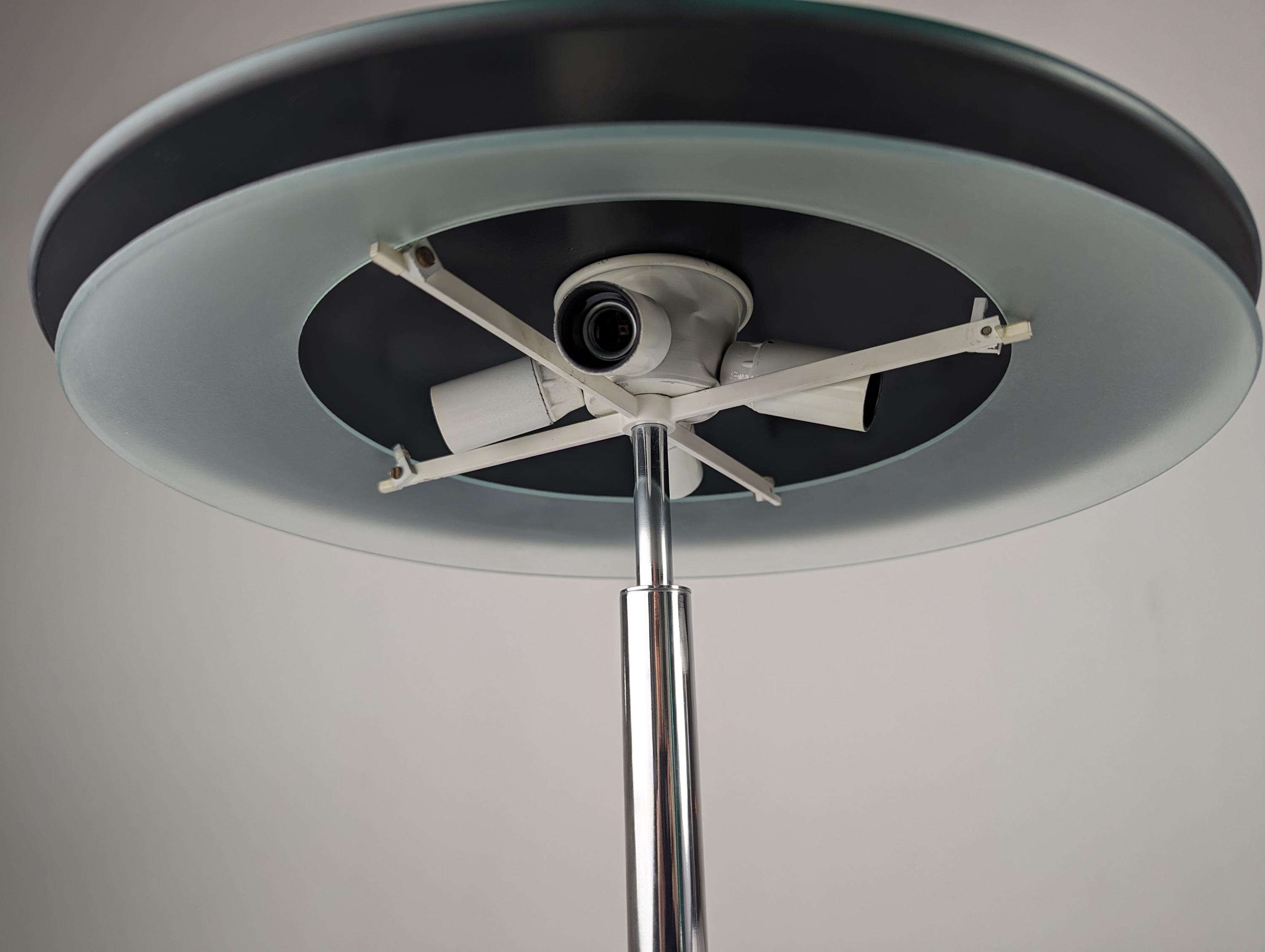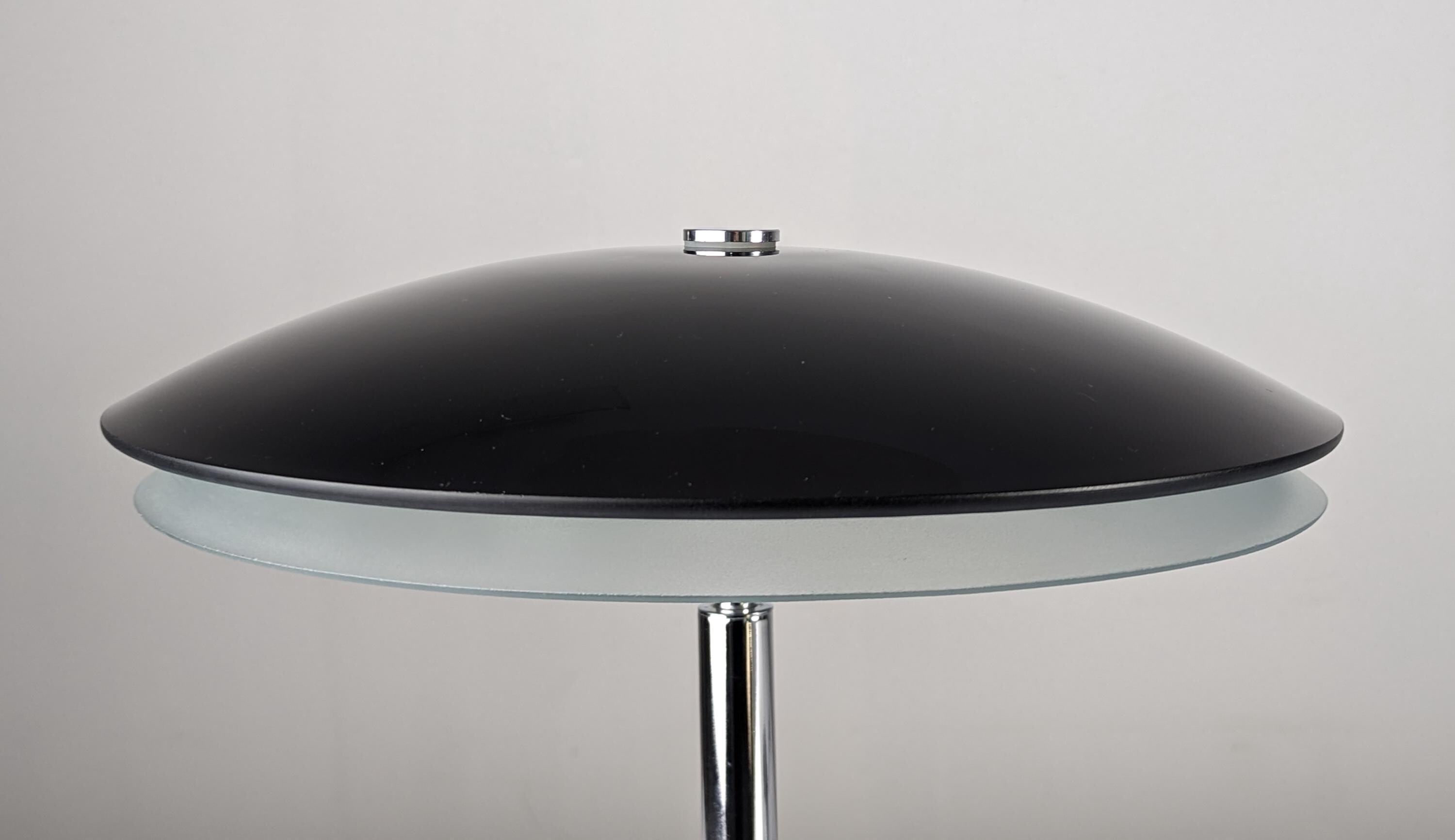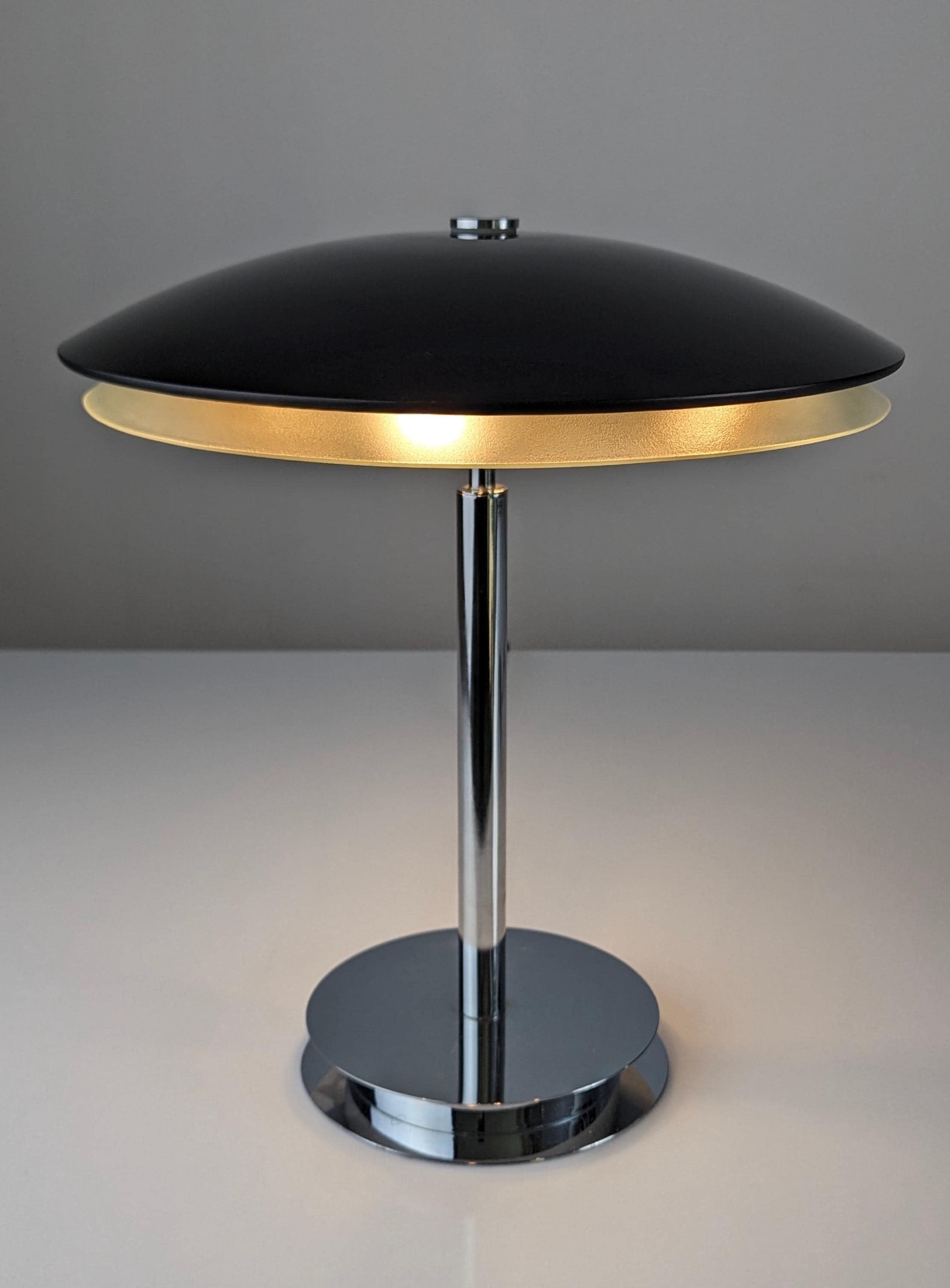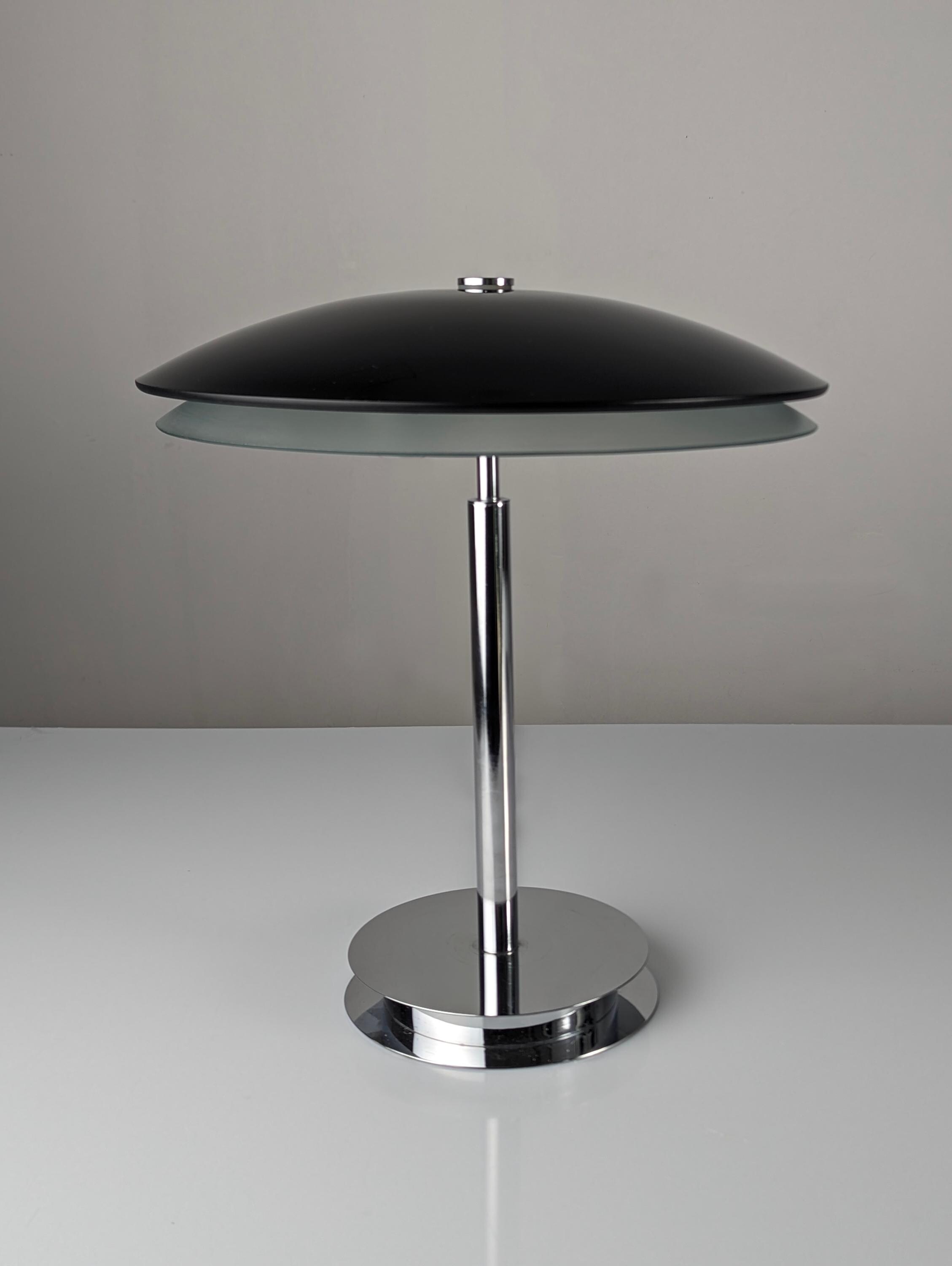 Elegante lámpara de mesa diseña por Fontana Arte en 1954. Base bromada con doble cristal curvado superior en negro e inferior blanco translucido que muestra una agradable luz.