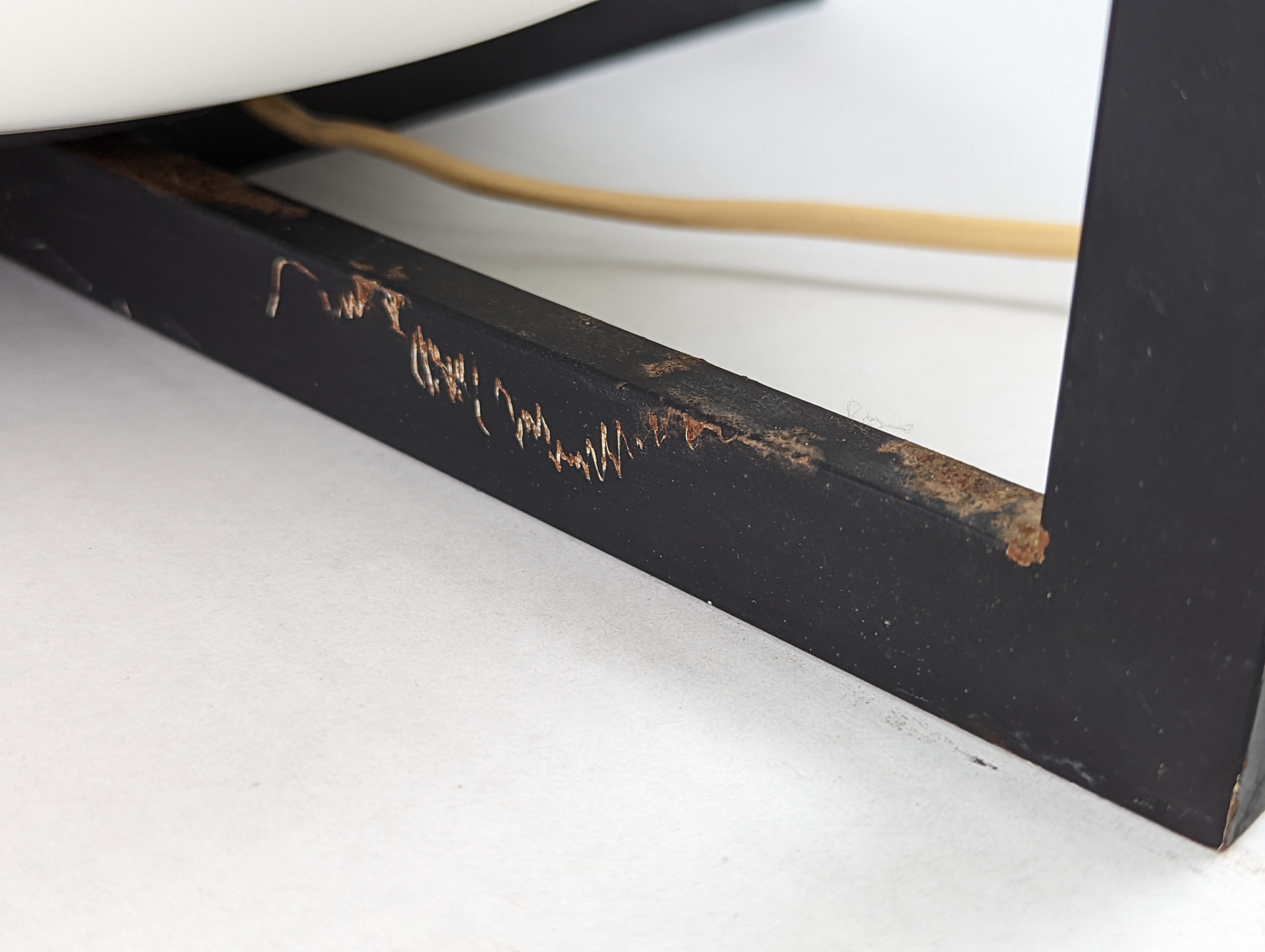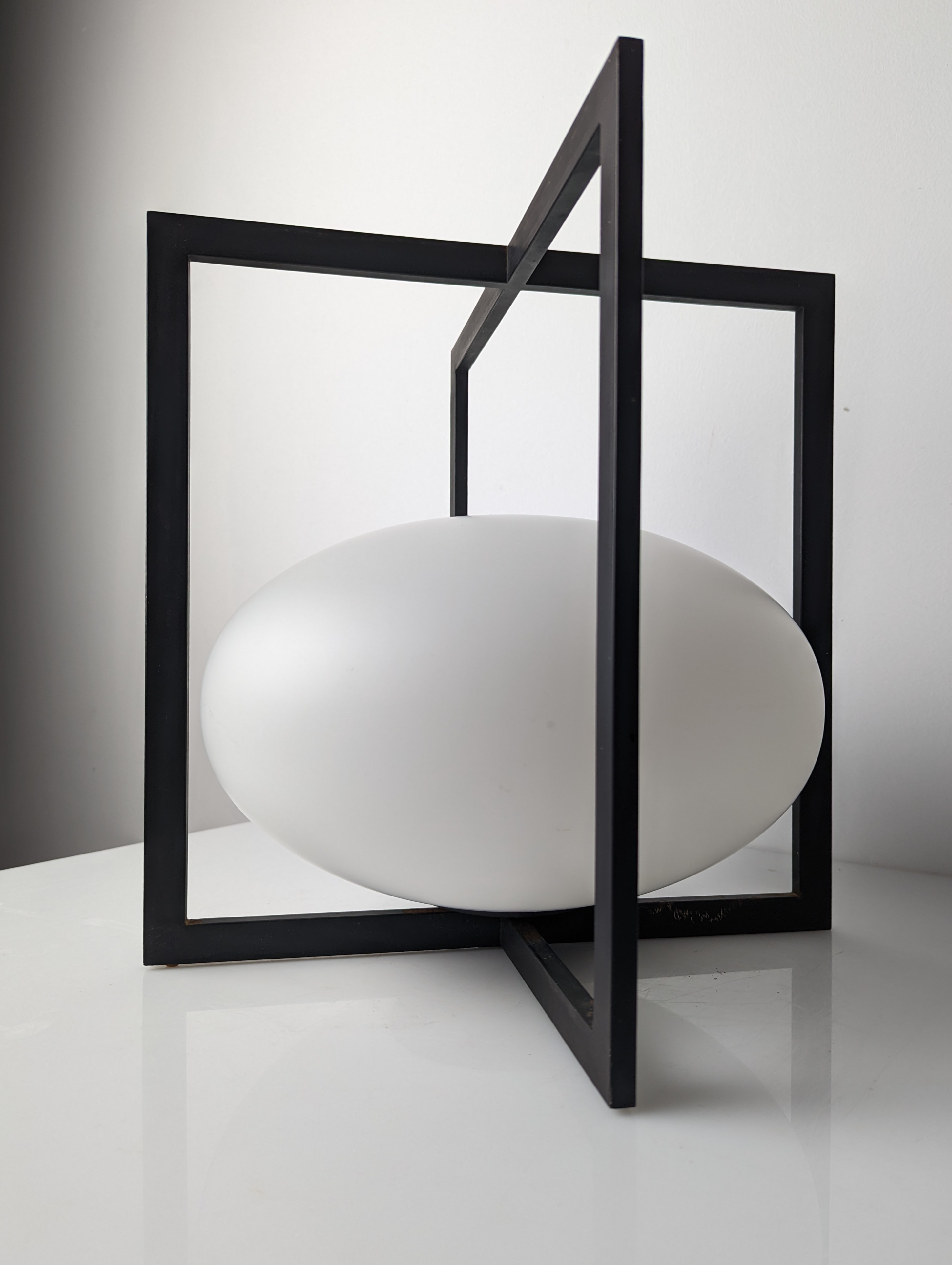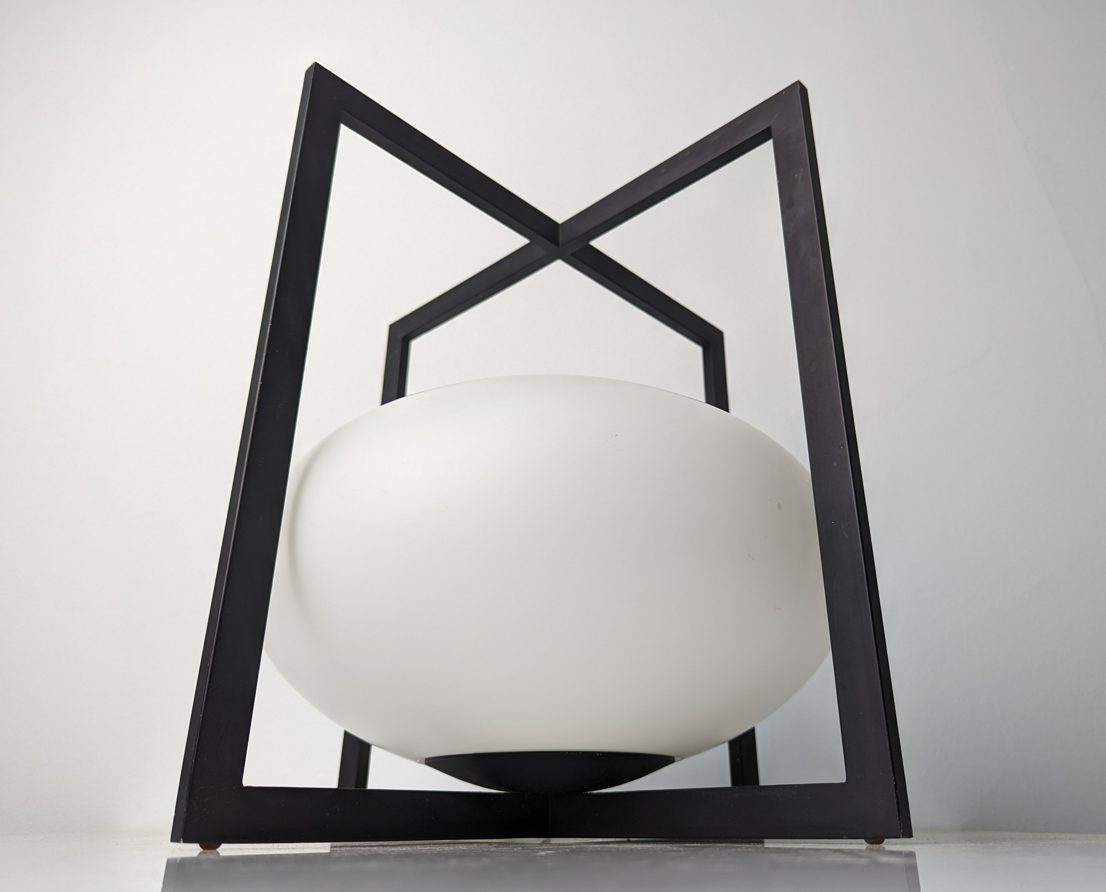 Esta arquitectónica lámpara de mesa modernista europea, producida hacia la década de 1970, ejemplifica el rigor geométrico característico de la época. La lámpara de mesa presenta un diseño volumétrico compuesto por una estructura de jaula de metal negro mate que enmarca físicamente una esfera luminosa suspendida. El marco minimalista crea un vacío visual impactante, permitiendo que la forma interna parezca flotar dentro de los límites cúbicos. Esta pieza modernista europea se basa en el marcado contraste estético entre la rejilla de metal negro industrial y la curva orgánica del difusor central.
