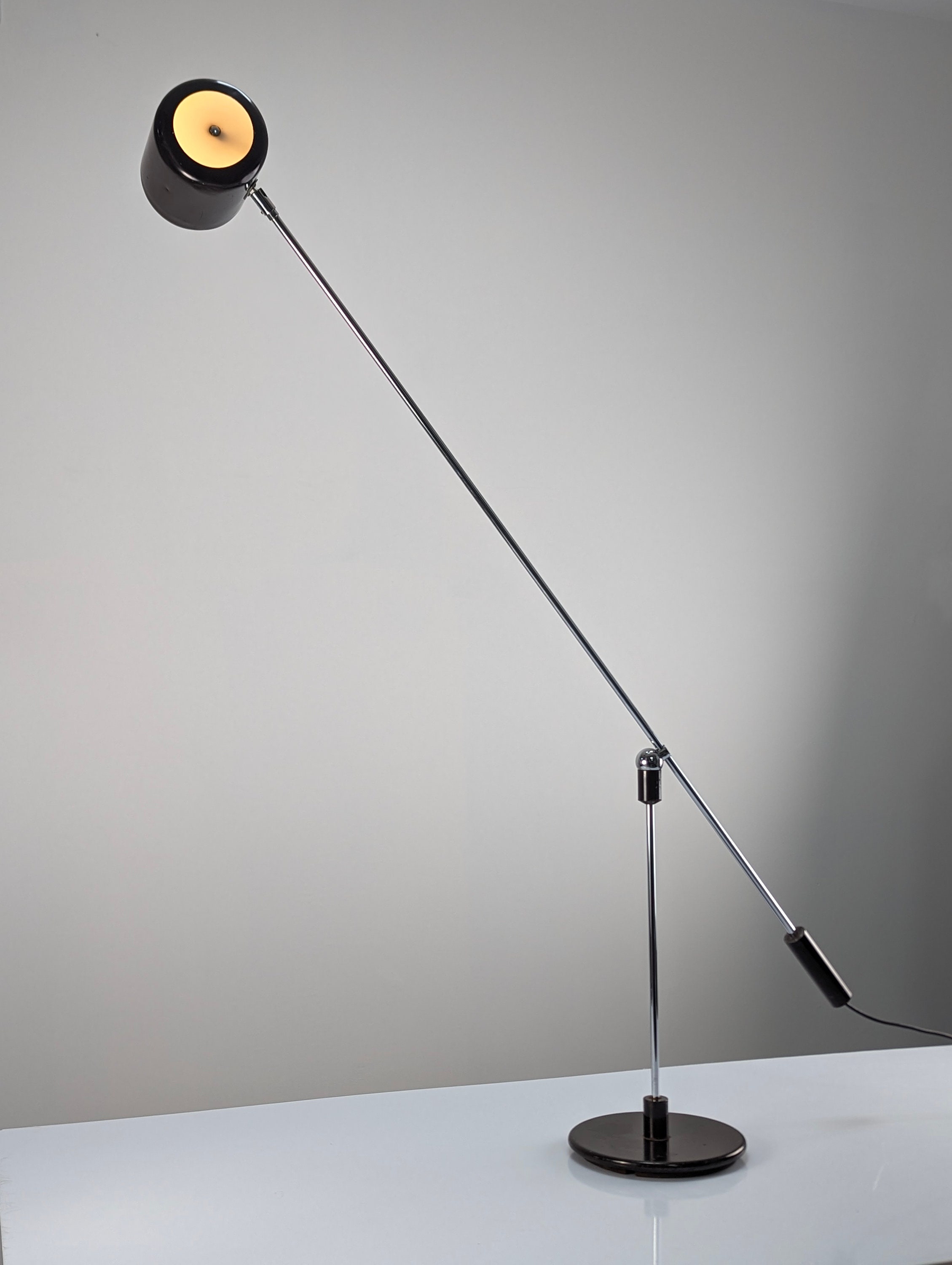 Única e inusual lámpara de pie Magneto, diseñada por Gilbert Watrous (1918-1991) para el concurso de diseño de 1951 organizado por el MOMA, el Museo de Arte Moderno de Nueva York. La lámpara fue producida por primera vez por la empresa estadounidense Heifetz y seguidamente también en los años 50 por la empresa holandesa Atelier Artiforte, liderada por Hendrik Fillekes (1918-1983), quien produjo algunas variantes de este maravilloso diseño atemporal y convirtiéndolo en una pieza realmente especial ya que fue fabricada en un corto periodo de tiempo durante los años 50 con una producción muy escasa y un montaje realizado a mano.