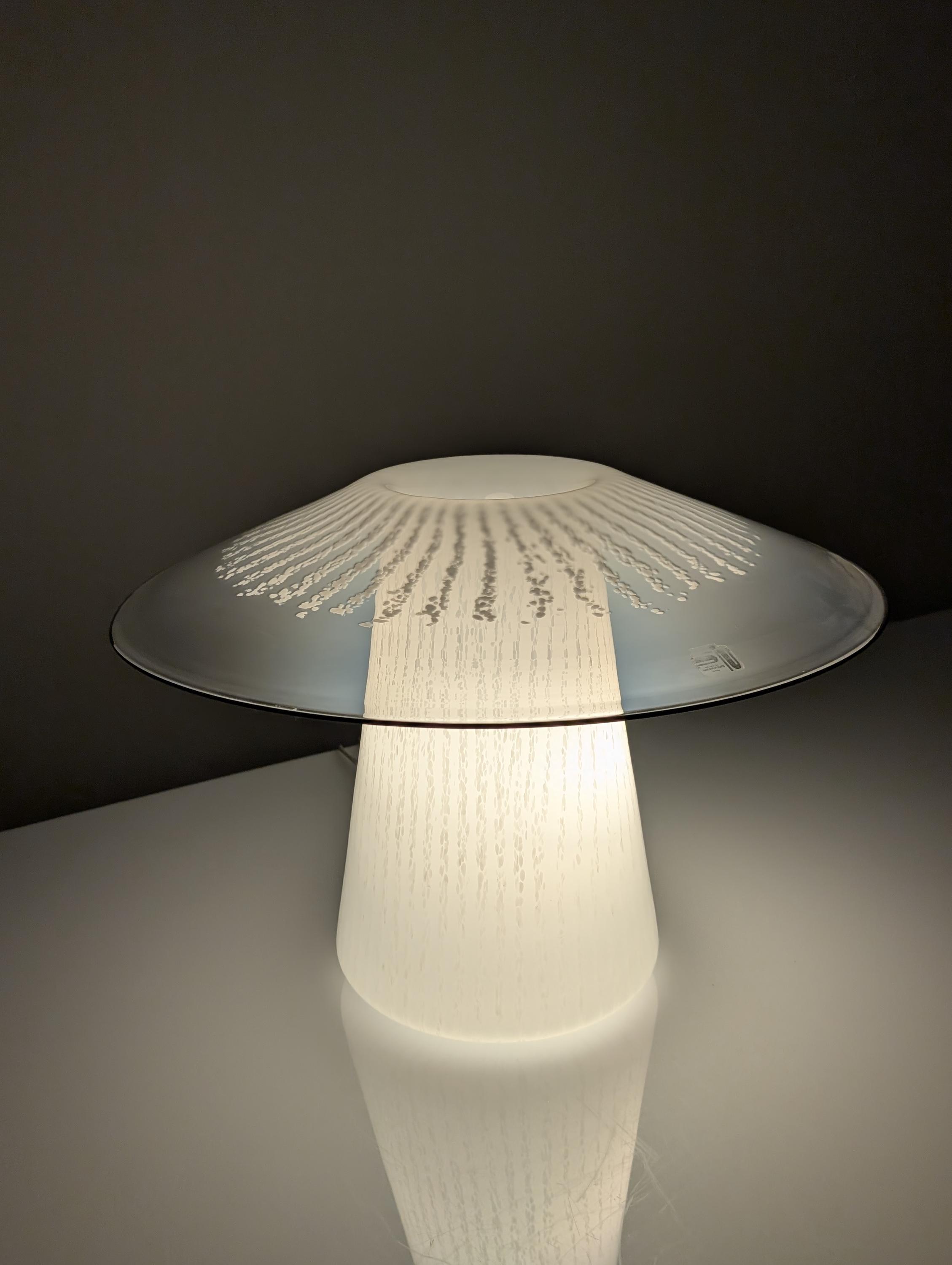 Lámpara de sobremesa realizada en cristal de Murano que evoca la elegancia de la silueta en forma de seta tan característica en los mejores diseños de mediados y finales del siglo 20th, destacando su exclusivo patrón lineal blanco conocido como efecto medusa. Diseñada en las décadas de 1980, esta pieza combina líneas suaves y fluidas con un vidrio de murano opalino trabajado magistralmente, cuya textura interior emula delicados patrones orgánicos. La fusión entre la base opaca y la transparencia superior realza la interacción de la luz, creando un juego atmosférico que transforma cualquier espacio en un entorno elegante y distinguido. Conserva su etiqueta original de fabricación por parte de un pequeño productor artesanal en Murano, el cual tuvo una producción bastante escasa convirtiendo esta pieza en una obra super exclusiva de la destacada calidad artesanal Italiana del siglo 20th.