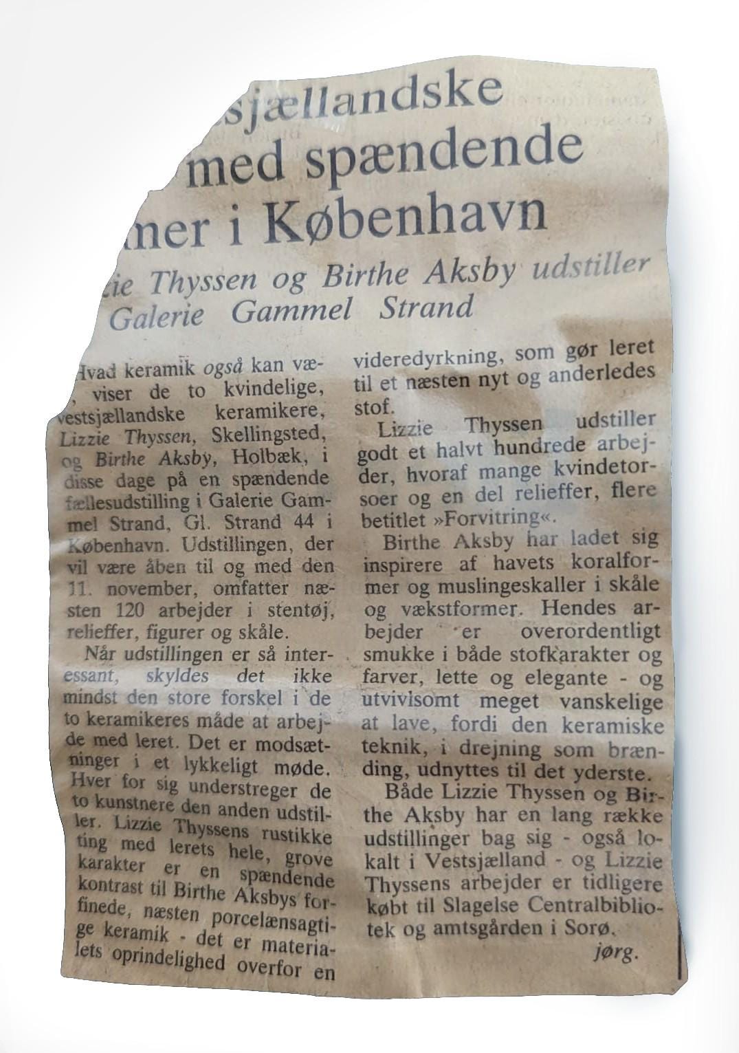 Birthe Aksby, activa en Dinamarca durante la segunda mitad del siglo XX, es reconocida por su dominio de la cerámica fina y su exploración de formas inspiradas en la naturaleza. Junto a esta maravillosa pieza, se encontraba un recorte de periódico donde se habla de su trabajo exhibido en la Galerie Gammel Strand de Copenhague junto con la ceramista Lizzie Thyssen en una exposición destacada por su refinamiento técnico y su aproximación innovadora al material. Por lo que es muy probable que estemos antes una de las piezas expuestas en esta exposición. Esta pieza, titulada Lysskulptur, Vaekst (Escultura de Luz, Crecimiento), refleja su maestría en la fusión de arte, funcionalidad y la luz.