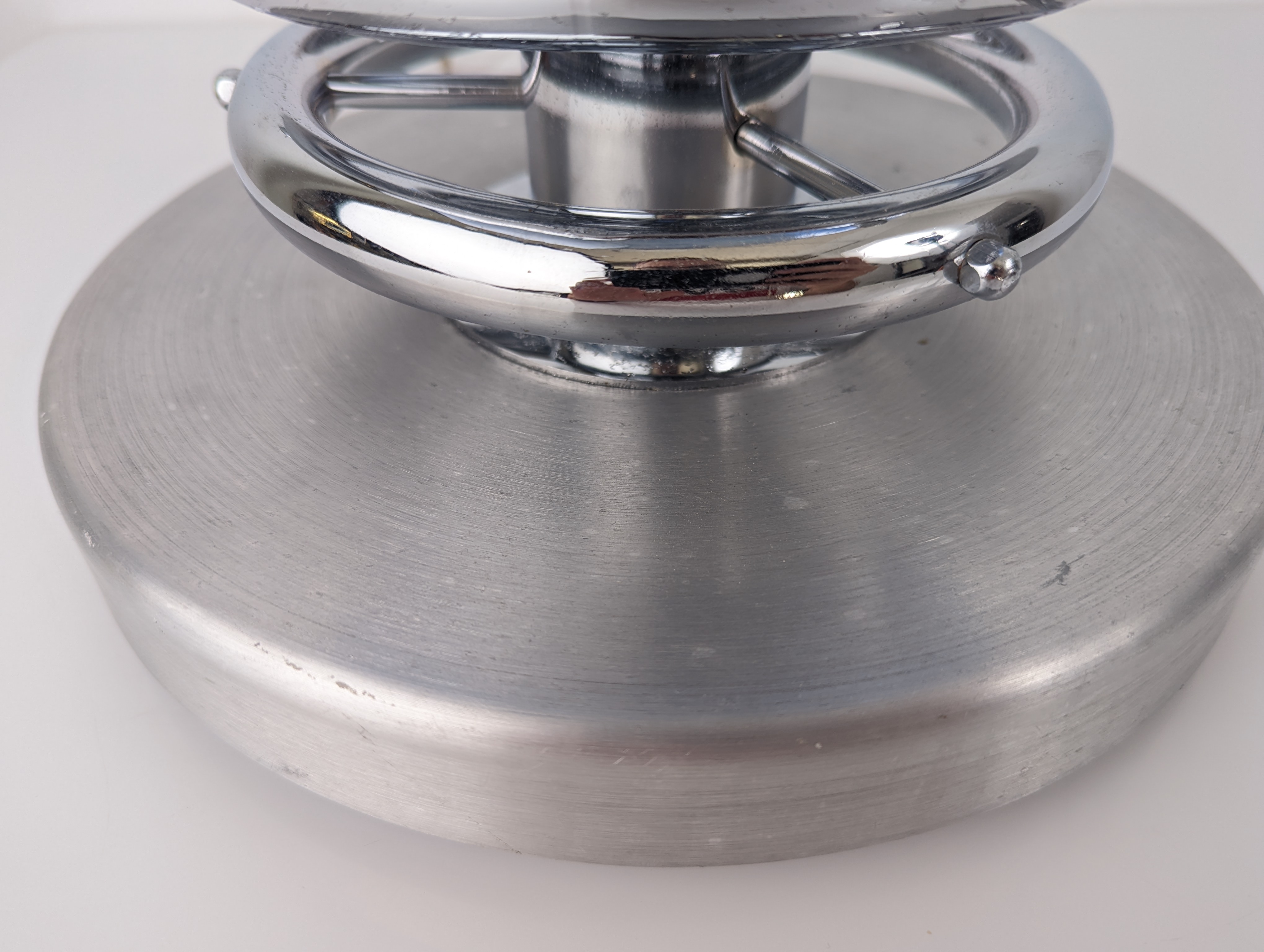 Lámpara de mesa con cristal azul soplado diseño de Toni Zuccheri de los años 70, que muestra la naturaleza experimental del diseño de iluminación italiano. Esta lámpara de mesa presenta una sustancial esfera de cristal de Murano soplado donde un exterior azul translúcido rodea una capa interna blanca opaca, creando el efecto de “membrana” suspendida que distingue a esta serie. Posicionada sobre una base de cromo pulido con forma de resorte helicoidal, la pieza ofrece un contraste estructural entre el soporte de metal industrial y el fluido difusor de vidrio bicolor. La luz irradia a través del espesor variable de las capas para revelar la compleja profundidad y la separación de colores lograda por Toni Zuccheri en esta composición. El objeto sigue siendo un ejemplo significativo de la estética de la era espacial a menudo asociada con fabricantes como VeArt o Venini durante este período. La combinación de la bobina metálica y la forma de vidrio orgánico define la presencia escultórica de esta lámpara de mesa de Toni Zuccheri dentro de un contexto de mediados de siglo. Adaptamos la lámpara para uso de 110v en EEUU bajo pedido de forma gratuita.
