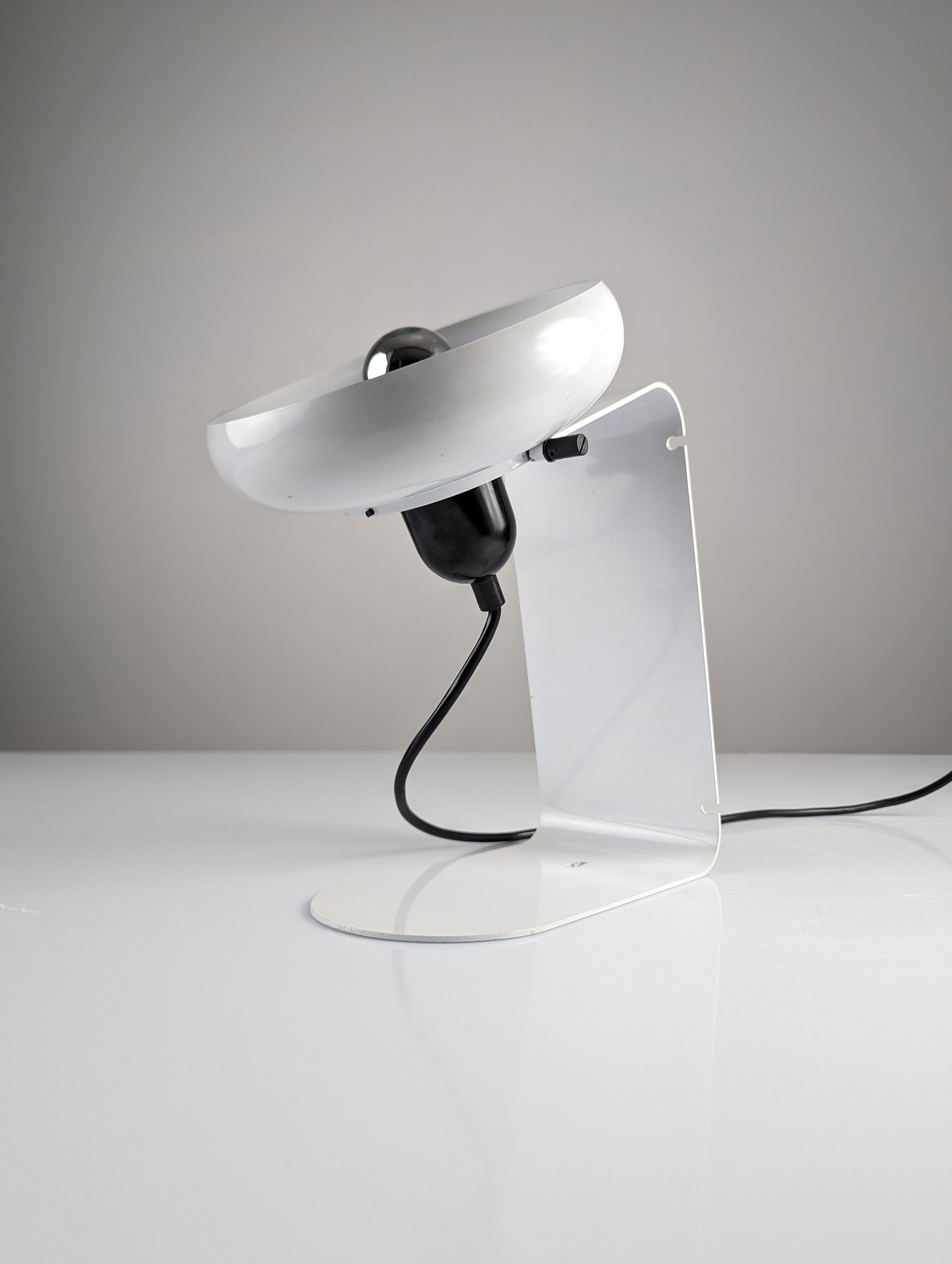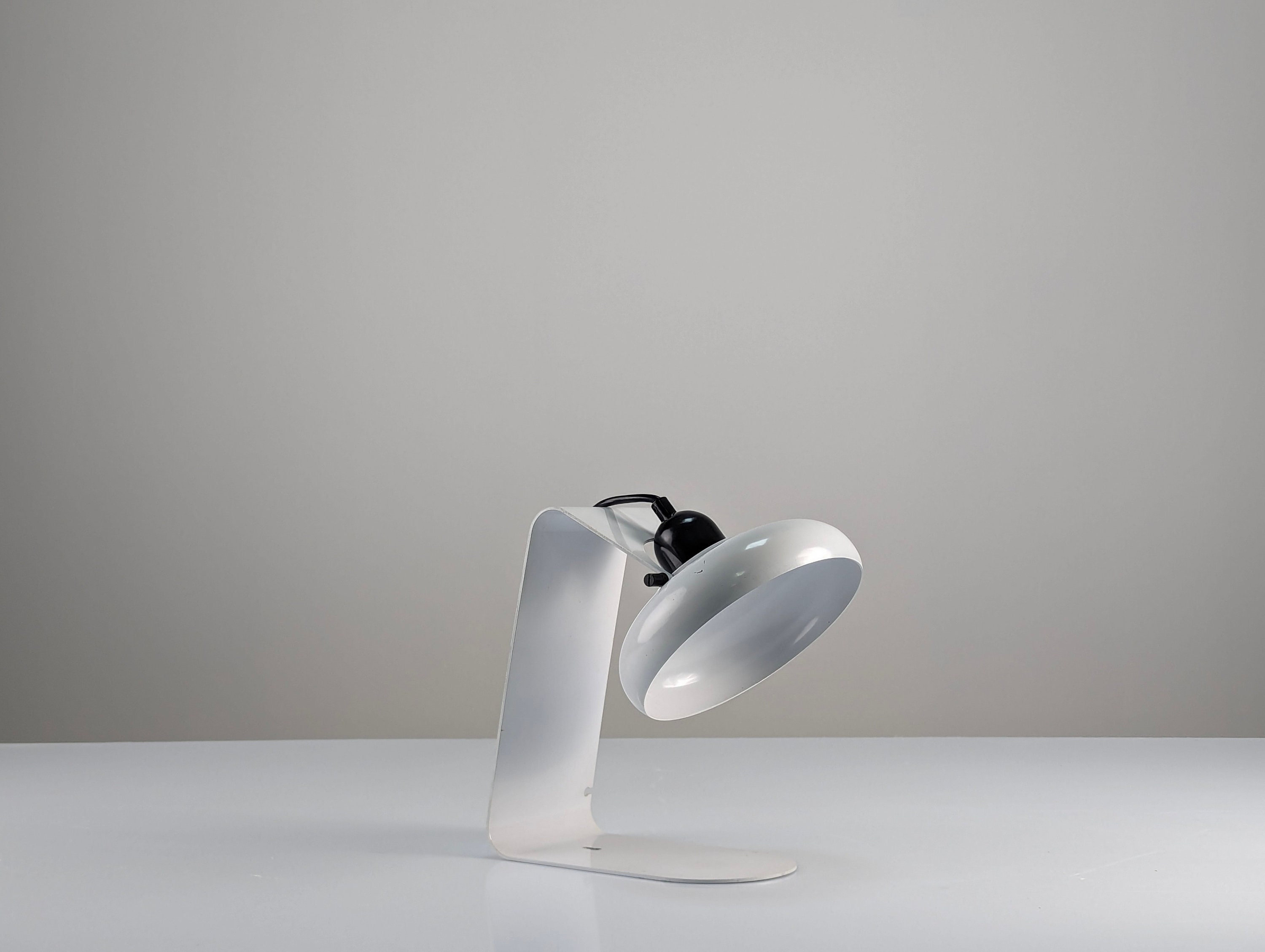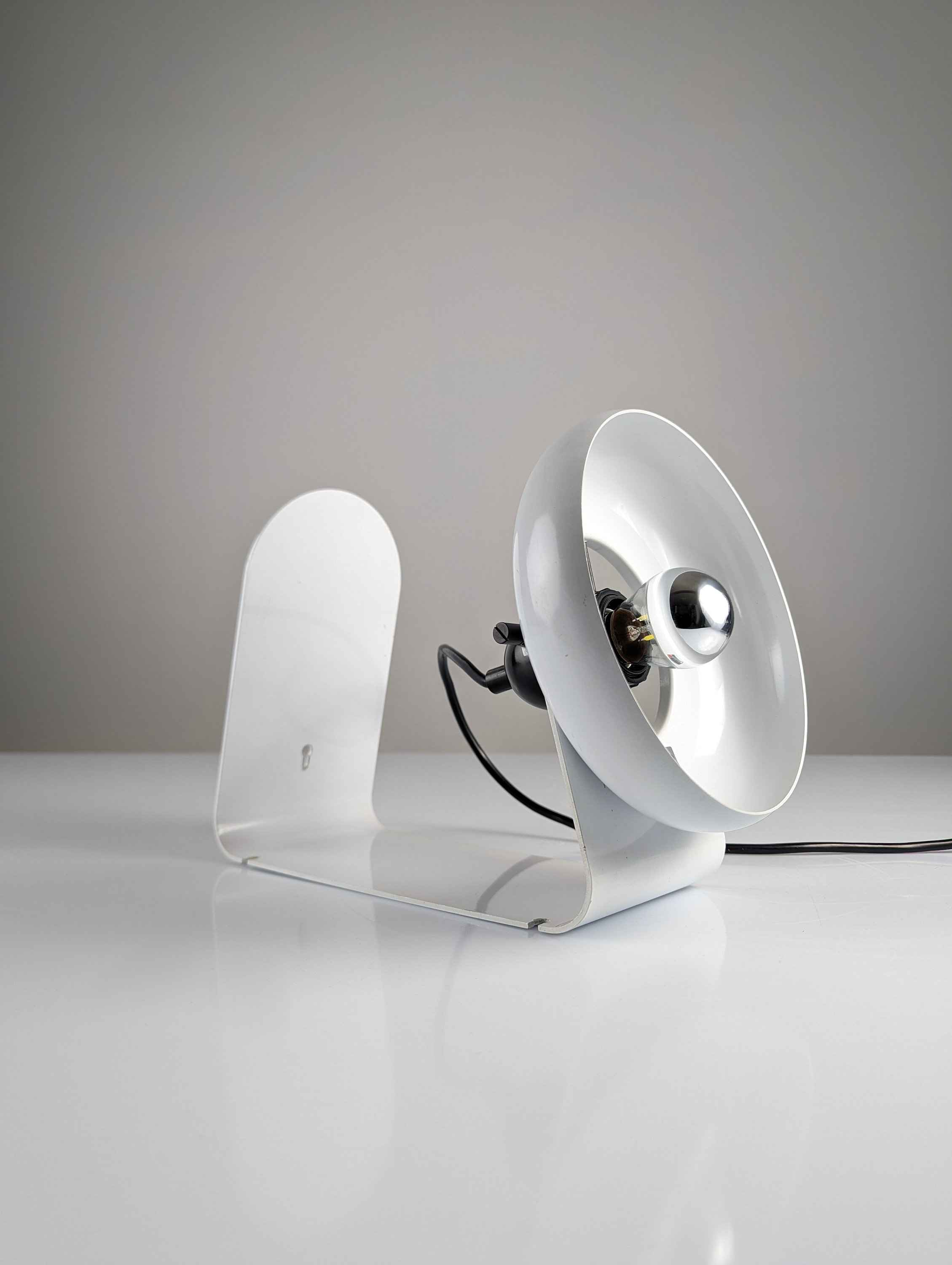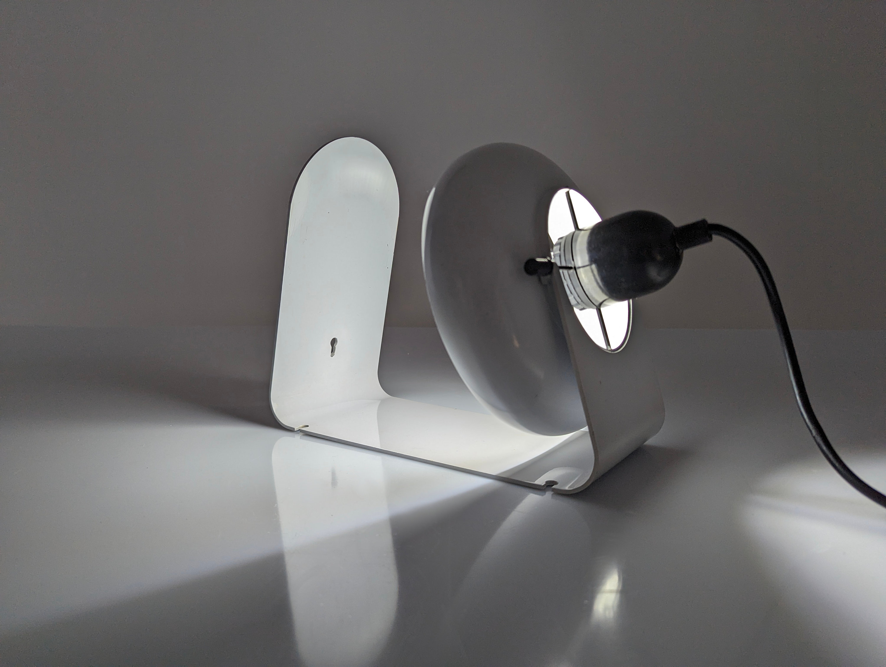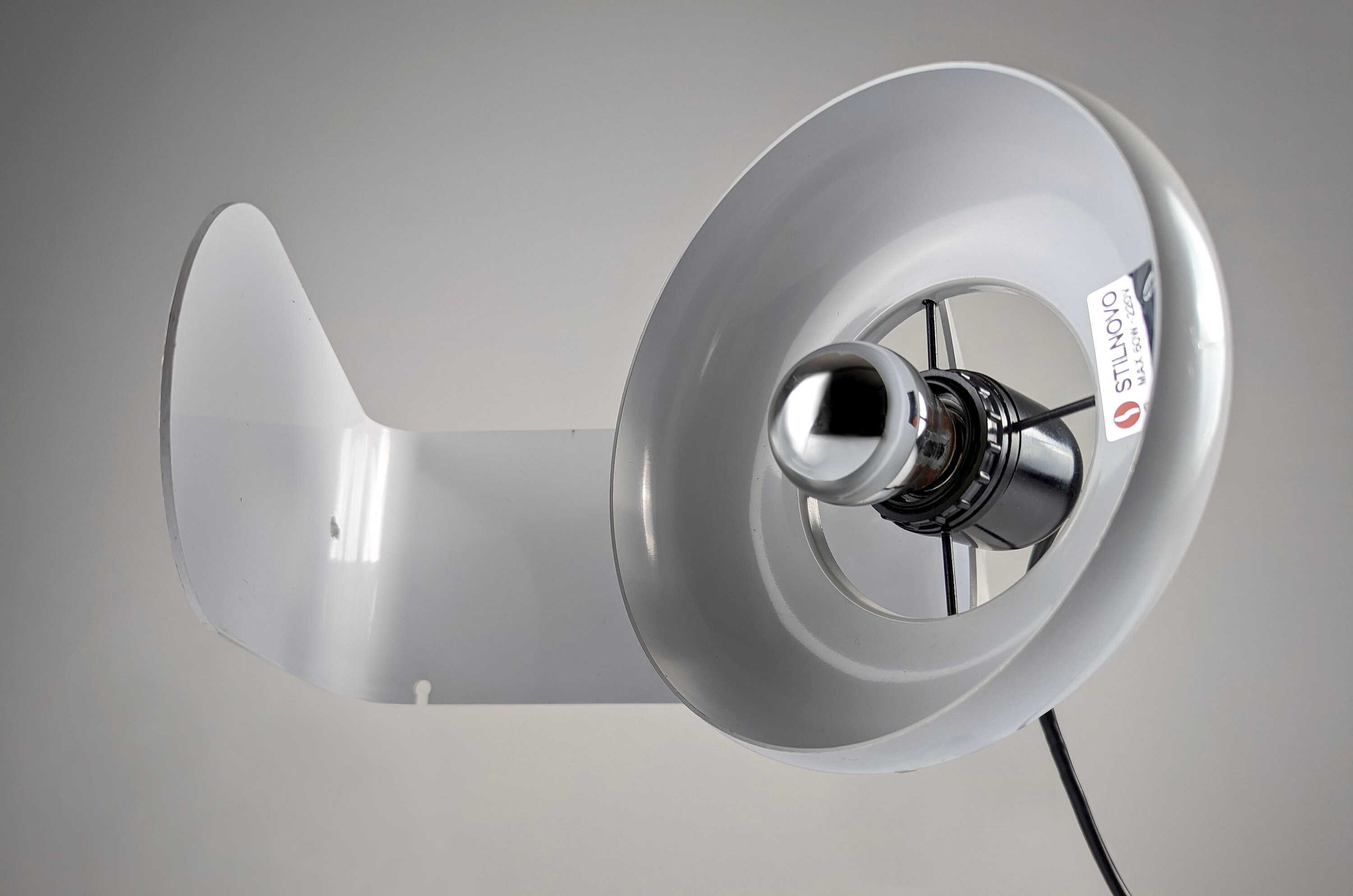 Lámpara diseñada por la prestigiosa casa italiana Stilnovo. Este modelo extremadamente raro muestra un diseño multifuncional como lámpara de mesa o pared a modo de aplique o incluso lámpara de trabajo, ofreciendo una infinidad de posibilidades lumínicas y decorativas.