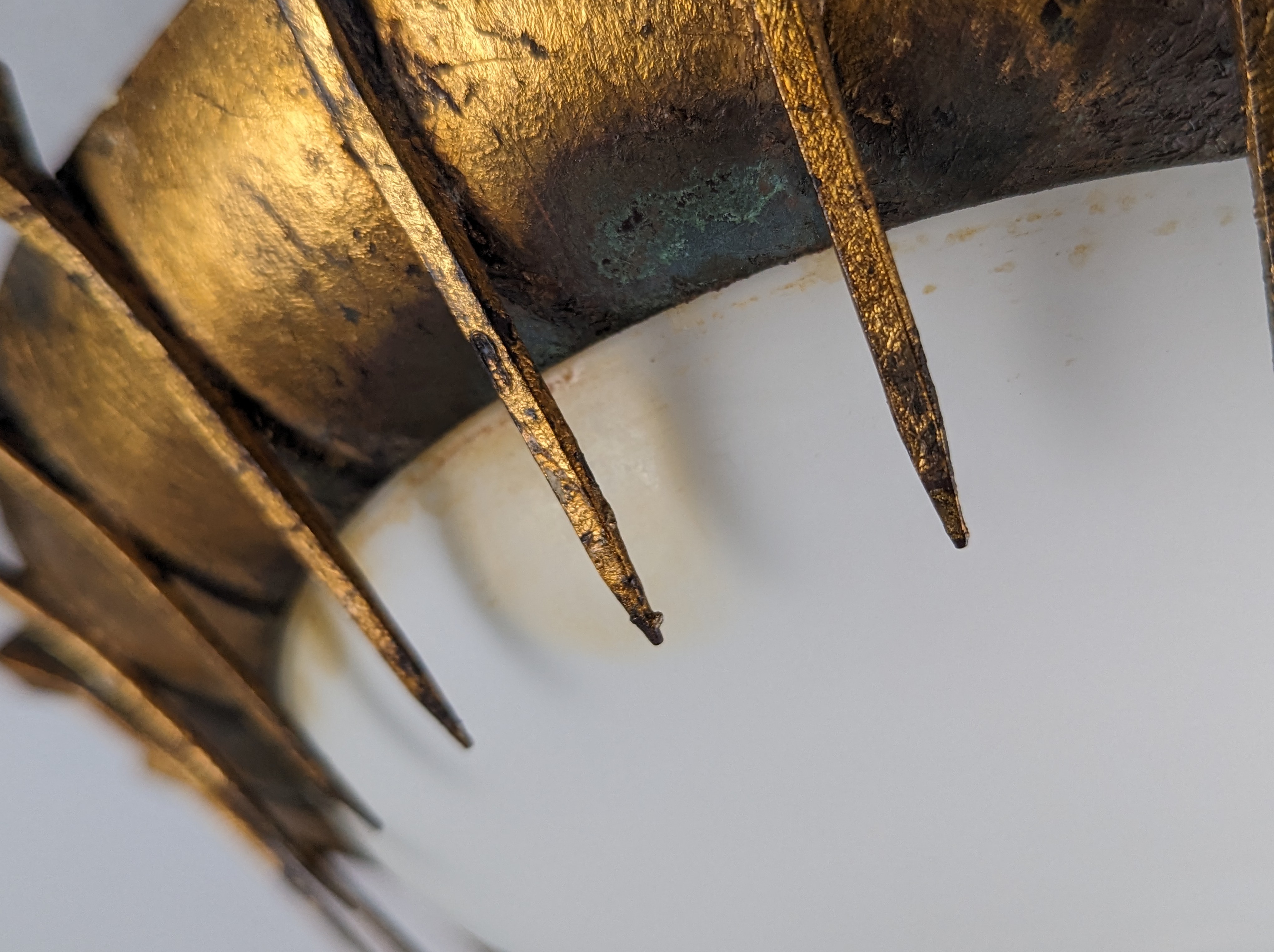 Lámpara de techo francesa completamente original de mediados de siglo con un fantástico diseño de sol que transmite elegancia y carácter a cualquier estancia gracias al formidable trabajo artesanal de clavos forjados perfectamente colocados y tratados con pan de oro. Conserva una hermosa pátina que aporta calidez y originalidad a la pieza, algo que solo el paso del tiempo puede conseguir. Convirtiendo una hermosa lámpara en un objeto vivo que transmite solo con mirarlo. Esta lámpara también puede ser utilizada como lámpara de pared realmente espectacular.