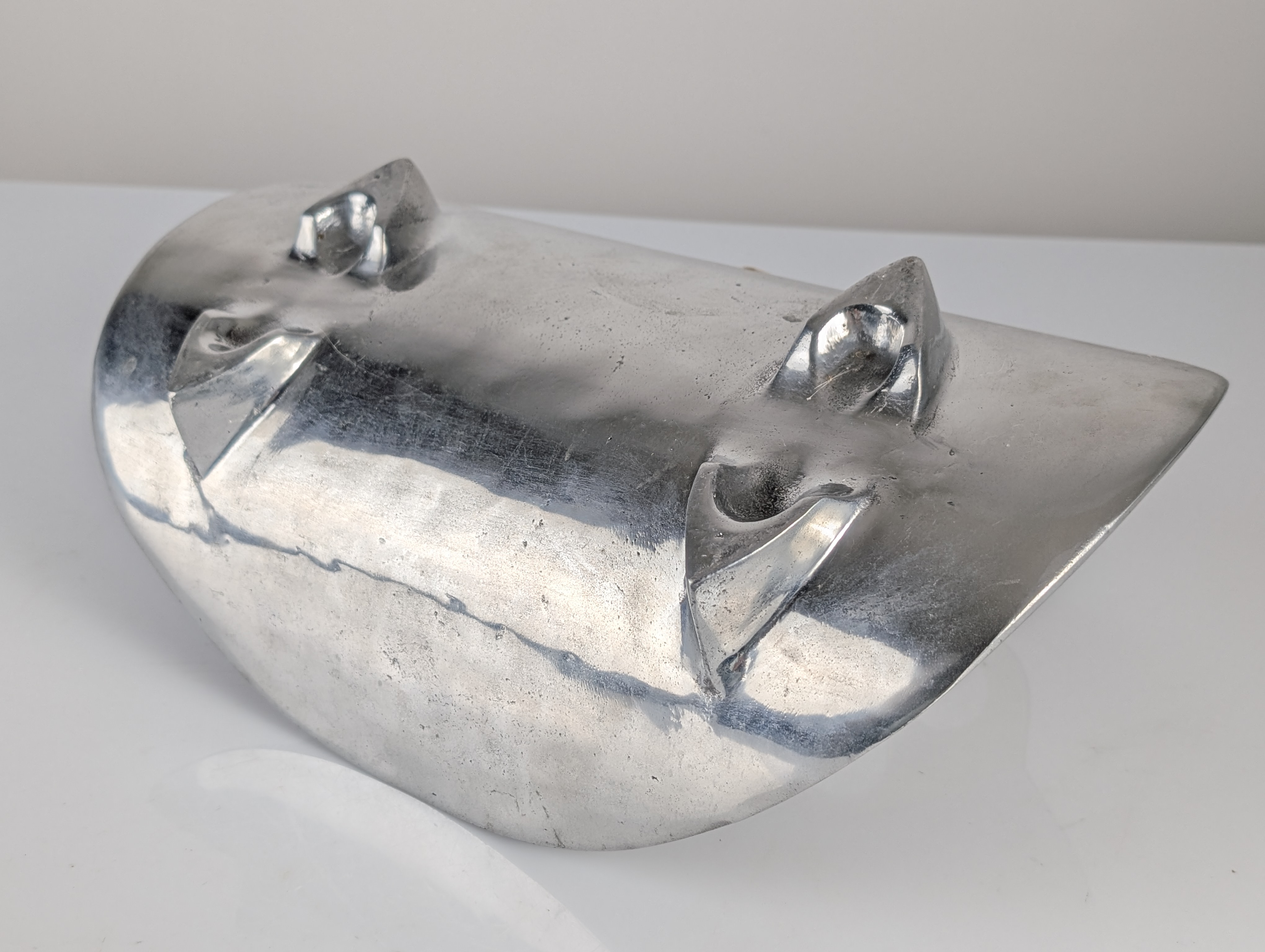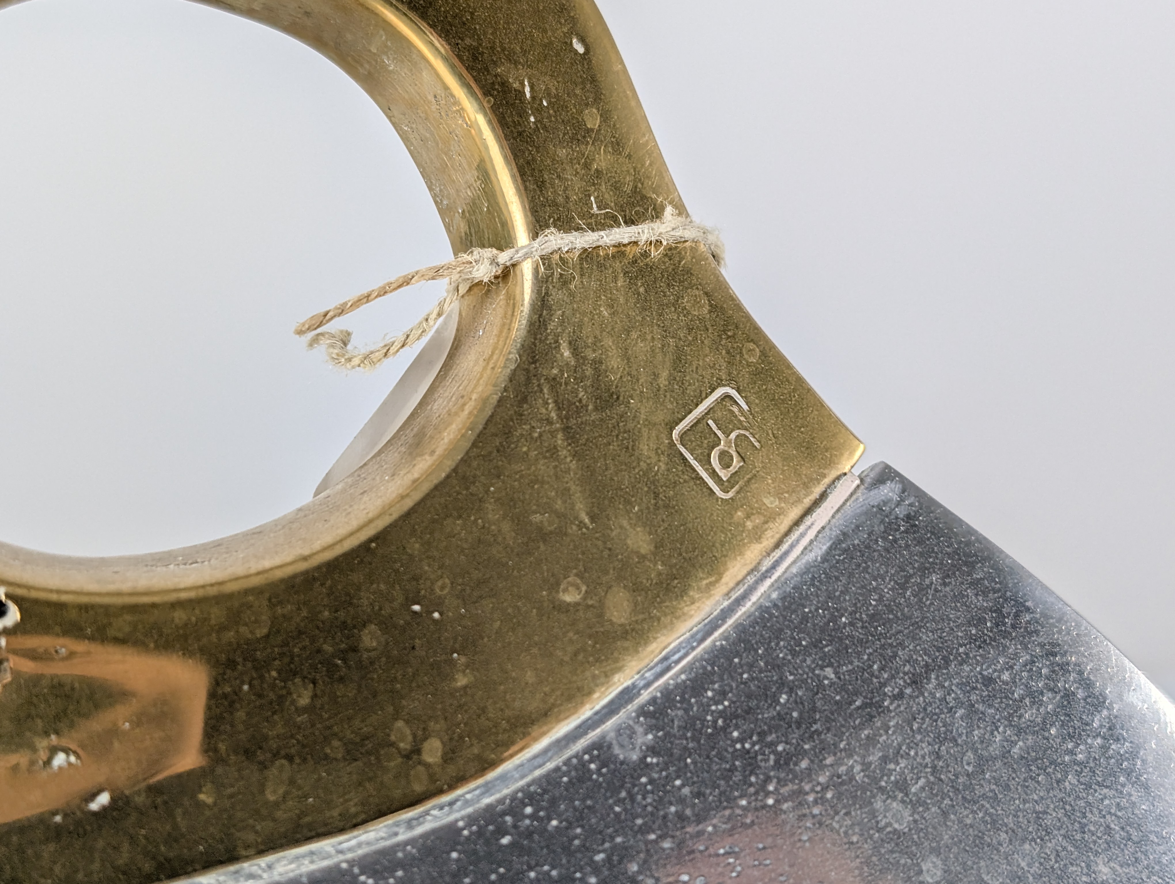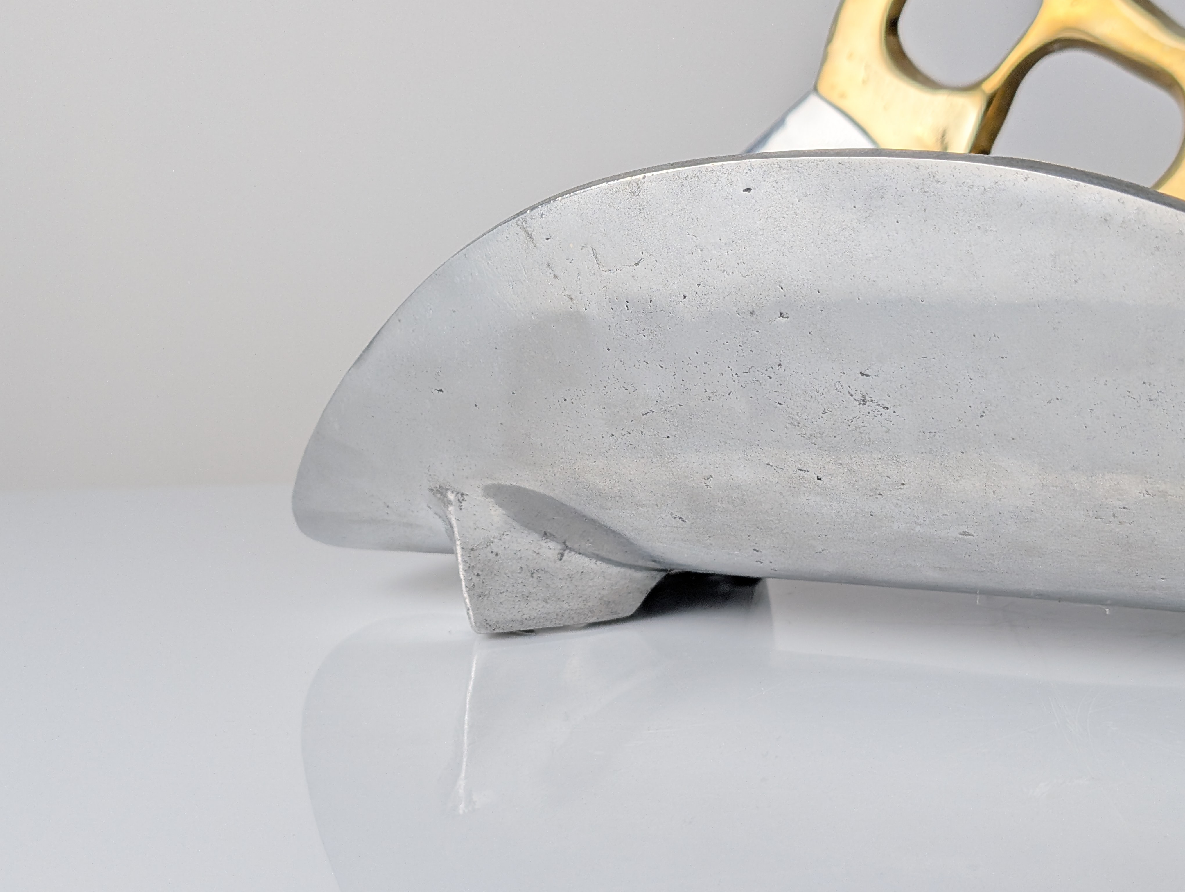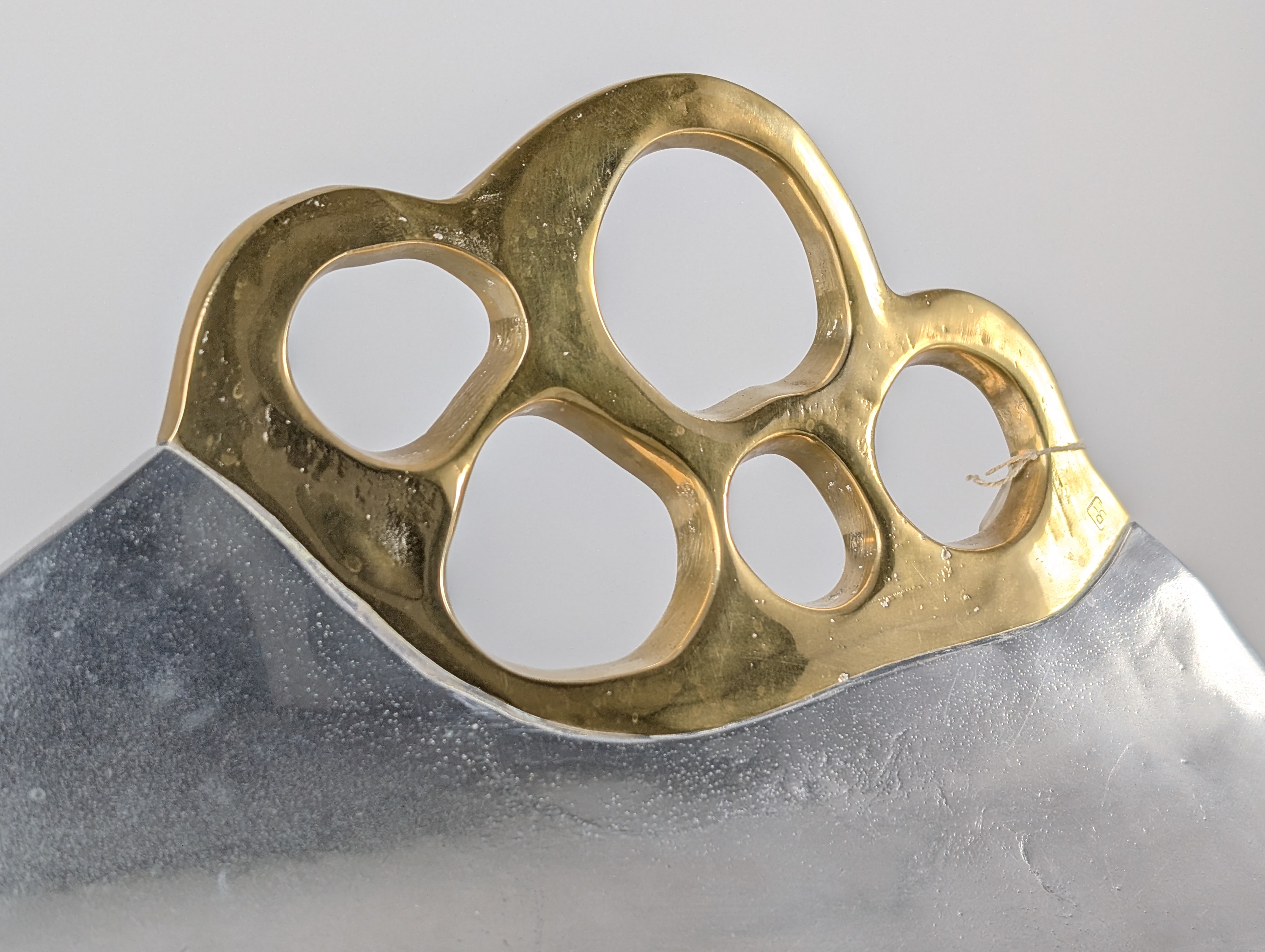 Leñero vintage escultural diseñado por David Marshall, fabricado en España durante los 1980s. La pieza está construida a partir de aluminio fundido que forma una cuna robusta y elegantemente curvada. Integrado en el cuerpo hay un asa de latón forjado a mano, definida por una estructura orgánica con múltiples aberturas que crea un fuerte contraste material y cromático contra el aluminio texturizado. El diseño refleja la mezcla característica de Marshall entre estética brutalista y formas orgánicas. La pieza está sellada físicamente con la marca del artista y se acompaña de su certificado de autenticidad.
