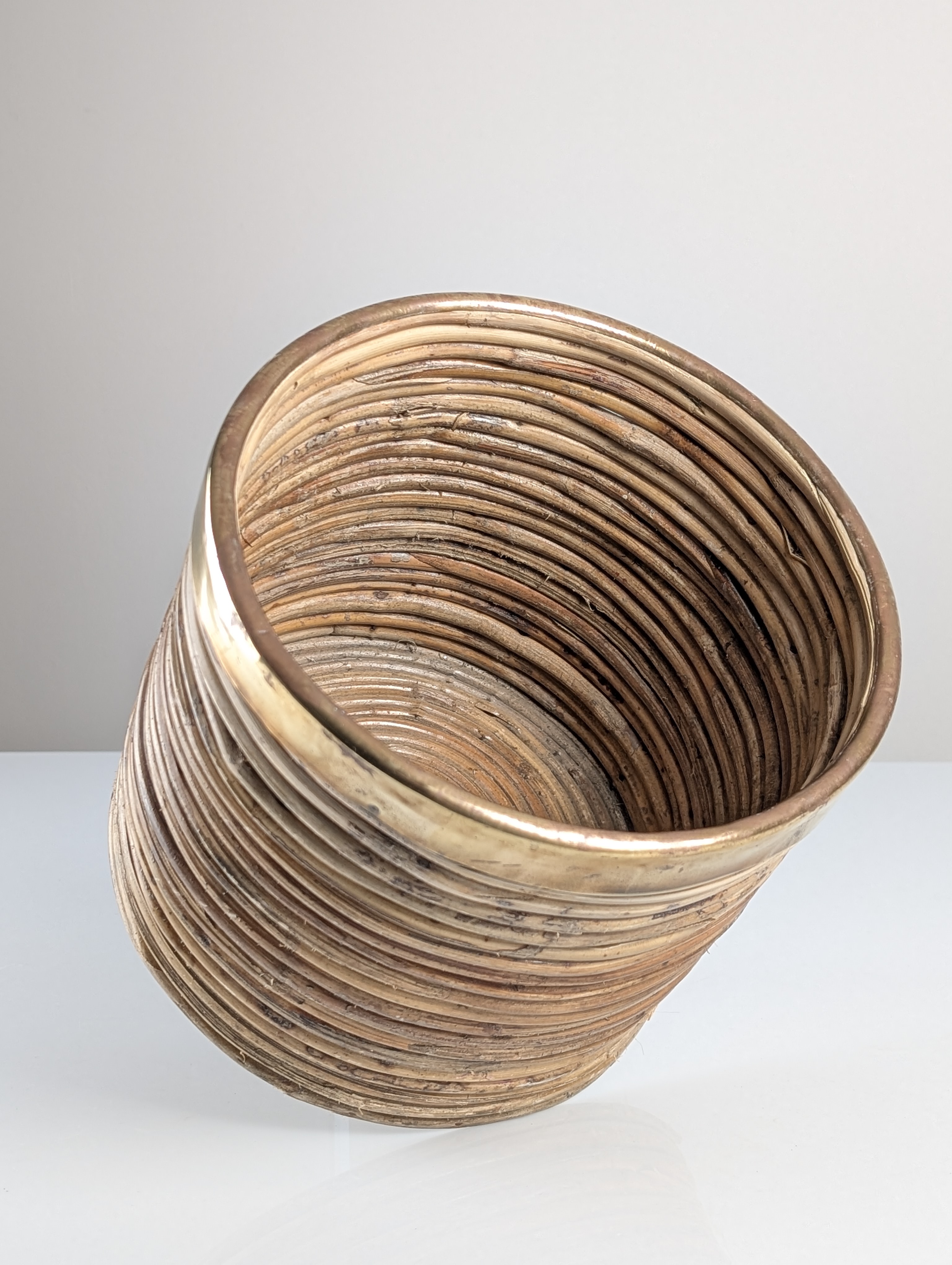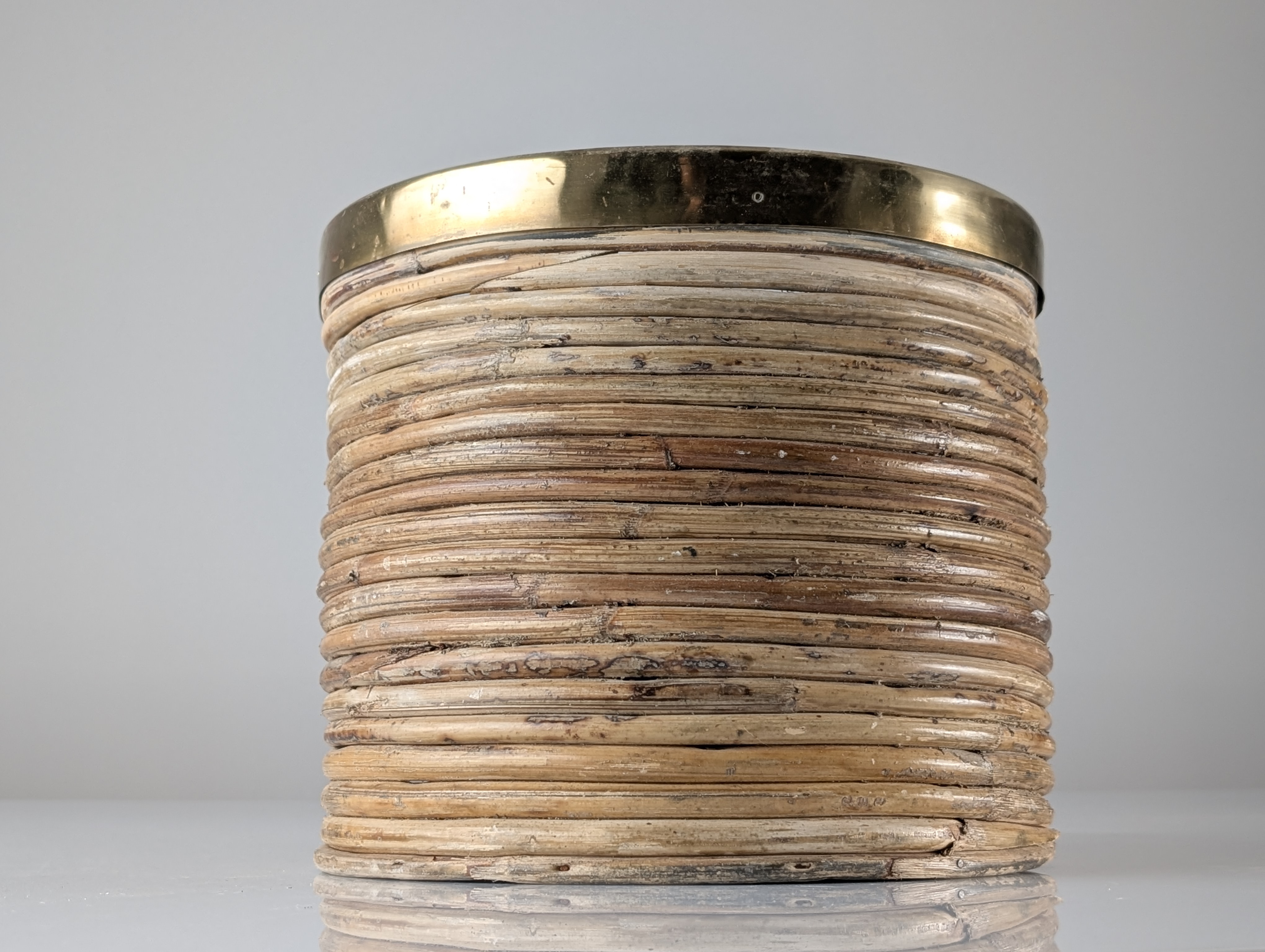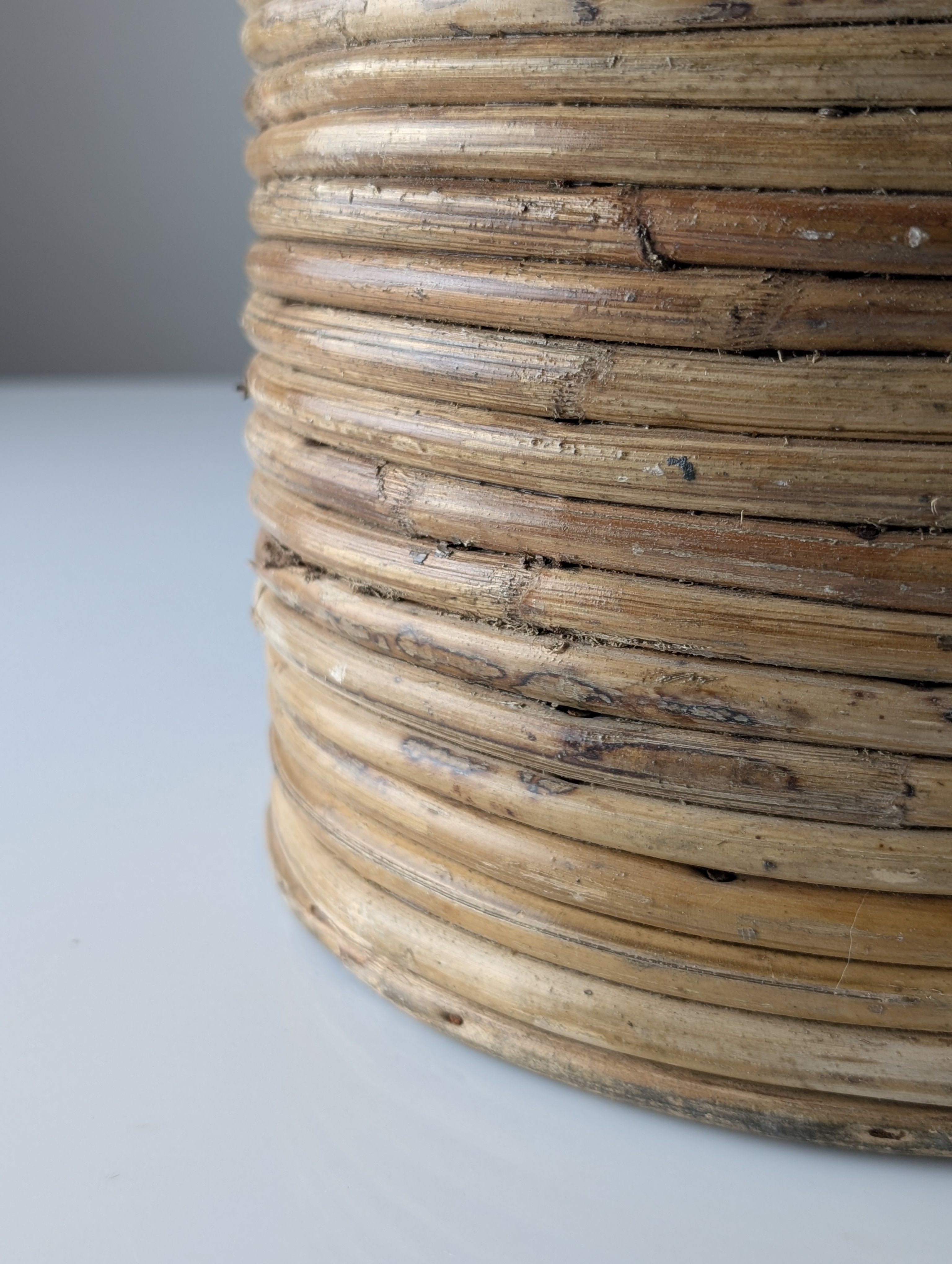 Macetero cilíndrico tipo cachepot producido en Italia durante los 1970s. La estructura presenta la técnica de “pencil reed” (varilla de lápiz), compuesta por varas de ratán horizontales apiladas y reforzadas con ataduras verticales de caña partida.