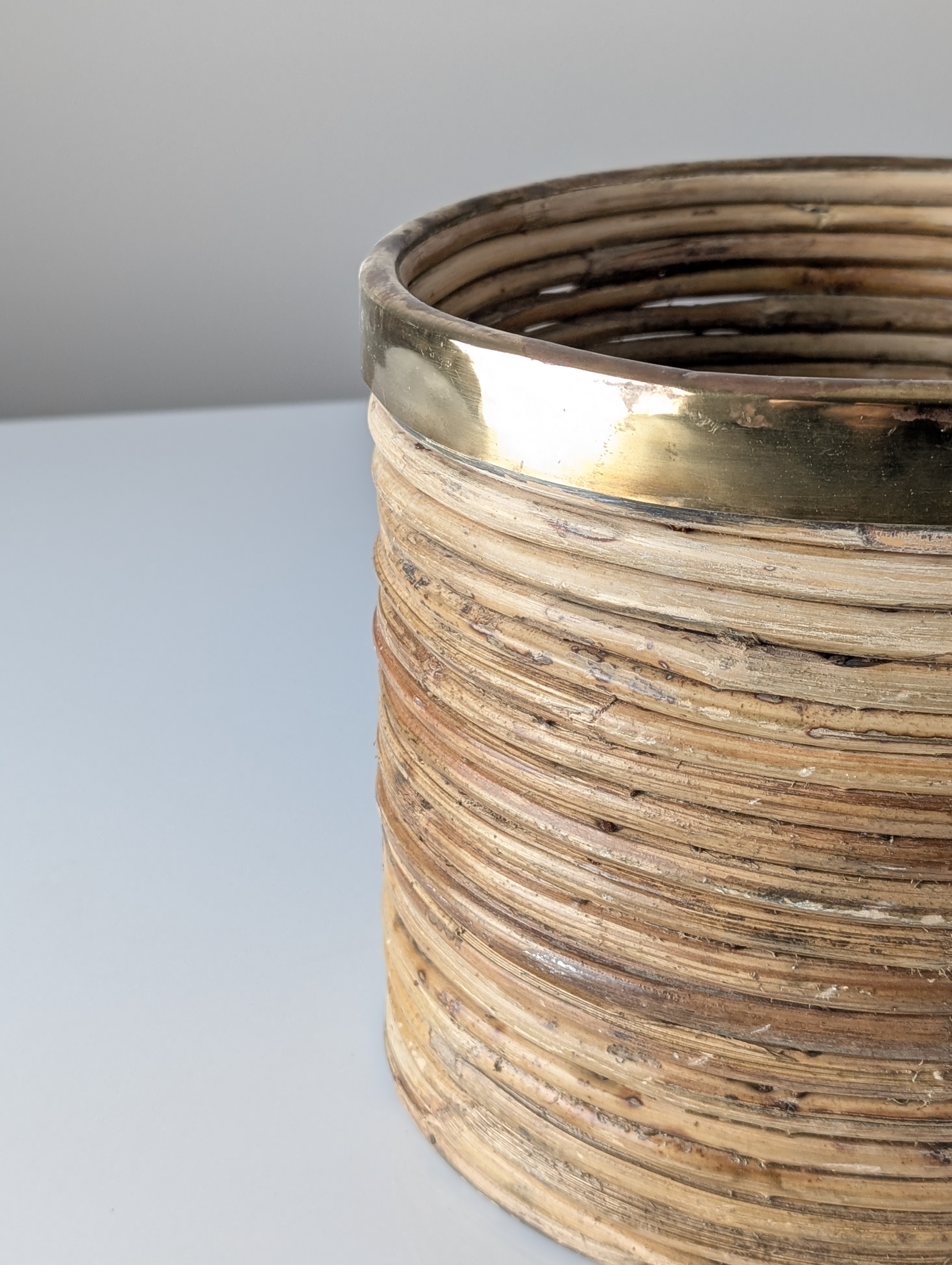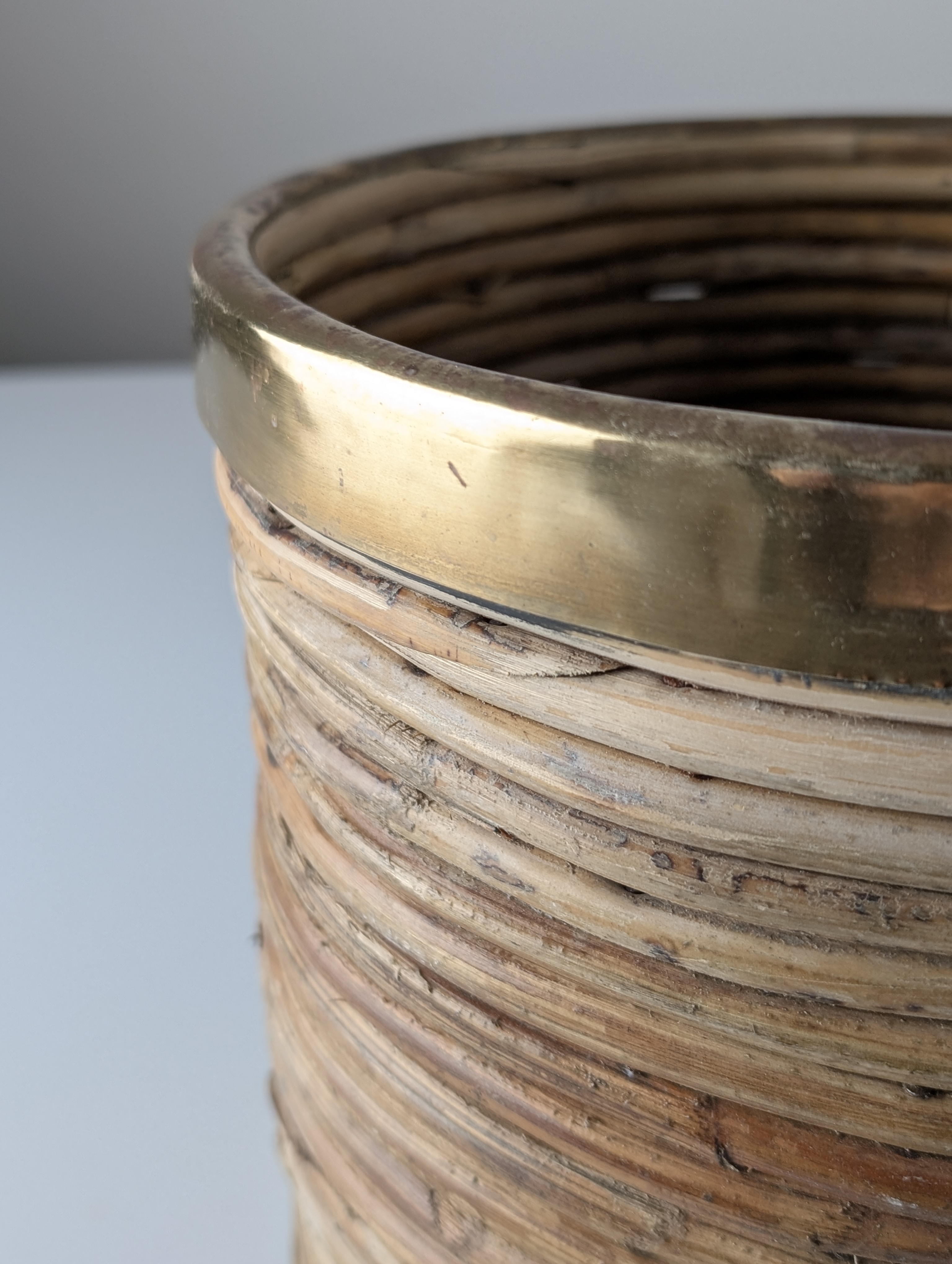 Macetero Italiano Mid-Century en Ratán “Pencil Reed” y Latón, 1970s