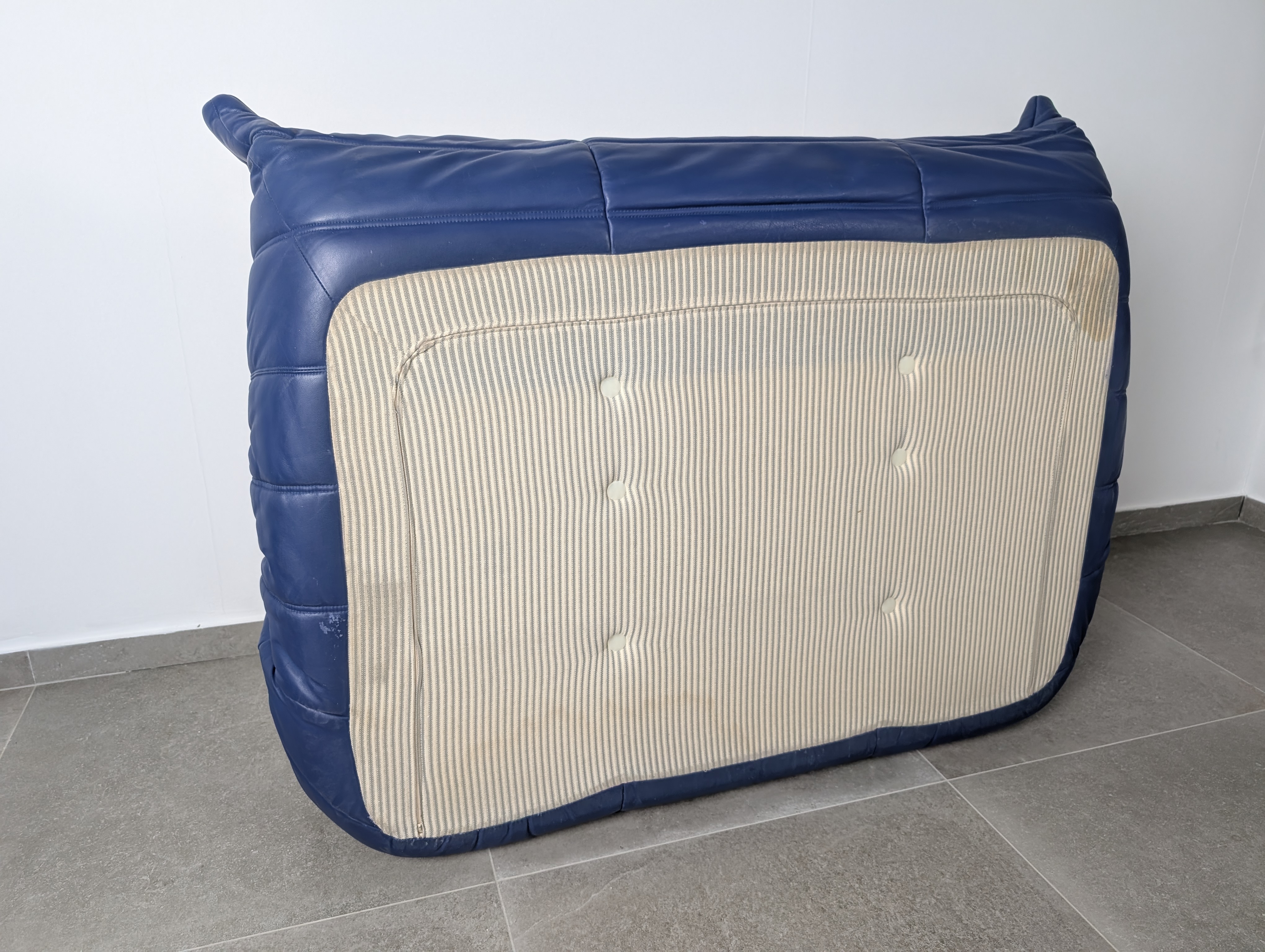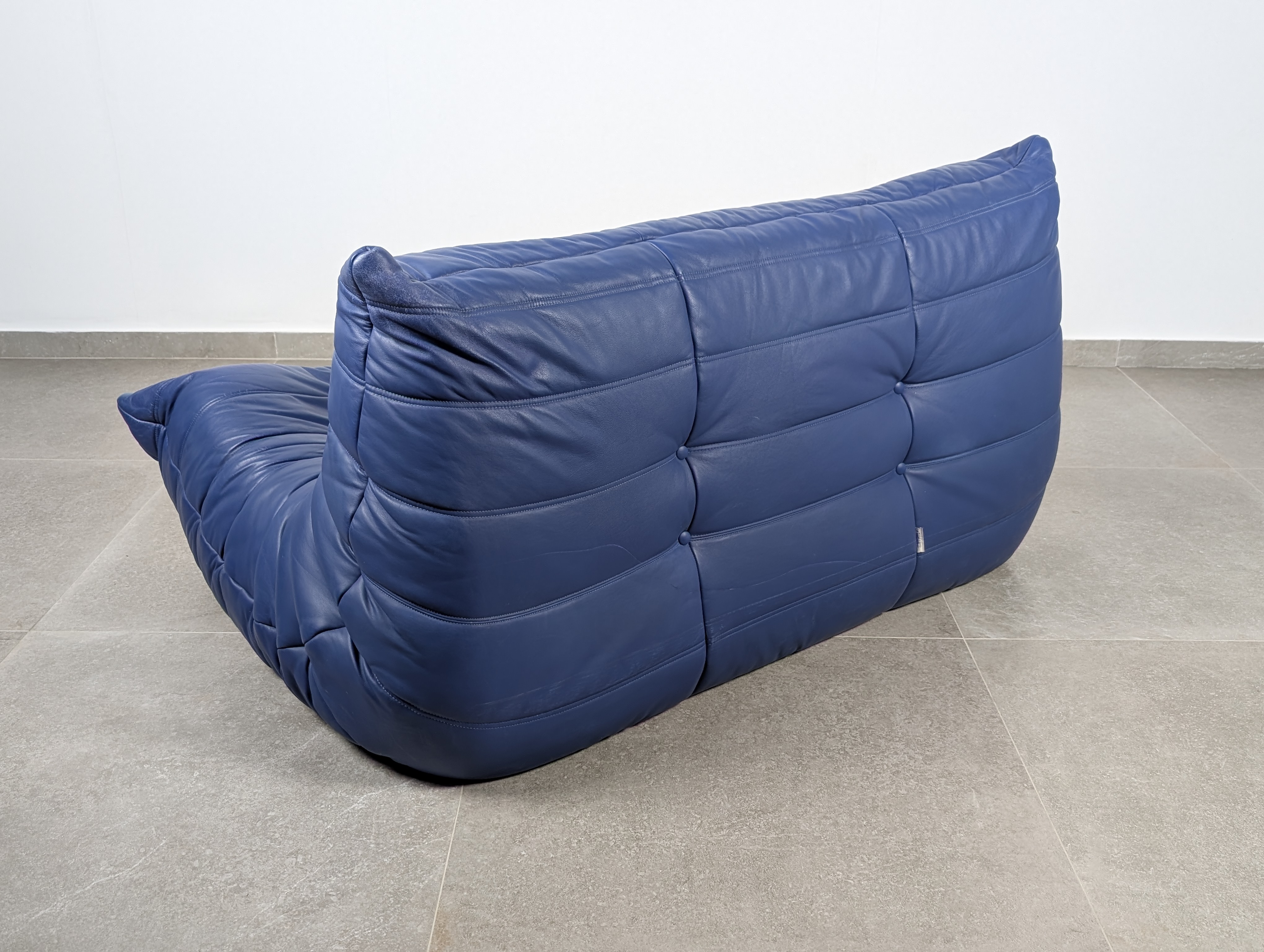 Icónico Sofá Togo diseñado por Michel Ducaroy para el fabricante Ligne Roset. Ejecutado en un profundo cuero azul, este asiento de dos plazas presenta la artesanía plisada y los detalles de capitoné esenciales en el lenguaje de diseño de Michel Ducaroy. La pieza está construida enteramente a partir de múltiples densidades de espuma, eliminando la necesidad de un marco interno rígido de madera o metal. Esta innovación estructural permite que el Sofá Togo mantenga su distintiva silueta de perfil bajo mientras proporciona soporte ergonómico.
