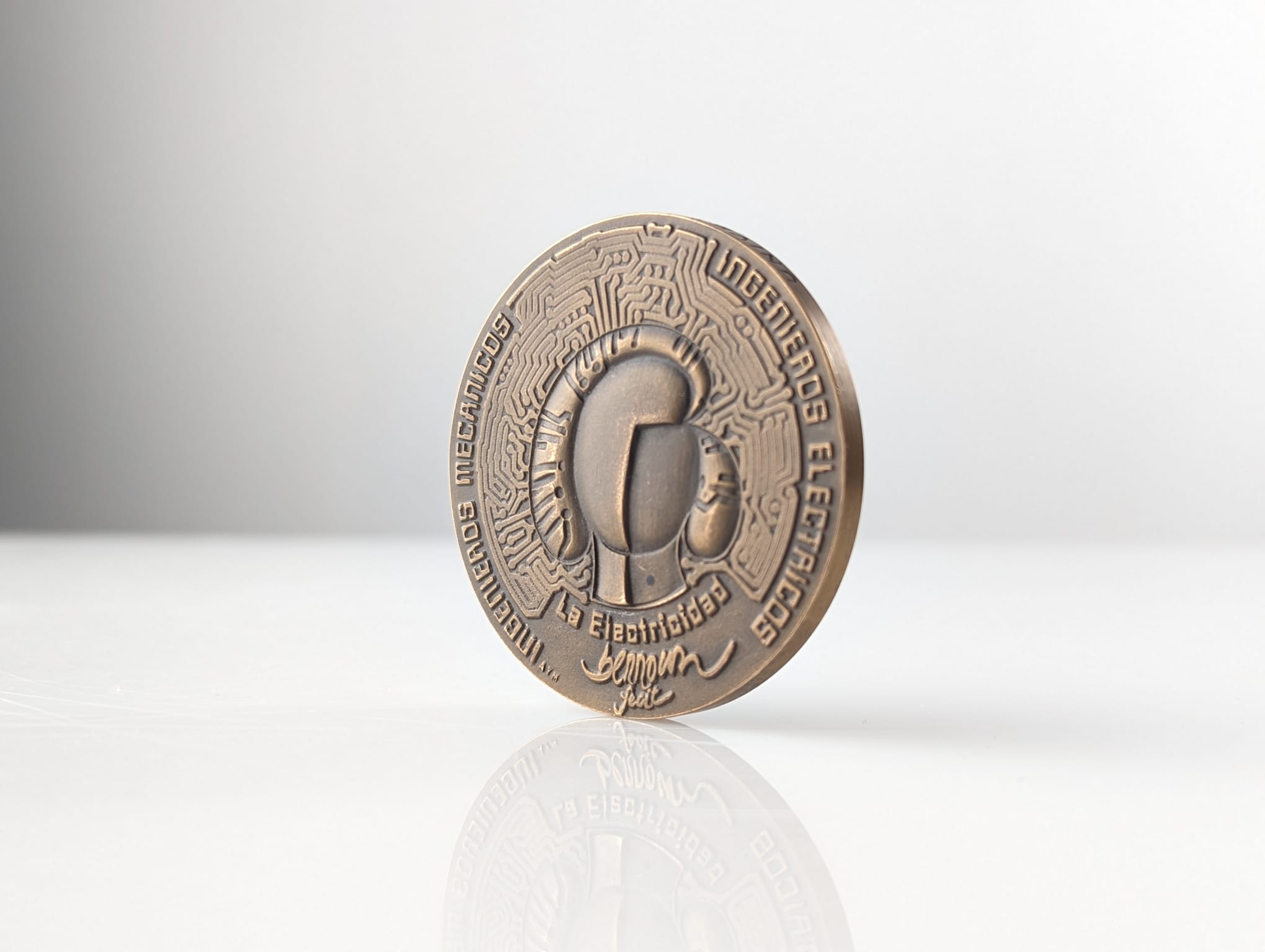 El anverso de la medalla de bronce, titulado La Mecánica, presenta un rostro estilizado construido a partir de fórmulas matemáticas, diagramas geométricos y ecuaciones físicas, rodeado por texto que hace referencia a la institución. En el reverso, el diseño cambia a La Electricidad, representando un perfil formado por vías de circuitos impresos y patrones de microchips, mostrando un enfoque cibernético del retrato. La superficie patinada resalta la profundidad de la fundición, enfatizando la calidad táctil del relieve. Este objeto de Miguel Berrocal sirve como una representación tangible de la intersección entre el arte y la tecnología.