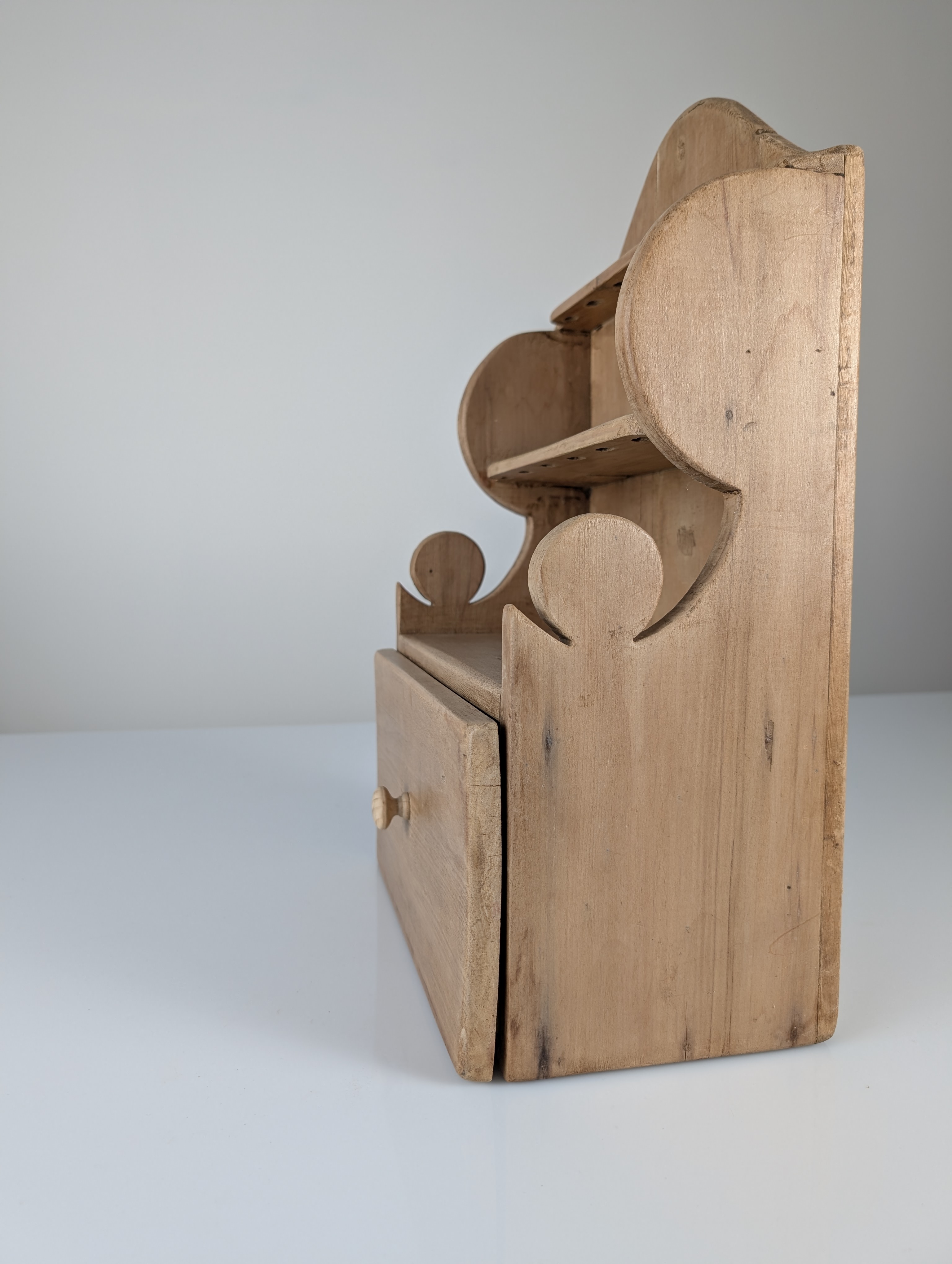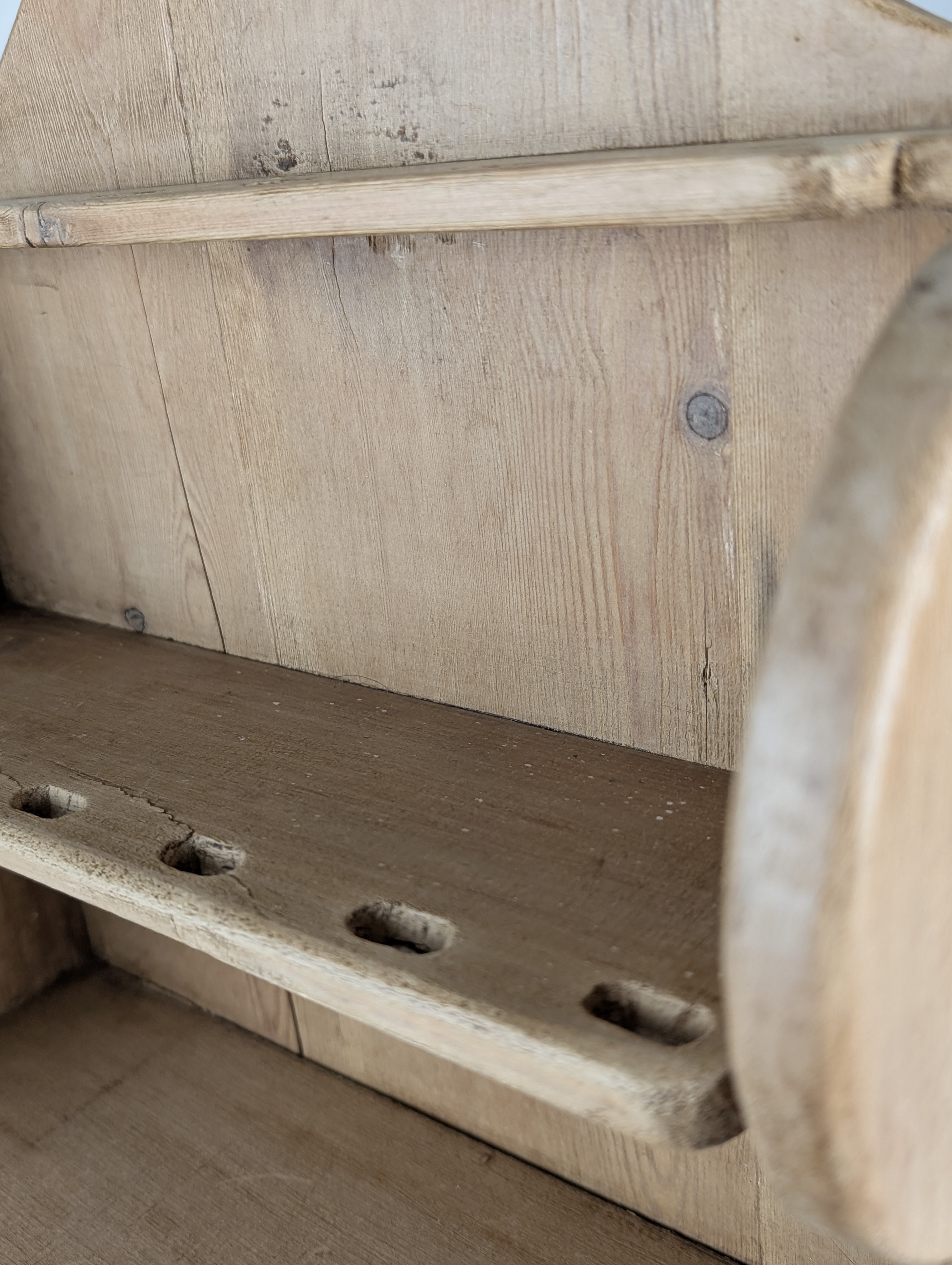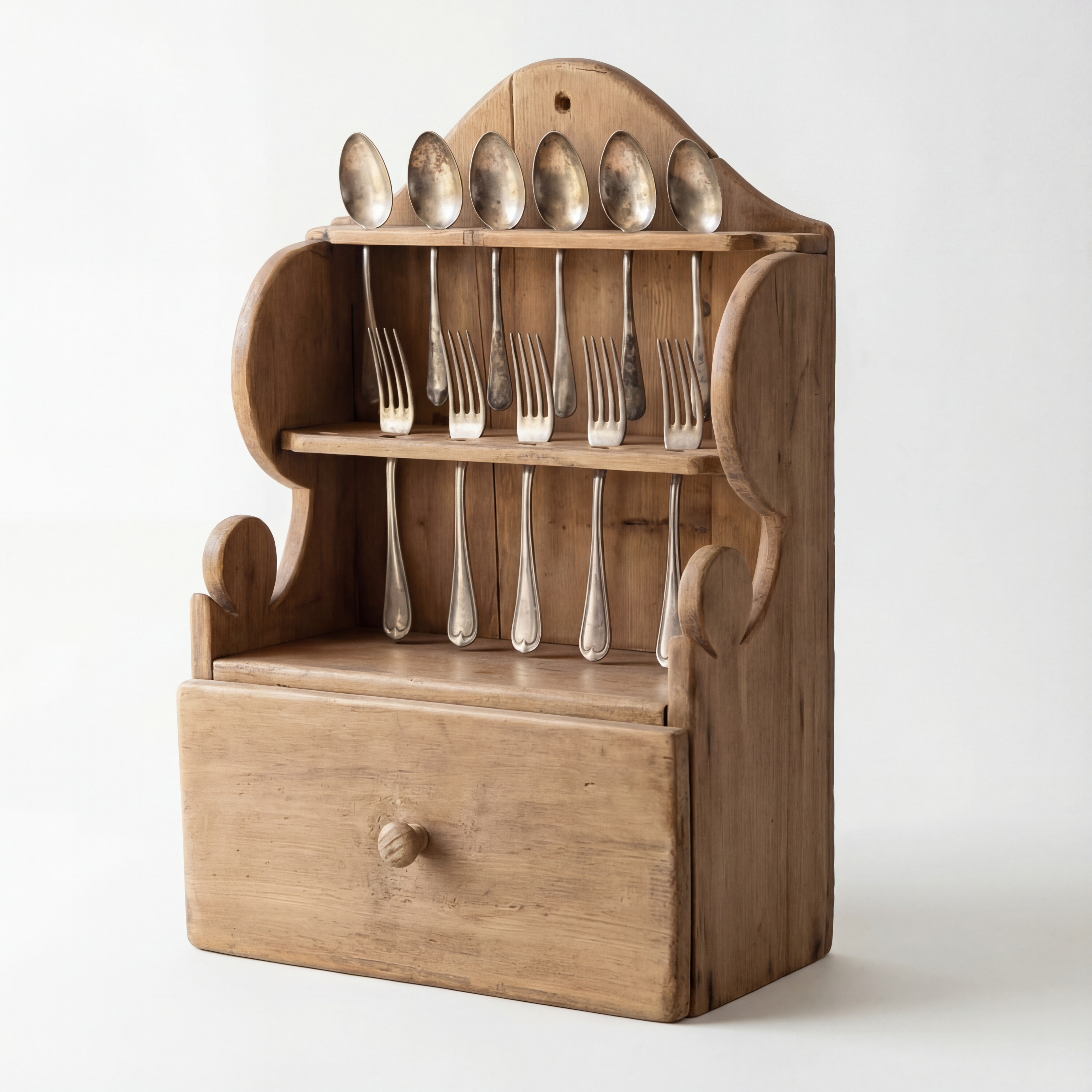 Tallada a mano en madera maciza de pino con una pátina natural envejecida, esta encantadora estantería de pared para cubiertos muestra el atractivo perdurable del arte popular rústico europeo. Históricamente un elemento esencial en las casas de campo mediterráneas, esta pieza servía tanto para exhibir cubiertos tradicionales como de organizador práctico para el hogar. El diseño presenta listones escalonados con aberturas circulares tradicionales, perfectamente adecuados para exhibir una colección de utensilios antiguos. Debajo, un único cajón integrado con un pomo torneado a mano ofrece almacenamiento para pequeños tesoros de cocina. El ensamblaje refleja la carpintería honesta de mediados de siglo, priorizando la funcionalidad robusta sobre la ornamentación. Los artesanos de la década de 1950s seleccionaban el pino por su notable durabilidad y la forma en que su veta responde al tallado manual, asegurando que cada pieza poseyera un carácter único. Este tipo de trabajo de madera vernáculo fue fundamental para la vida doméstica regional, representando un puente entre la necesidad utilitaria y la expresión decorativa. Su construcción enfatiza la calidad táctil de la madera, convirtiéndola en un punto focal para cualquier interior que celebre los materiales orgánicos.