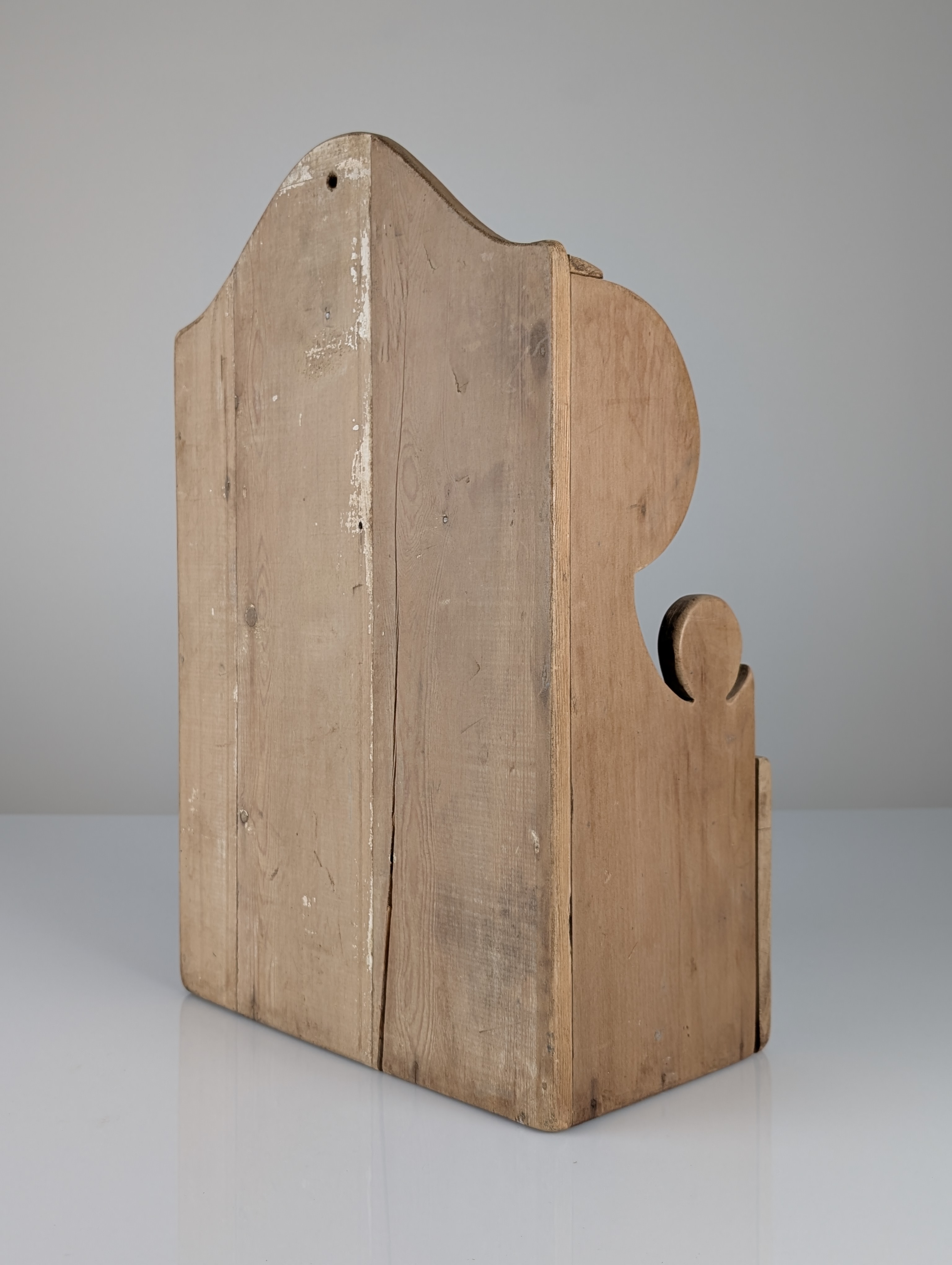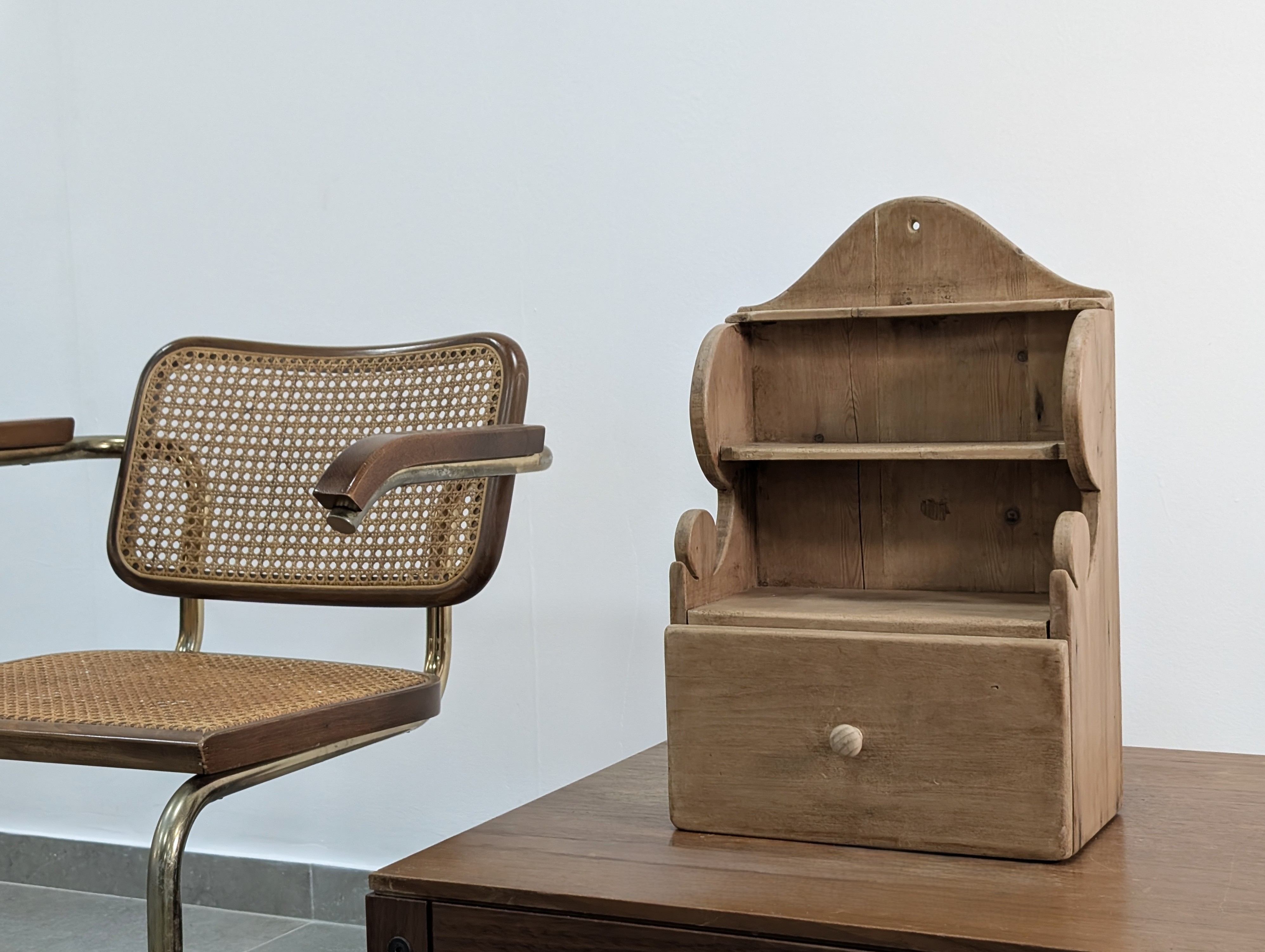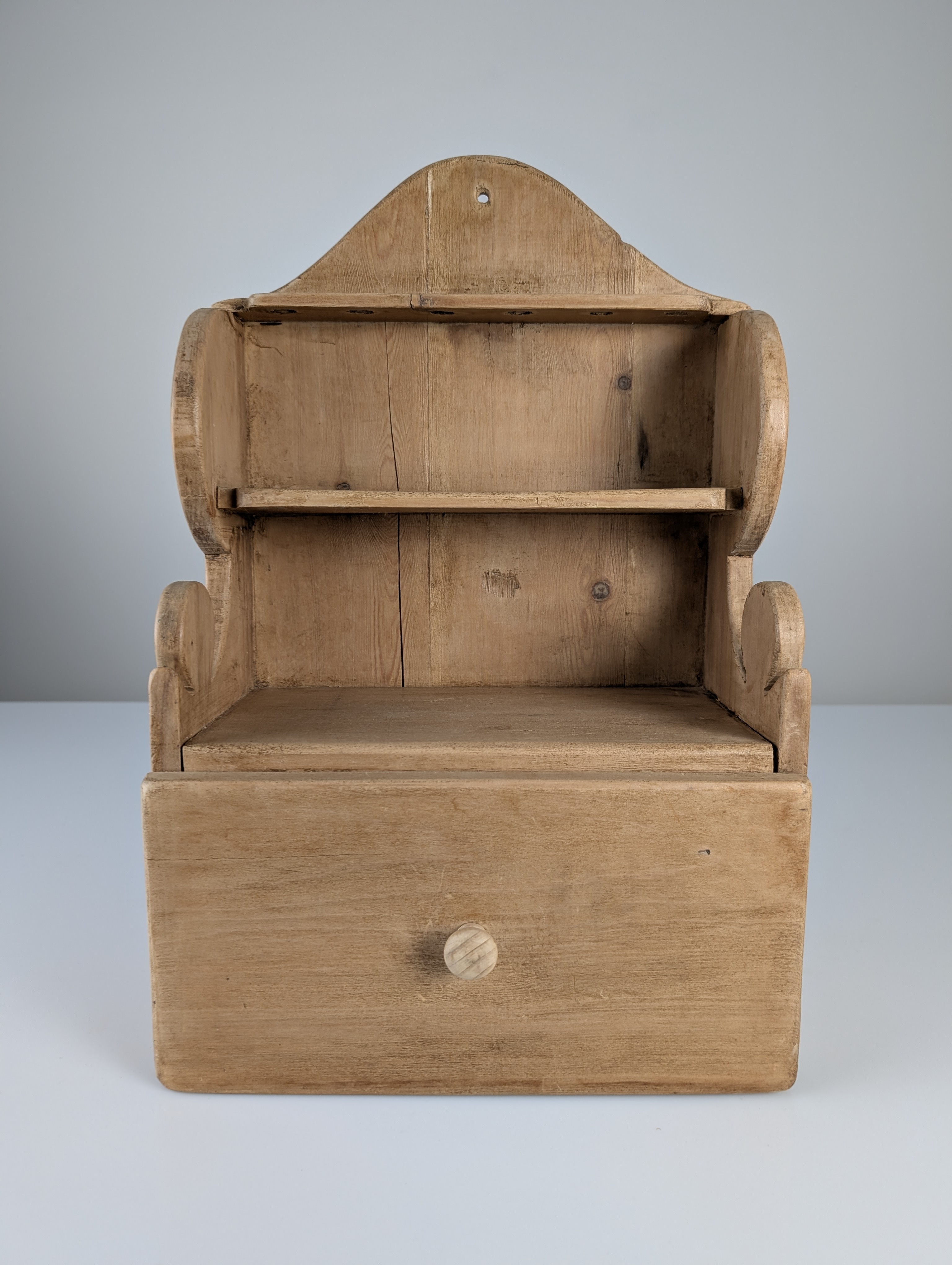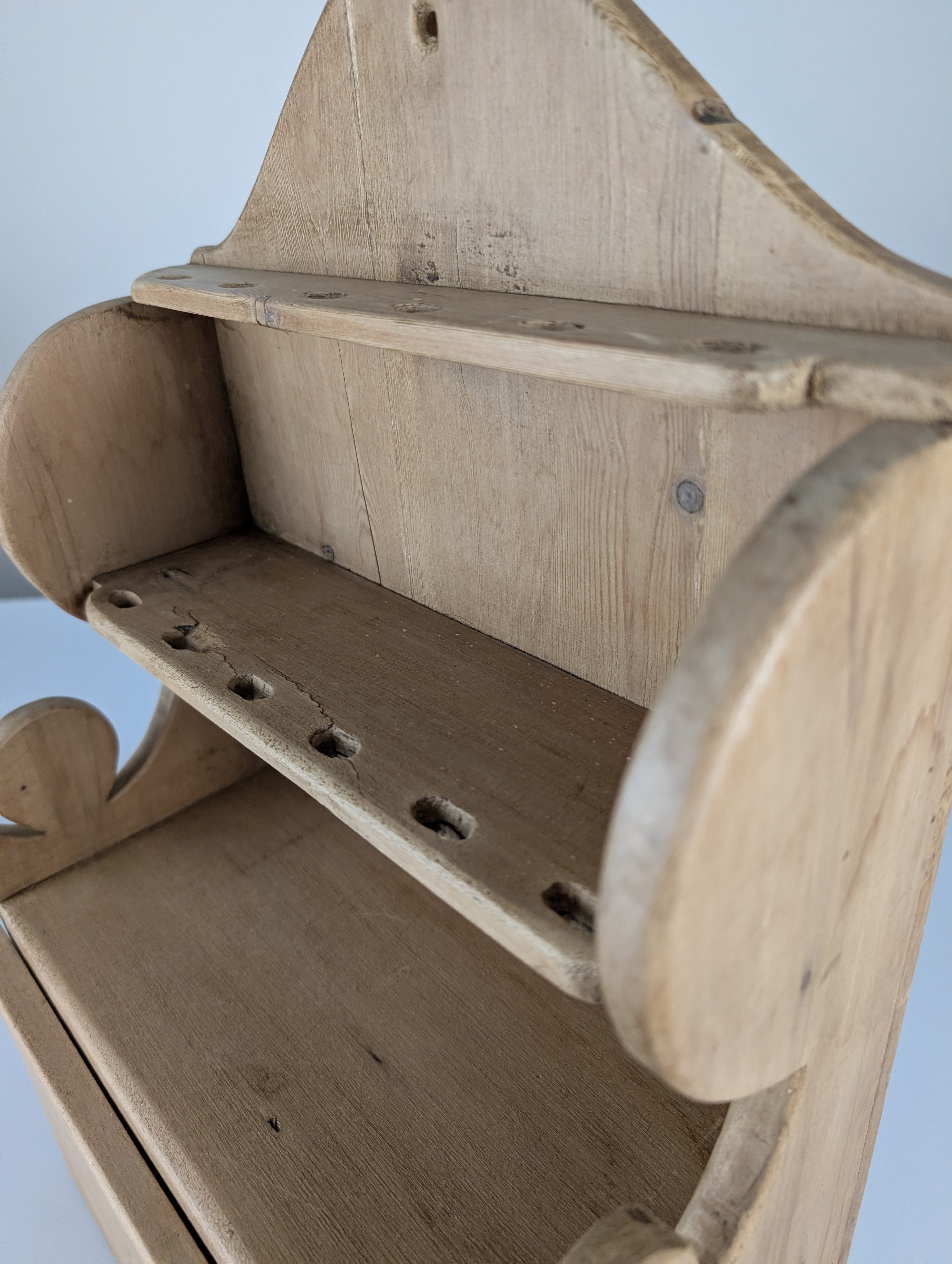 Tallada a mano en madera maciza de pino con una pátina natural envejecida, esta encantadora estantería de pared para cubiertos muestra el atractivo perdurable del arte popular rústico europeo. Históricamente un elemento esencial en las casas de campo mediterráneas, esta pieza servía tanto para exhibir cubiertos tradicionales como de organizador práctico para el hogar. El diseño presenta listones escalonados con aberturas circulares tradicionales, perfectamente adecuados para exhibir una colección de utensilios antiguos. Debajo, un único cajón integrado con un pomo torneado a mano ofrece almacenamiento para pequeños tesoros de cocina. El ensamblaje refleja la carpintería honesta de mediados de siglo, priorizando la funcionalidad robusta sobre la ornamentación. Los artesanos de la década de 1950s seleccionaban el pino por su notable durabilidad y la forma en que su veta responde al tallado manual, asegurando que cada pieza poseyera un carácter único. Este tipo de trabajo de madera vernáculo fue fundamental para la vida doméstica regional, representando un puente entre la necesidad utilitaria y la expresión decorativa. Su construcción enfatiza la calidad táctil de la madera, convirtiéndola en un punto focal para cualquier interior que celebre los materiales orgánicos.