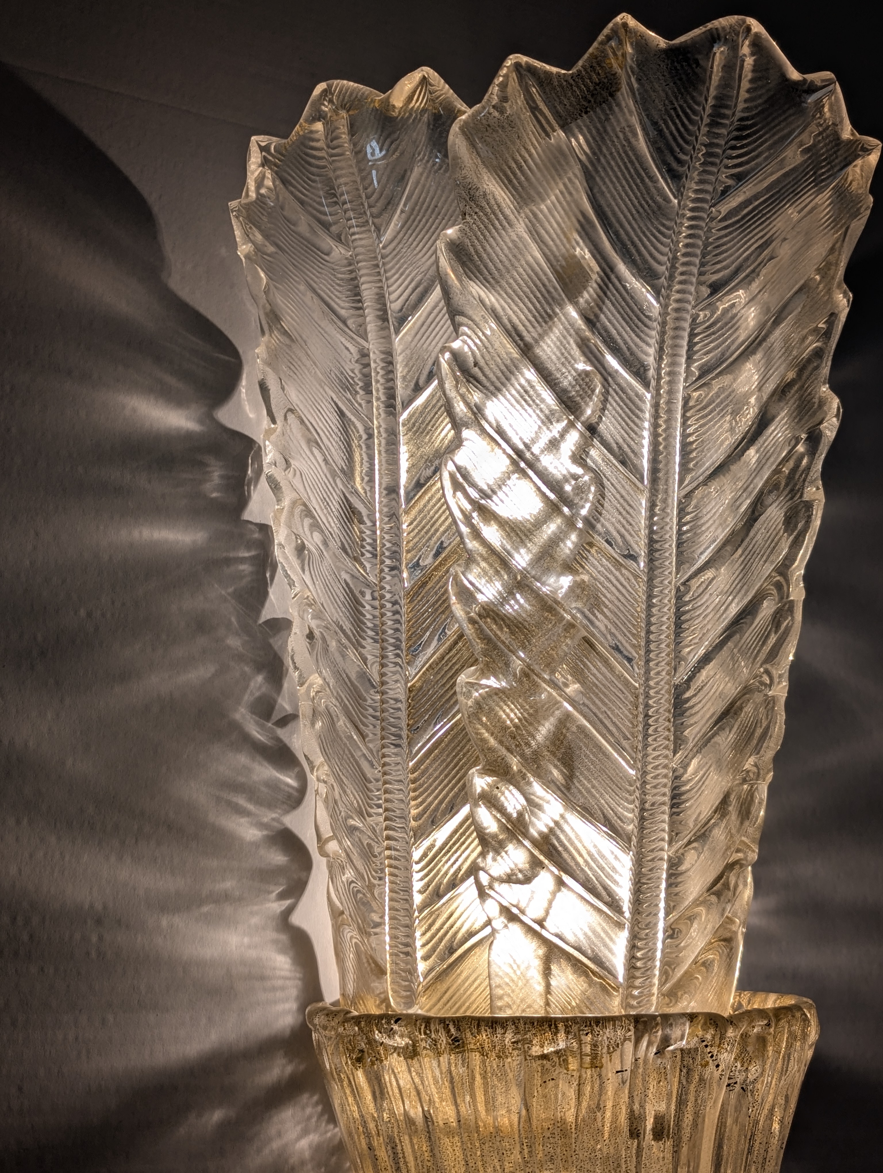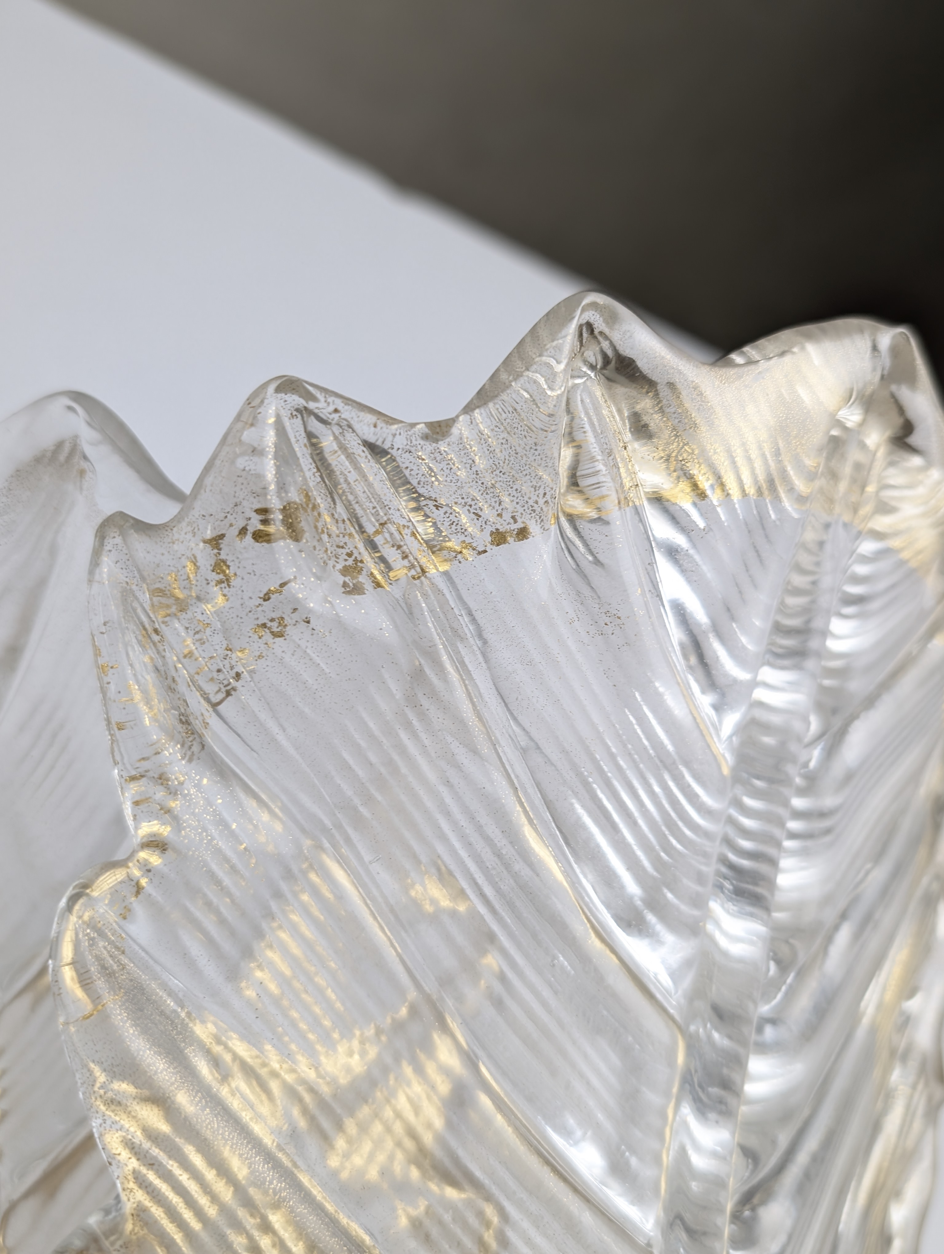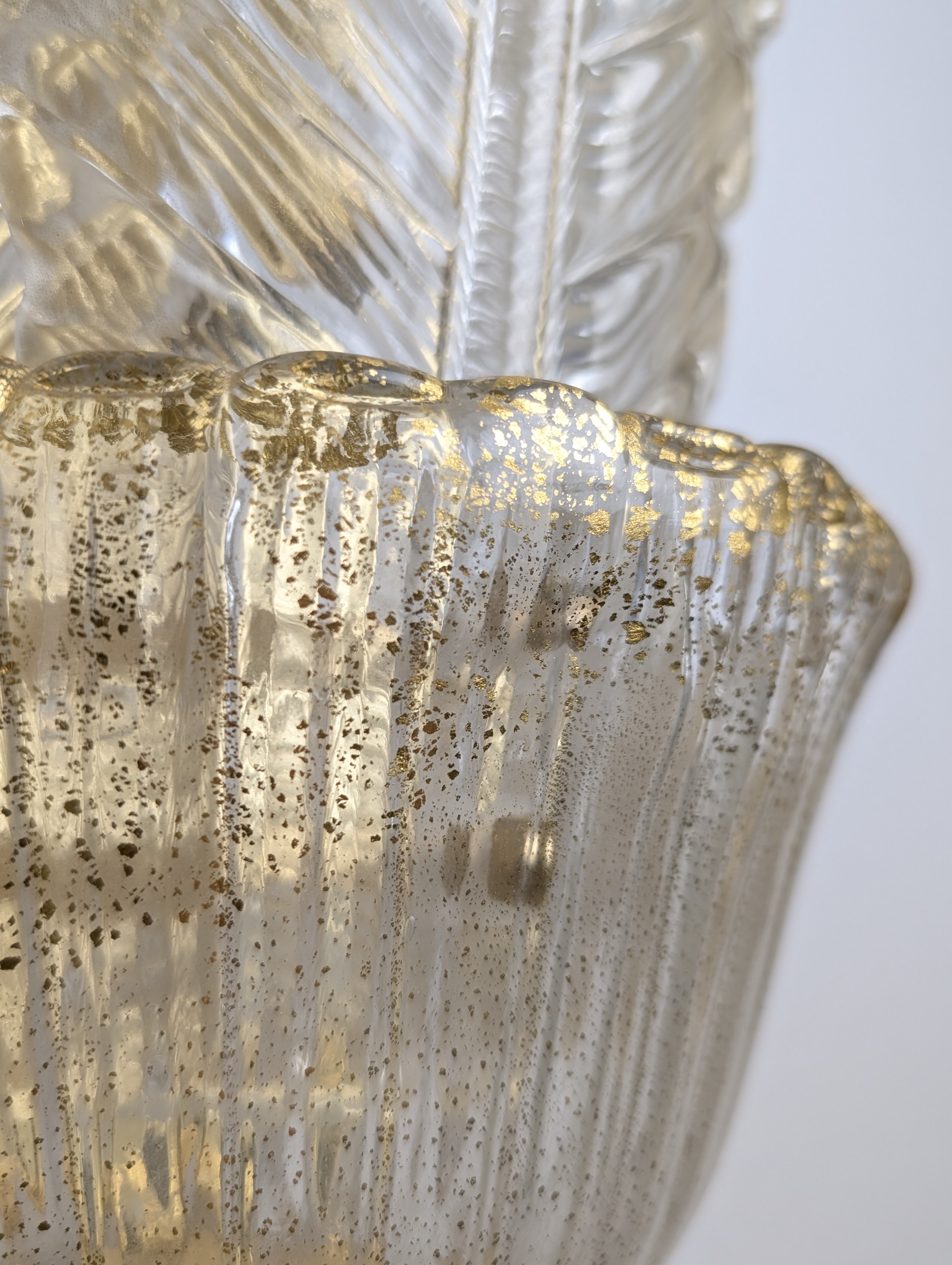Par de apliques de pared monumentales fabricados en cristal de Murano, compuestos por tres hojas o grandes plumas, atribuidos a Barovier & Toso. El cristal está moldeado estructuralmente con un diseño foliado acanalado superpuesto. Tanto la base de montaje inferior como las hojas estriadas presentan inclusiones internas de pan de oro fragmentado (técnica foglia d’oro), integradas de forma permanente en la matriz vítrea. Cada aplique cuenta con dos puntos de luz en su interior. La estructura de latón se encuentra en perfecto estado. Para garantizar la máxima tranquilidad del cliente, se ofrece envío provisto de embalaje de máxima seguridad y cobertura de seguro a todo riesgo que incluye protección total contra rotura o pérdida.