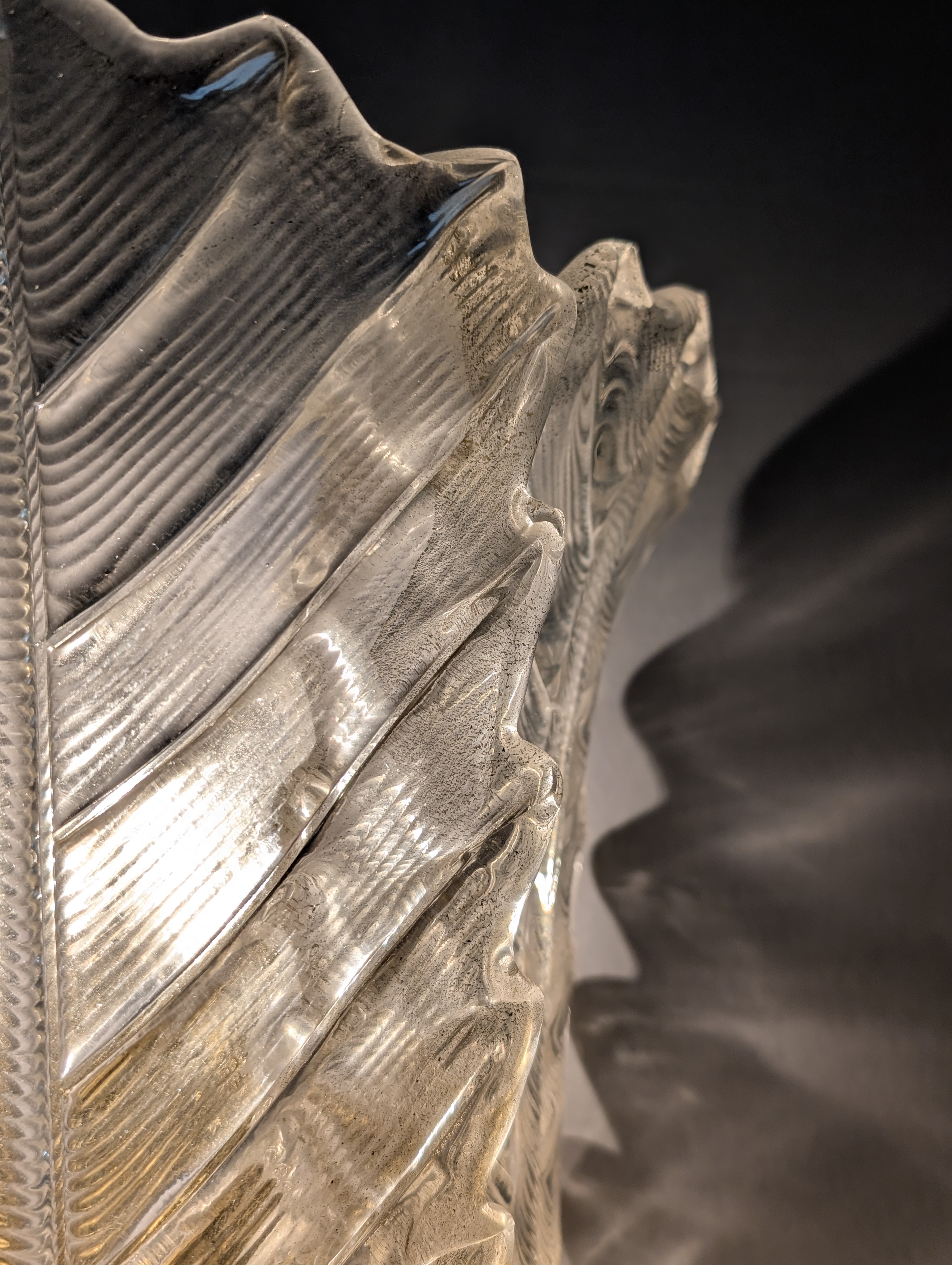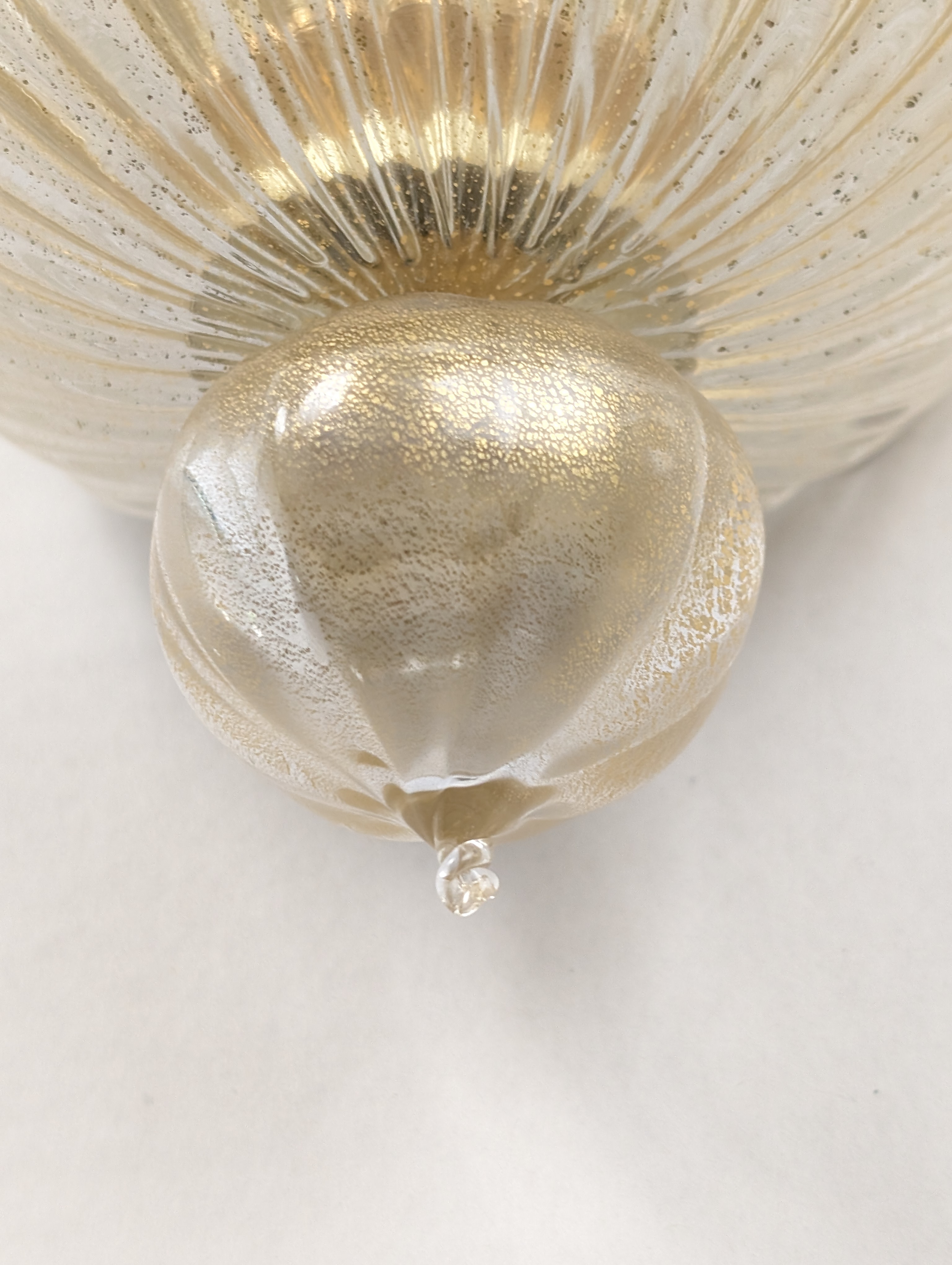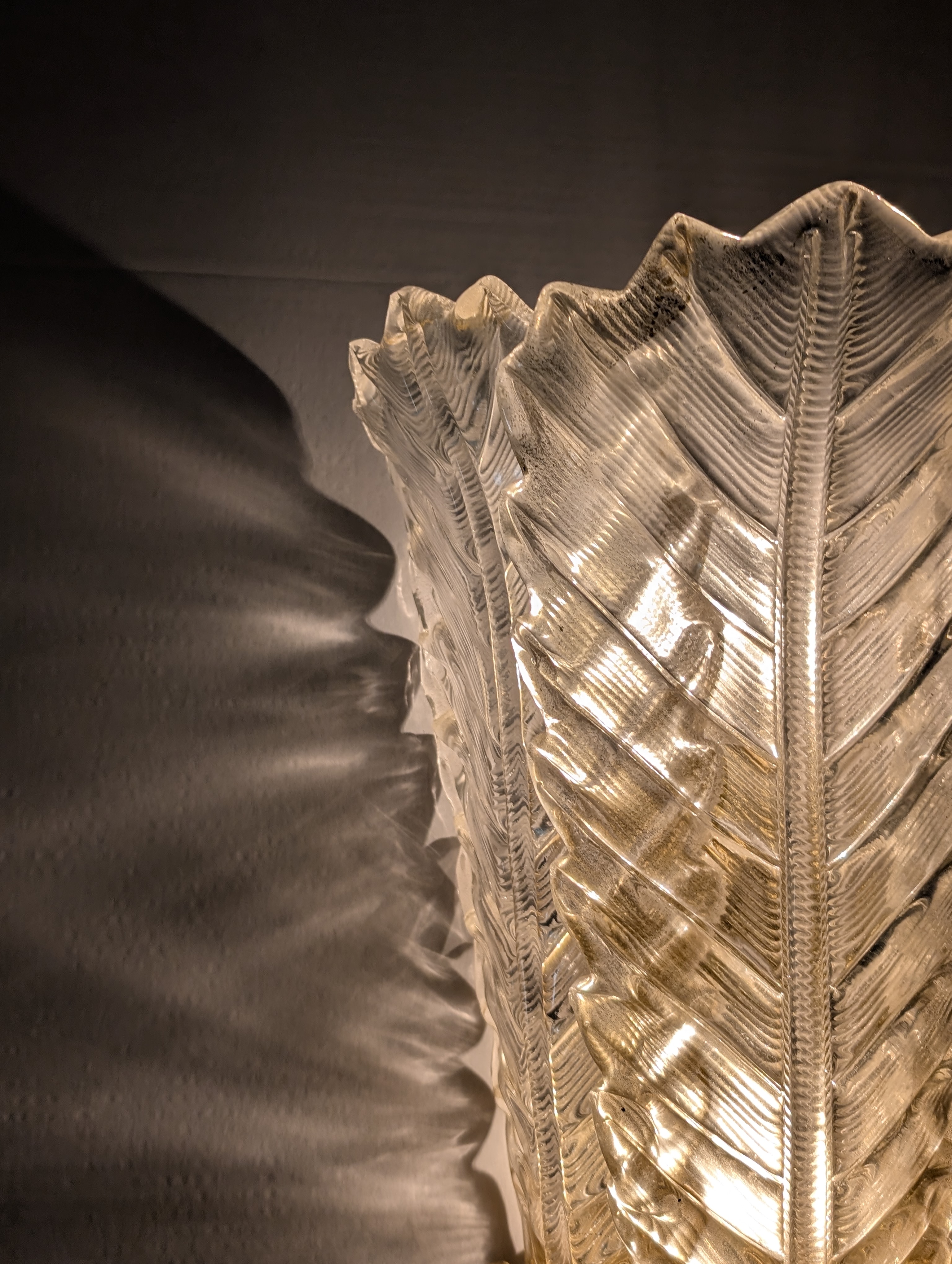 Par de apliques de pared monumentales fabricados en cristal de Murano, compuestos por tres hojas o grandes plumas, atribuidos a Barovier & Toso. El cristal está moldeado estructuralmente con un diseño foliado acanalado superpuesto. Tanto la base de montaje inferior como las hojas estriadas presentan inclusiones internas de pan de oro fragmentado (técnica foglia d’oro), integradas de forma permanente en la matriz vítrea. Cada aplique cuenta con dos puntos de luz en su interior. La estructura de latón se encuentra en perfecto estado. Para garantizar la máxima tranquilidad del cliente, se ofrece envío provisto de embalaje de máxima seguridad y cobertura de seguro a todo riesgo que incluye protección total contra rotura o pérdida.