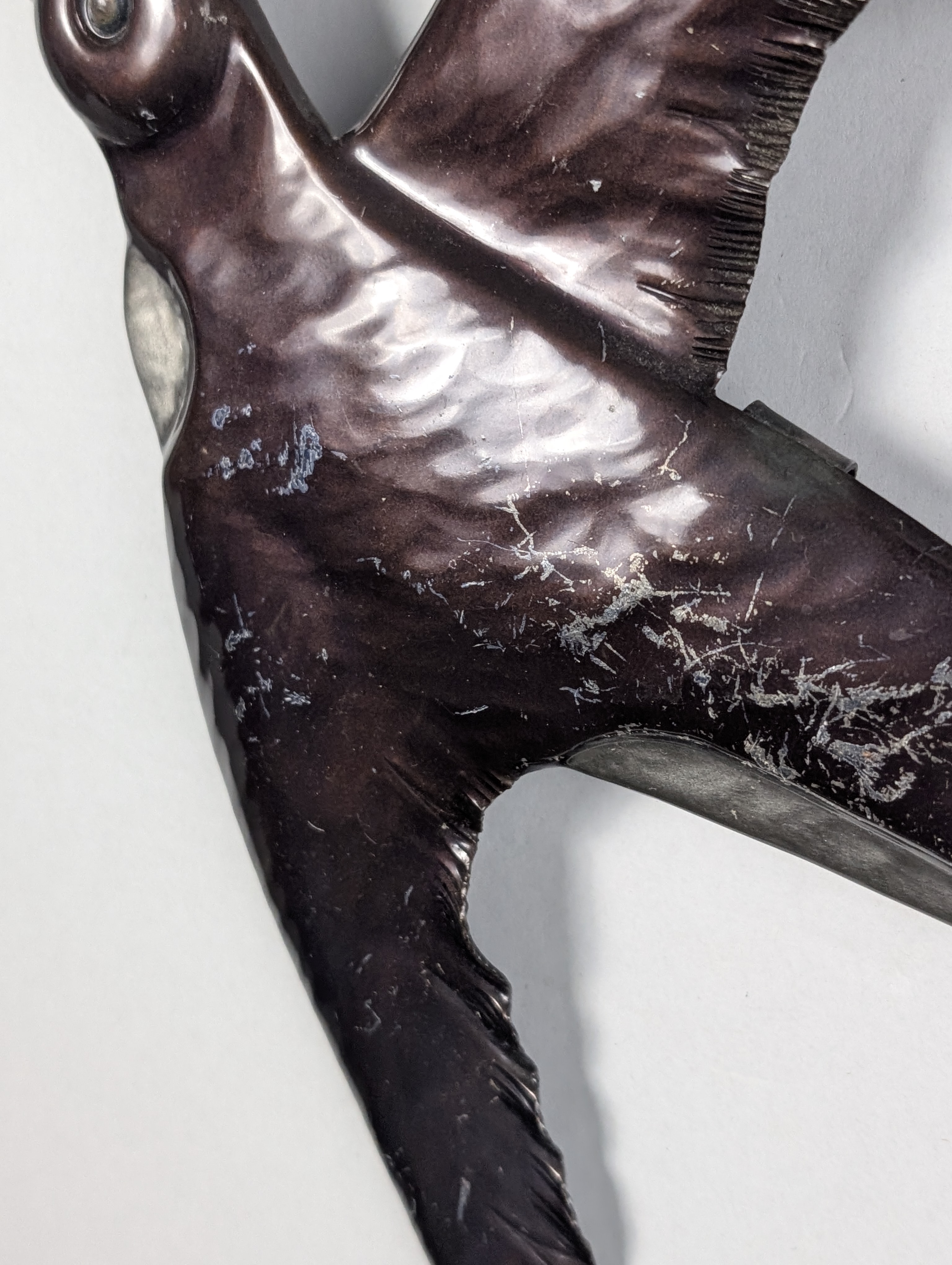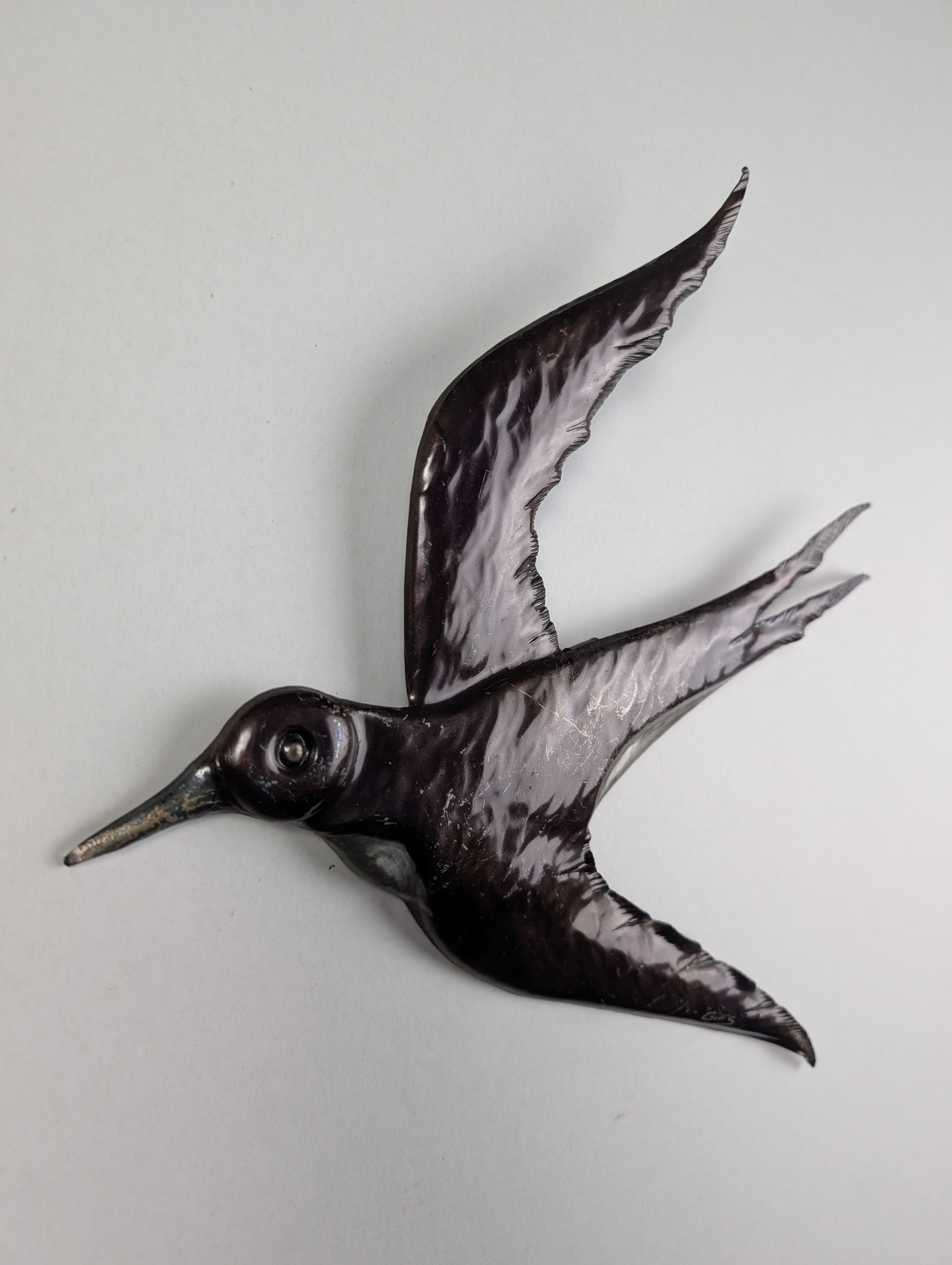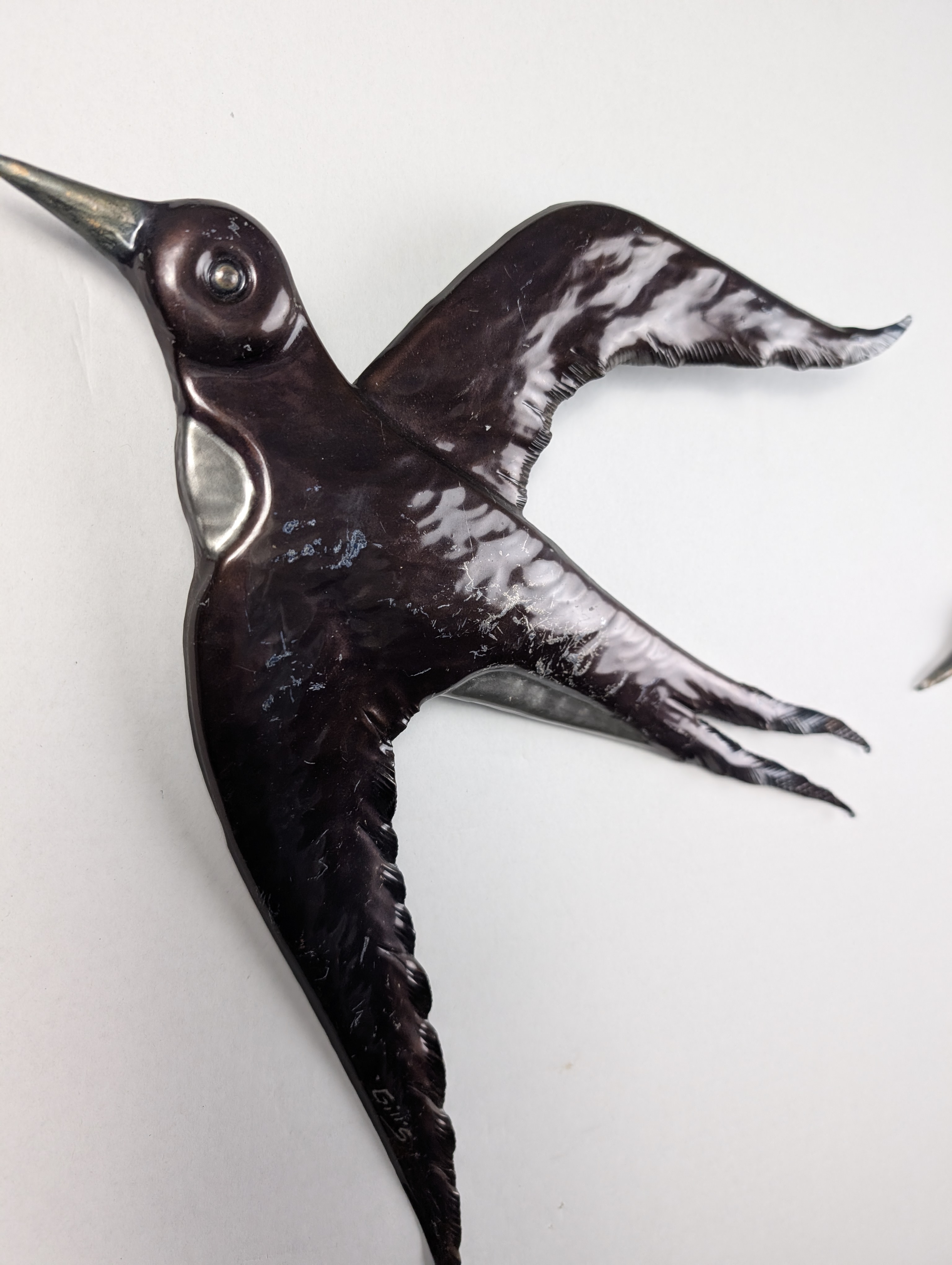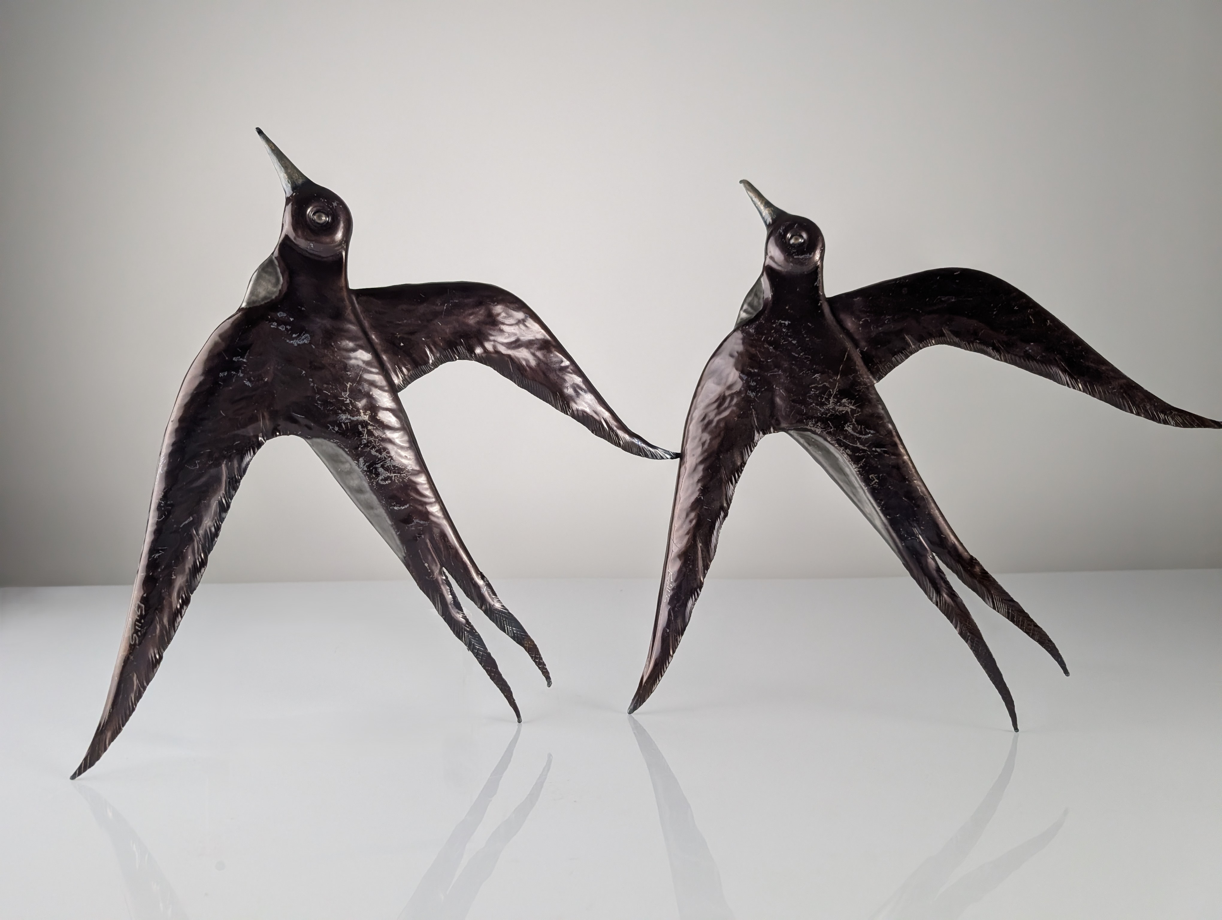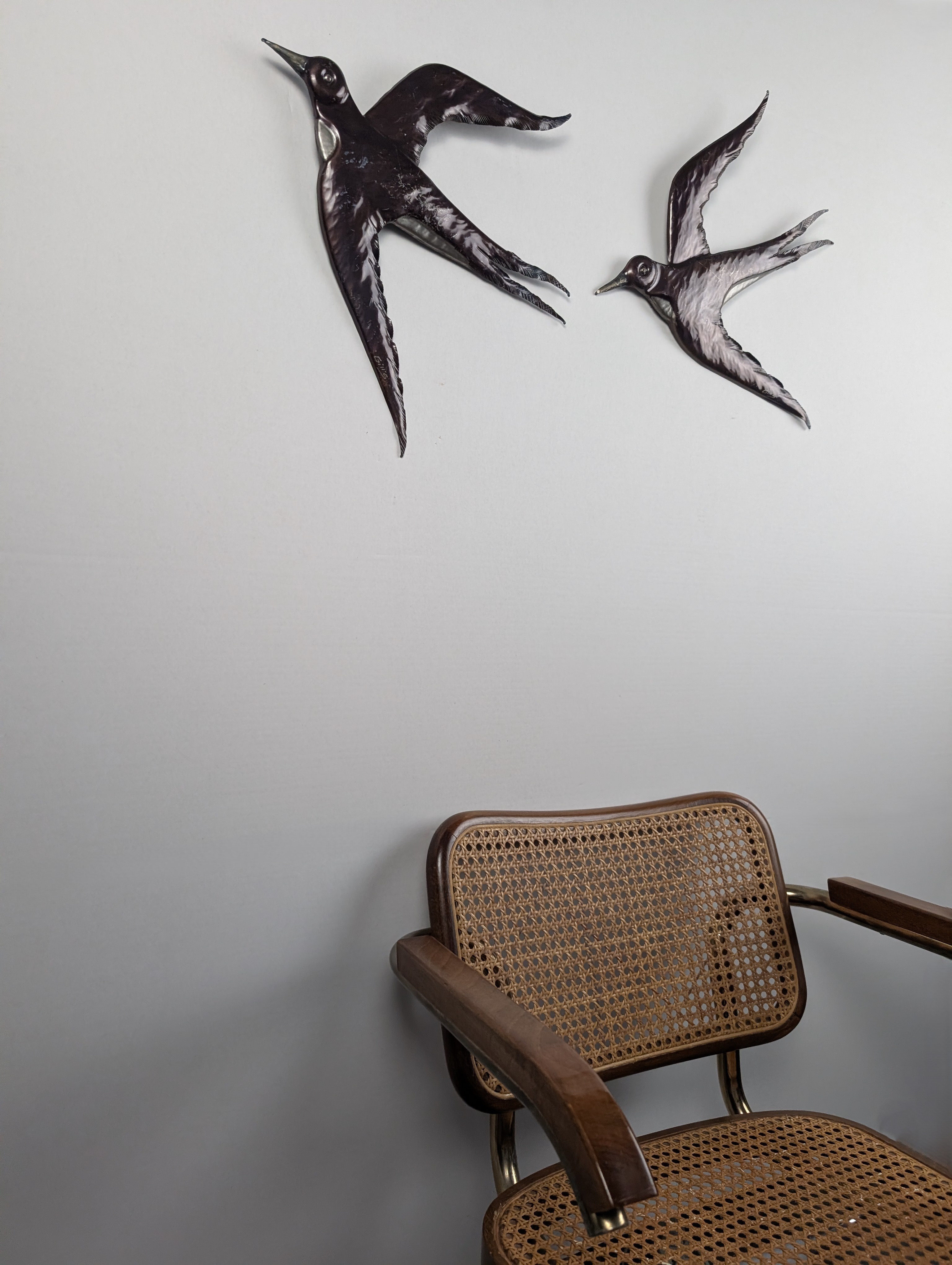 Par de esculturas de pared fabricadas en metal, diseñadas con la forma de golondrinas en pleno vuelo. La superficie presenta un acabado metalizado brillante patinado. Cada pieza está firmada por el artista en una de sus alas. La parte posterior está equipada con un soporte integrado para su fijación directa en la pared.