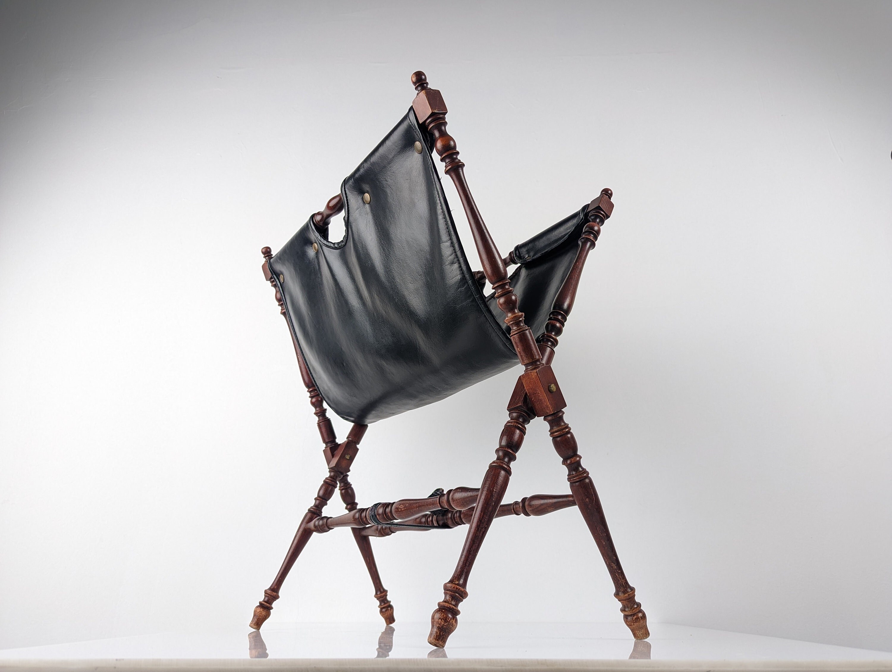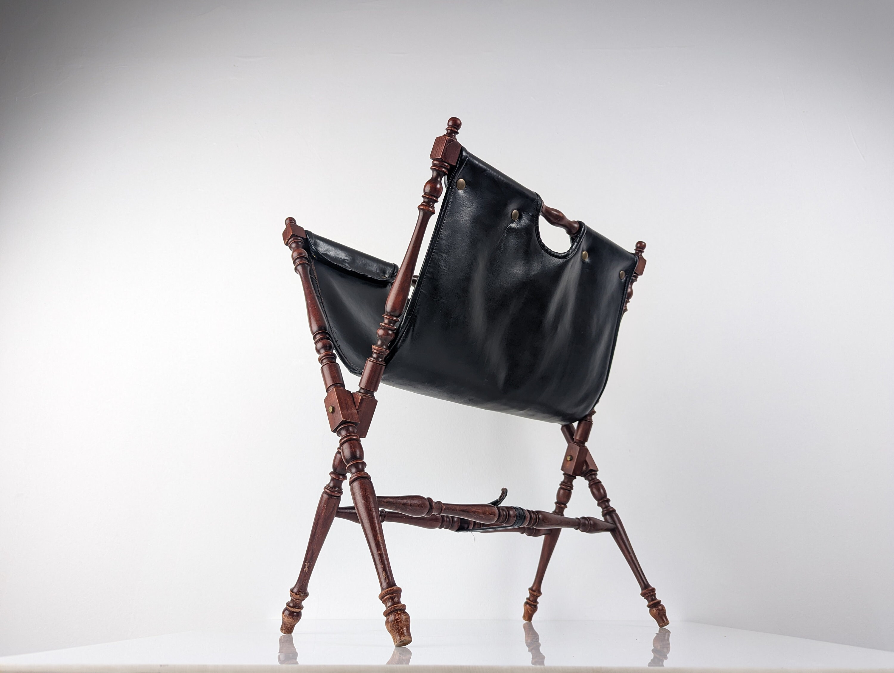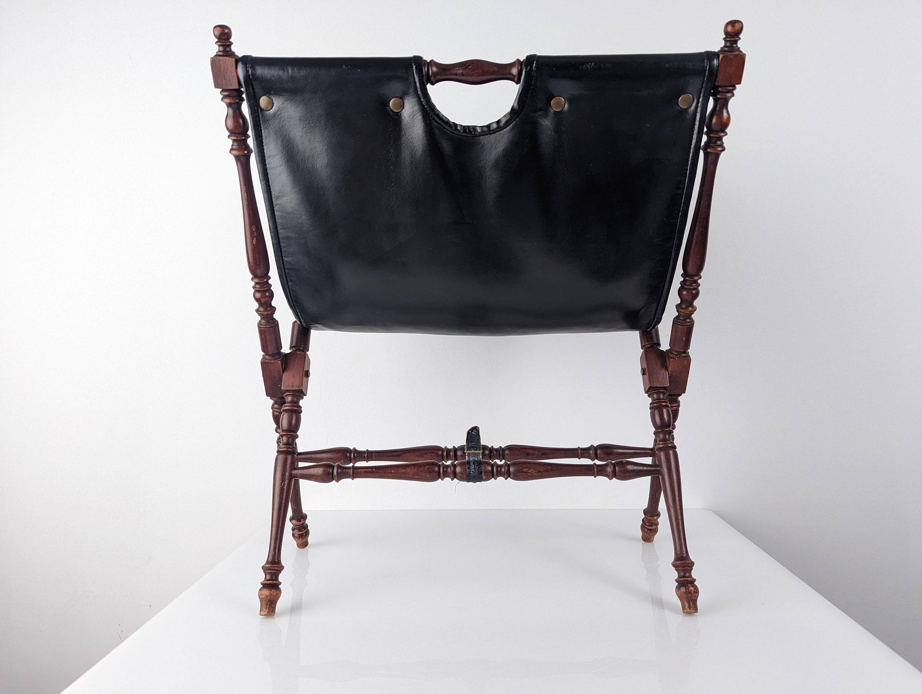 Elegante revistero realizado en madera con detalles torneados y un distinguido cuero negro que realza esta pieza de refinado gusto.
