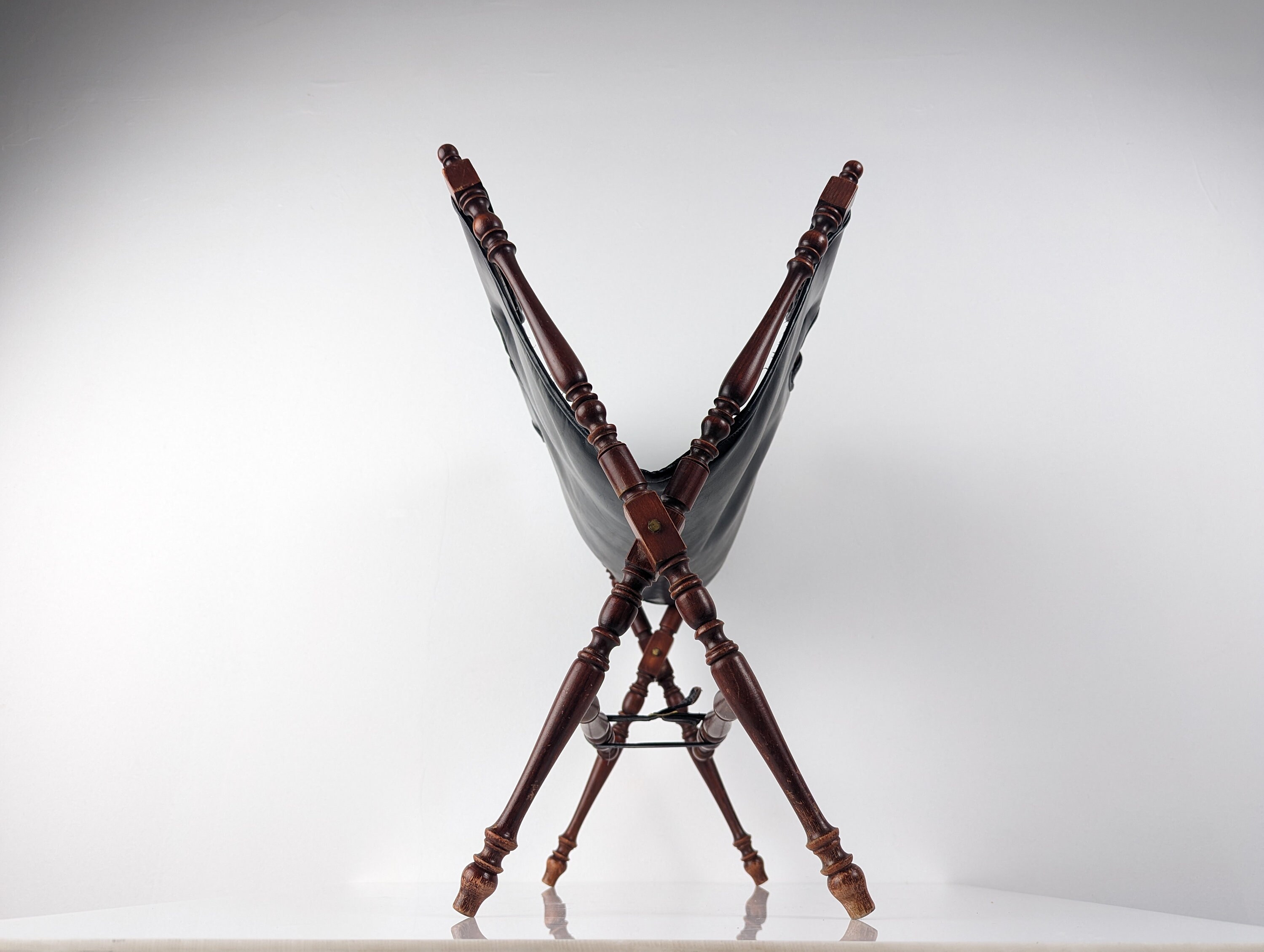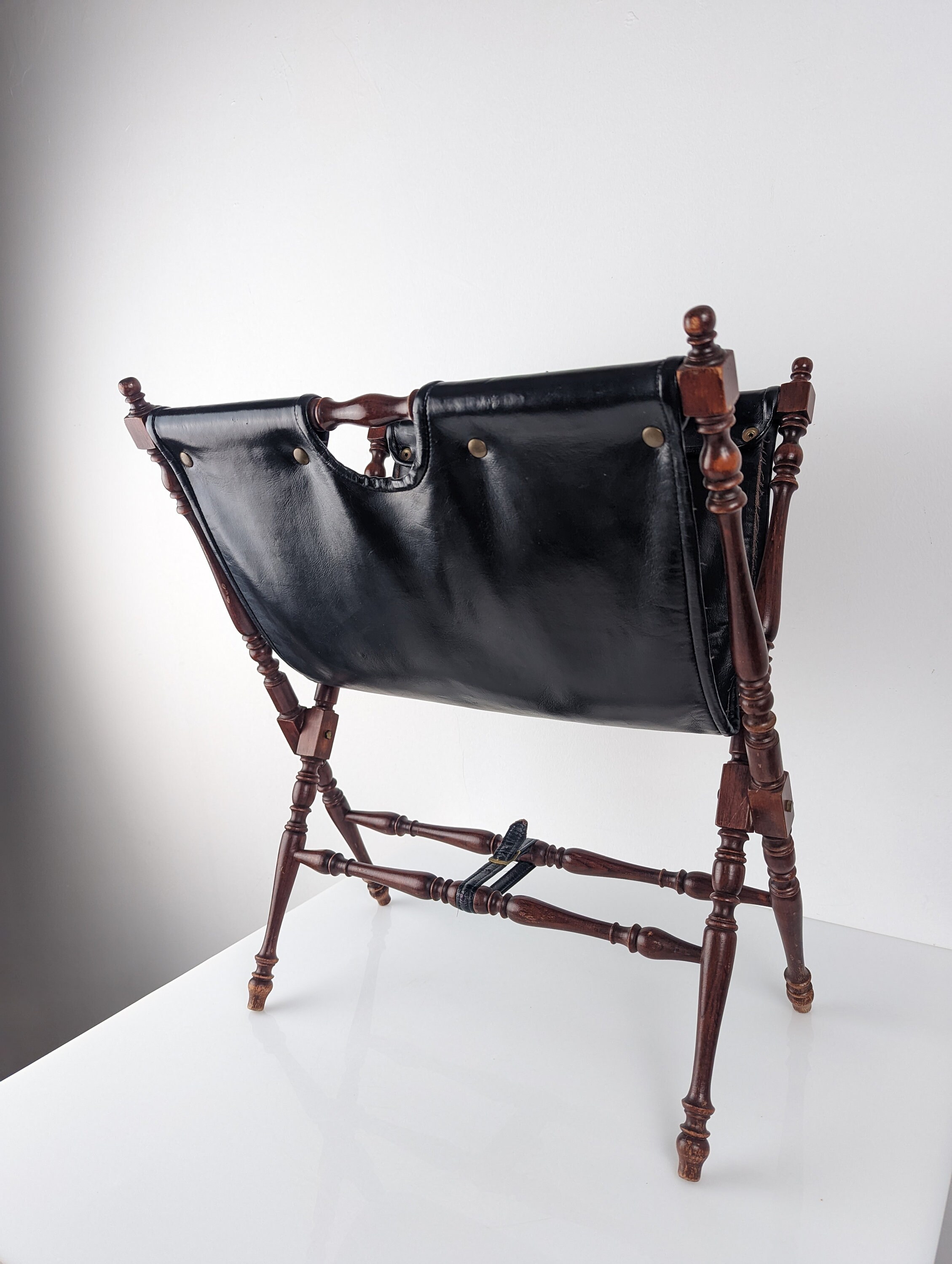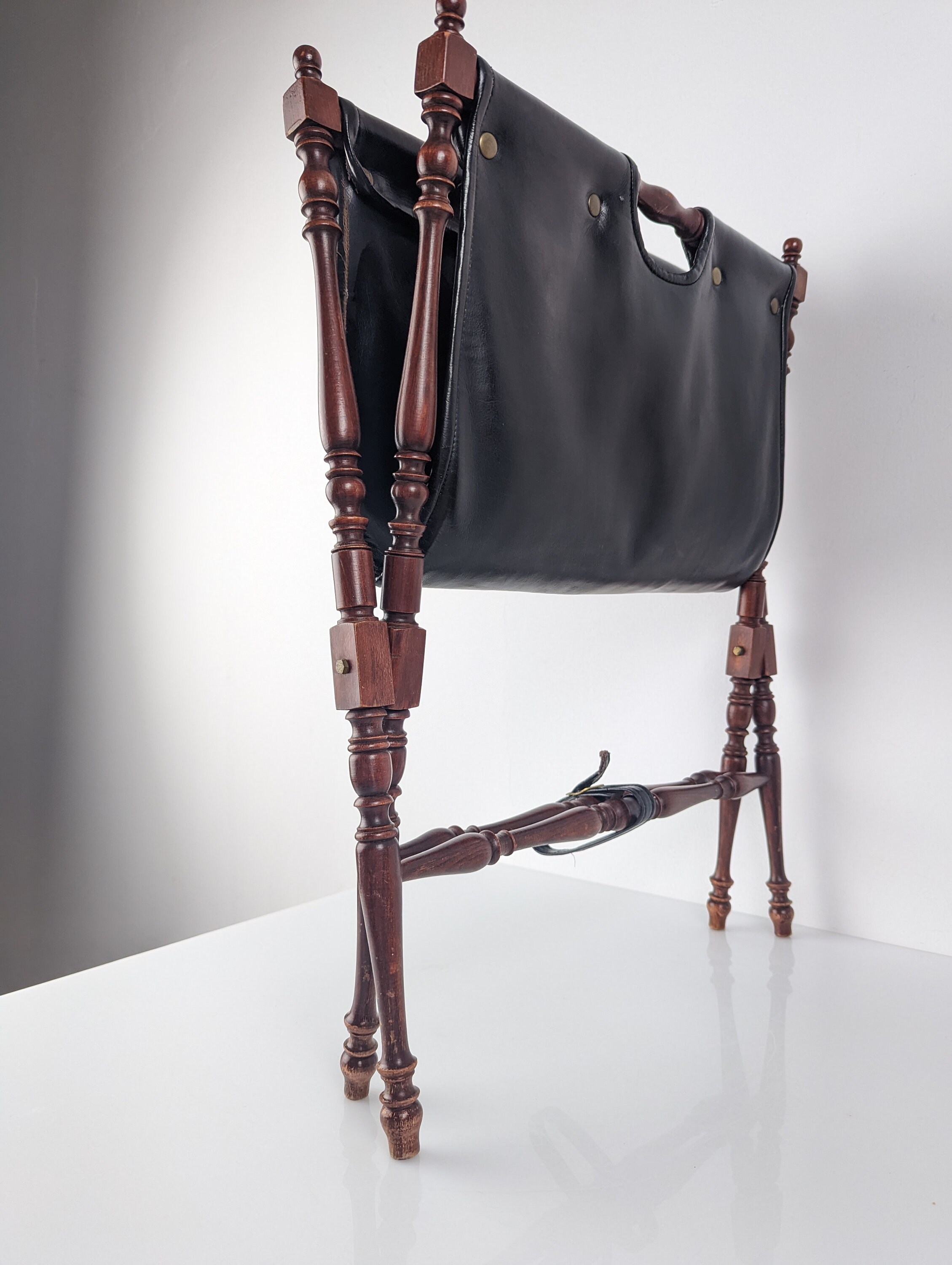 Elegante revistero realizado en madera con detalles torneados y un distinguido cuero negro que realza esta pieza de refinado gusto.
