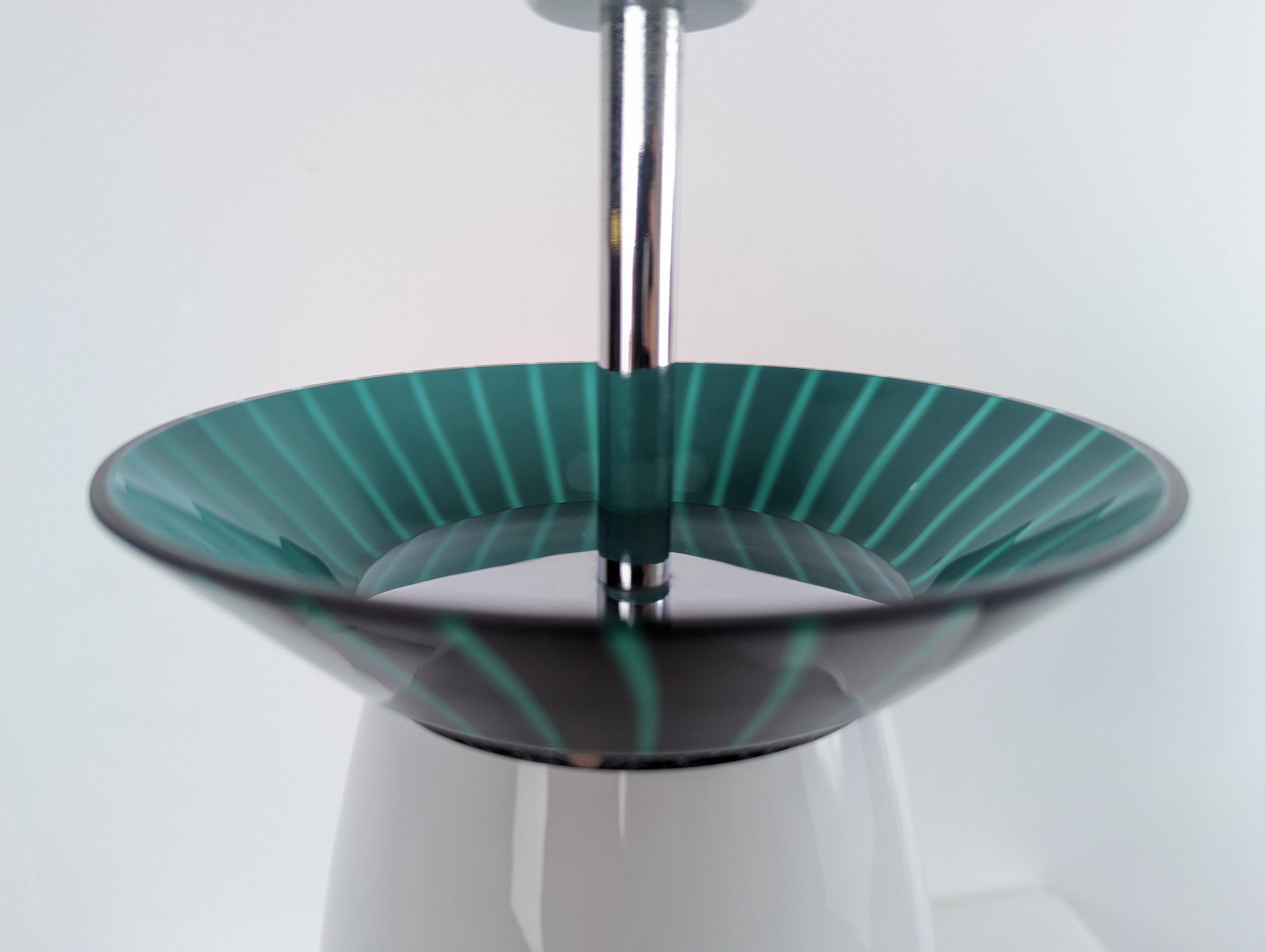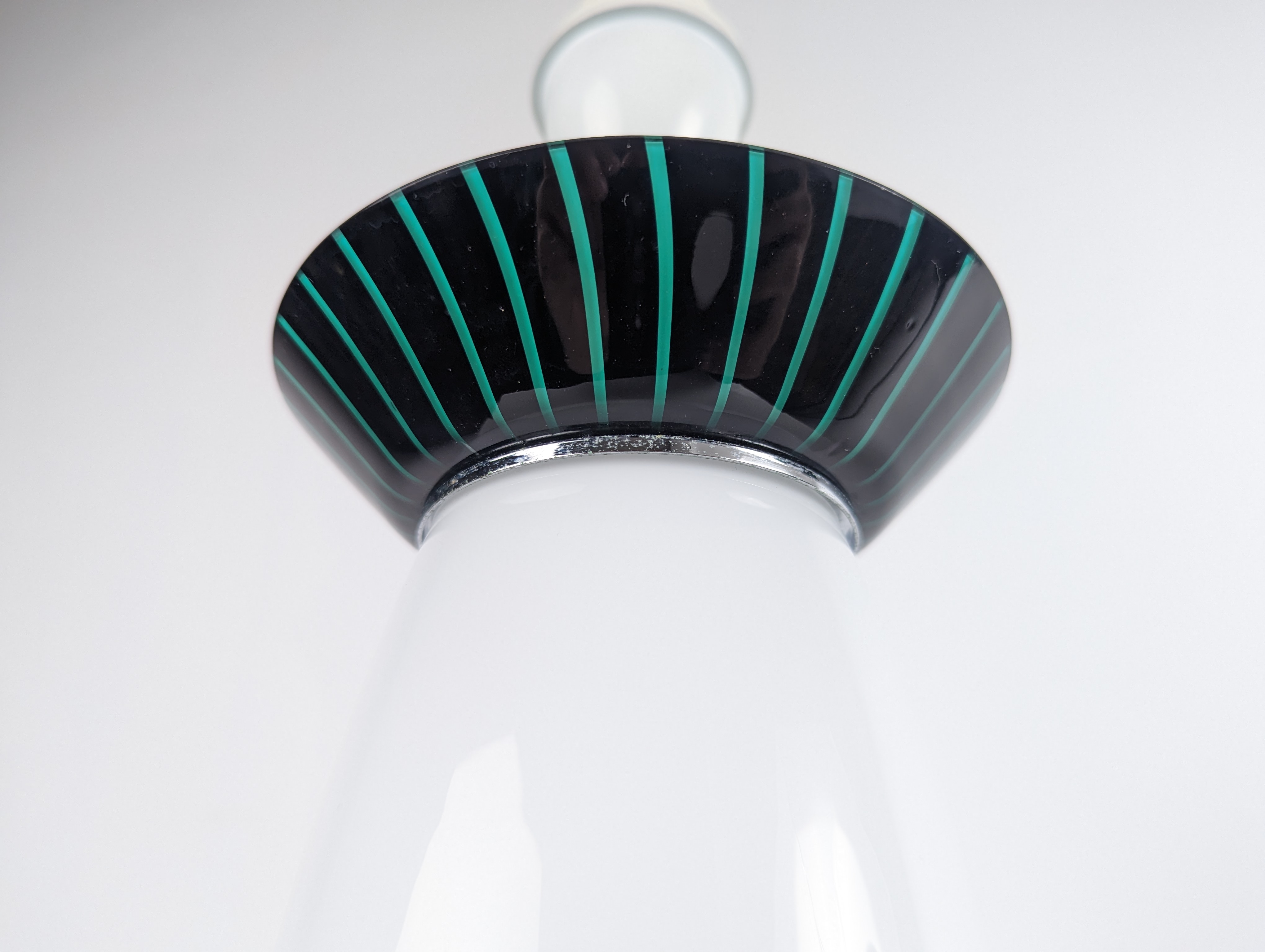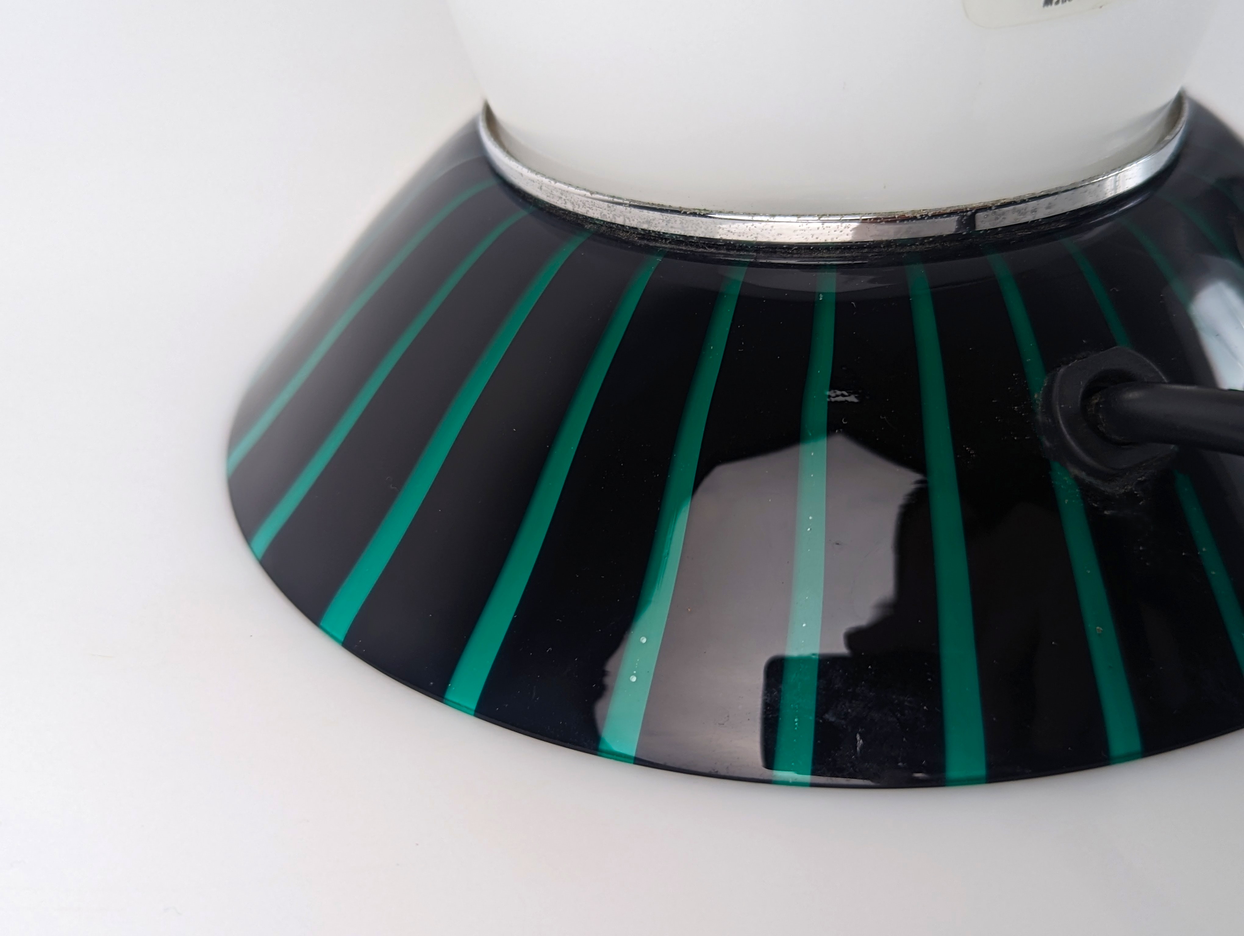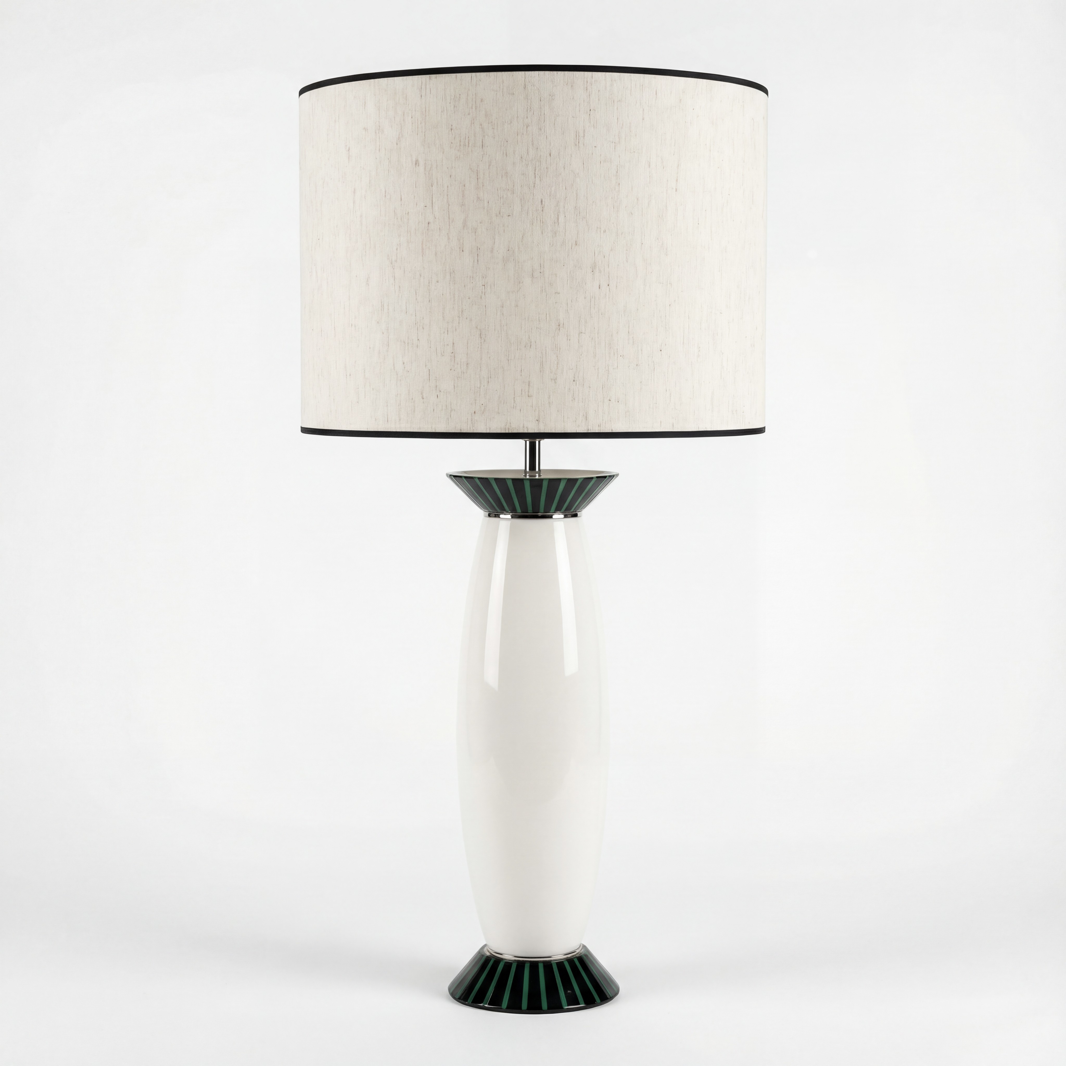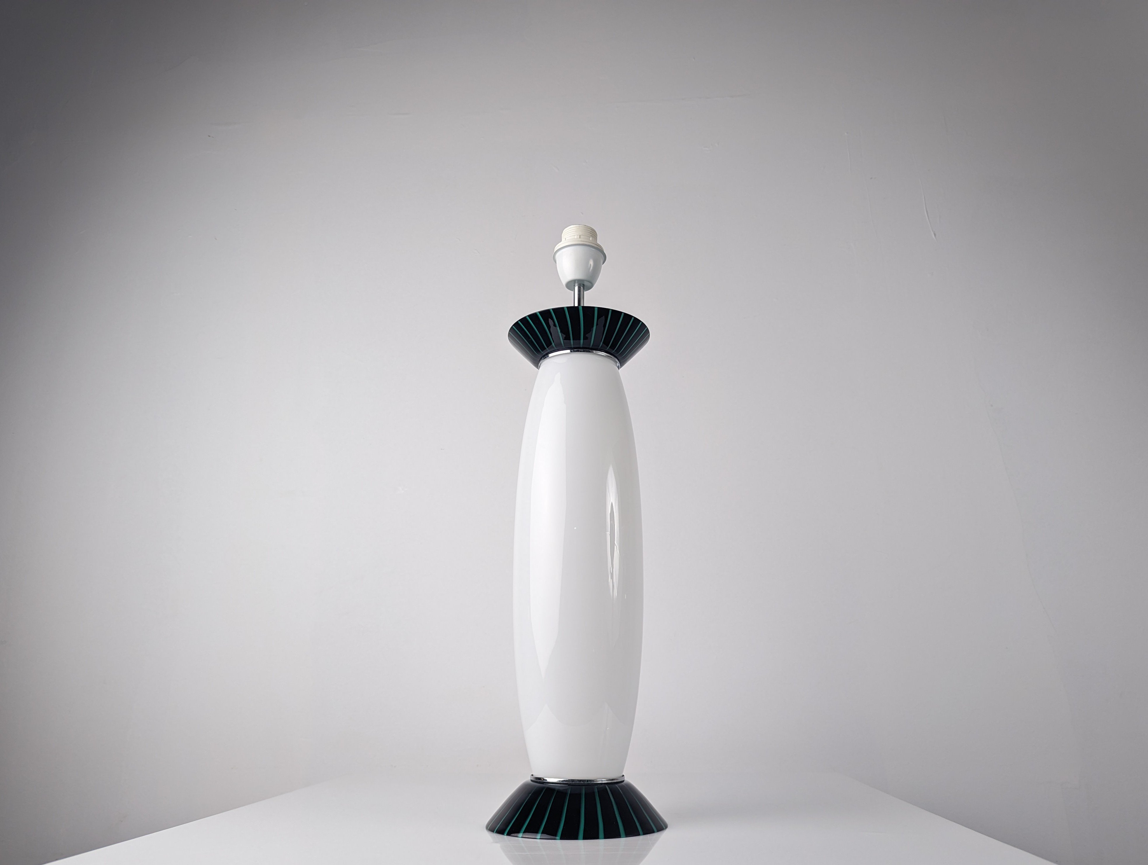 Manufactured by the Italian firm VeArt during the 1980s, this table lamp features a clean vertical silhouette crafted in Murano glass. The design is defined by a white opaline body contrasted by discreet striped glass collars at the base and neck, details that provide structure without altering the simplicity of the form. VeArt, founded in 1965 by Ludovico Diaz de Santillana —former artistic director of Venini—, was established to merge traditional glassmaking with modern production standards, focusing on geometric integrity. The glass quality ensures a uniform and soft light distribution, making it a versatile functional piece for both residential spaces and professional offices. Electrification will be adapted for US usage free of charge upon request.